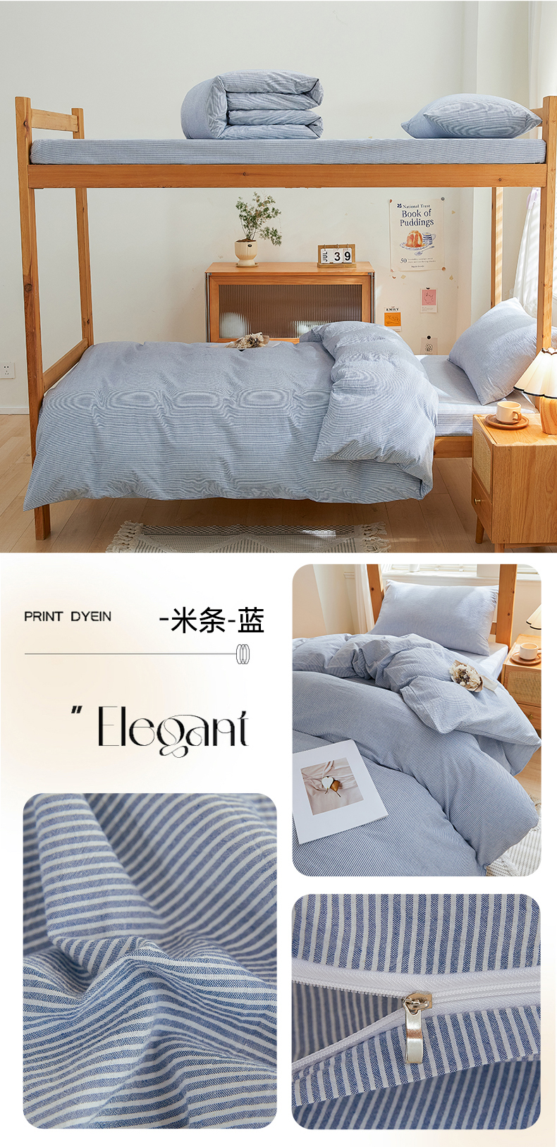 商品名称:棉小二 2024新款全棉水洗棉学生宿舍三四件套 米条-雾蓝