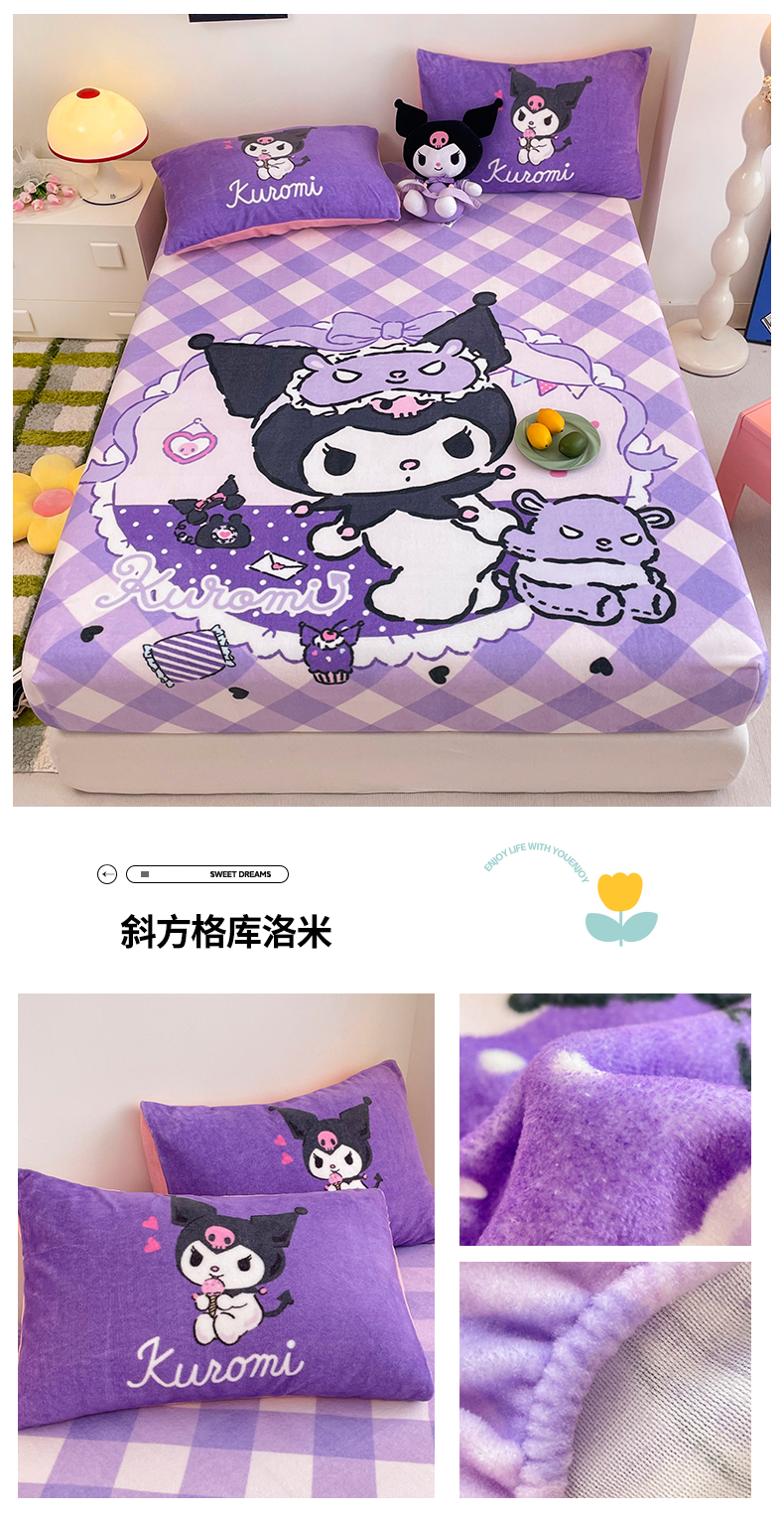 米帛家纺 2024新款A类三丽鸥卡通床笠单件床罩冬季加厚牛奶绒床垫保护罩全包床单套 斜方格库洛米