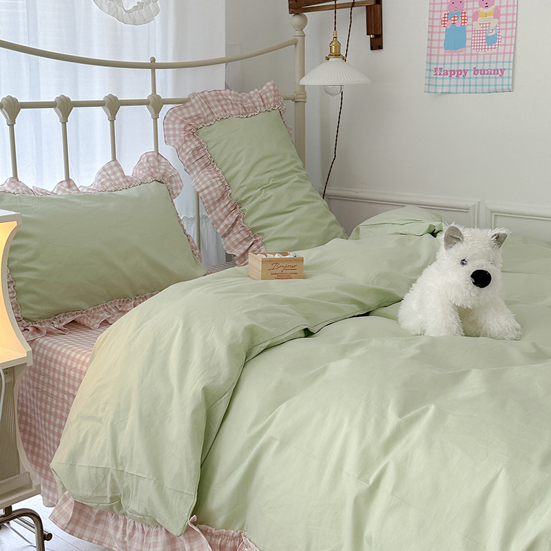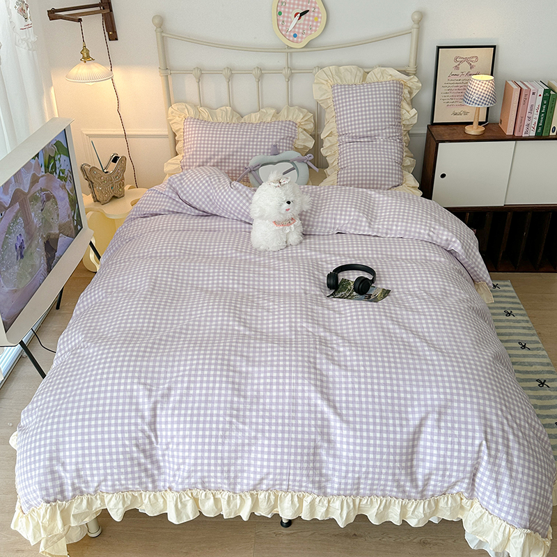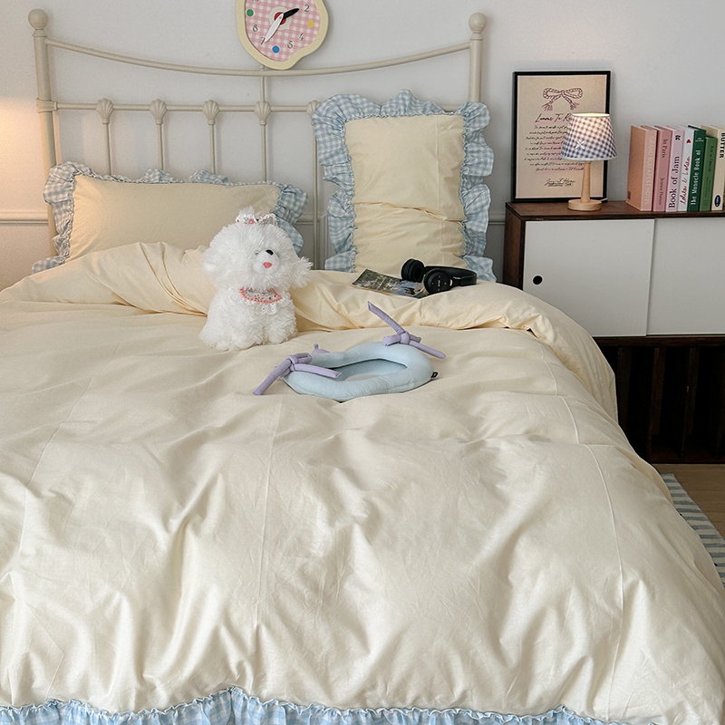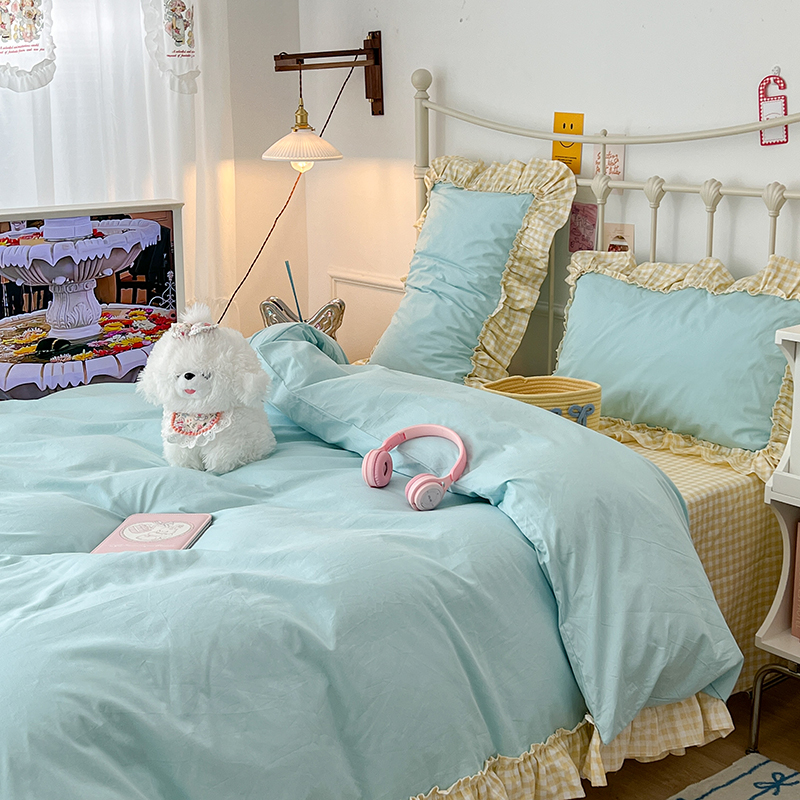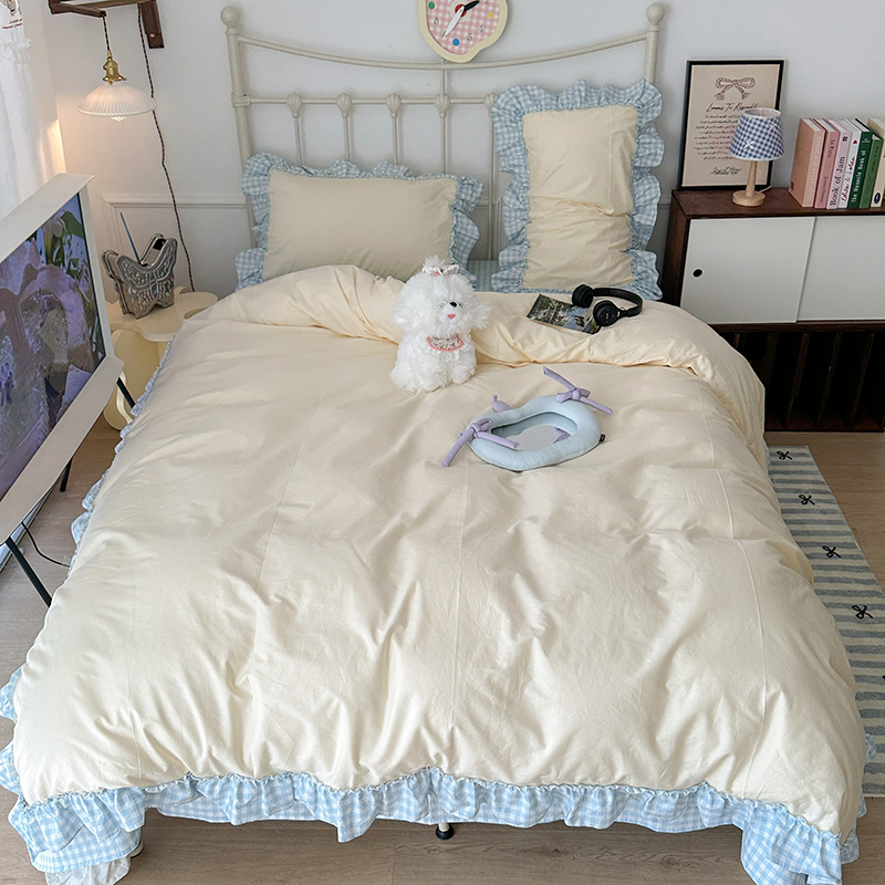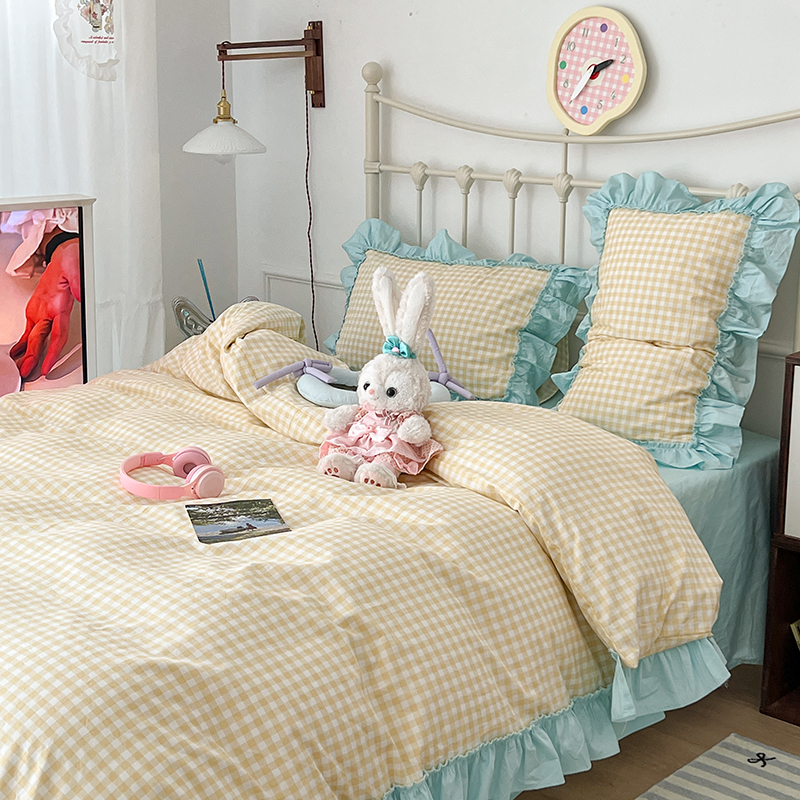 2024新款花边奶油格子全棉混搭款四件套 柠檬黄格