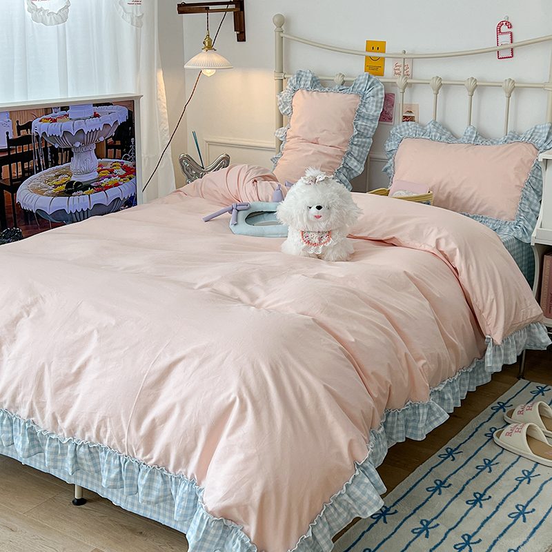 商品名称:2024新款花边奶油格子全棉混搭款四件套 柠檬黄格