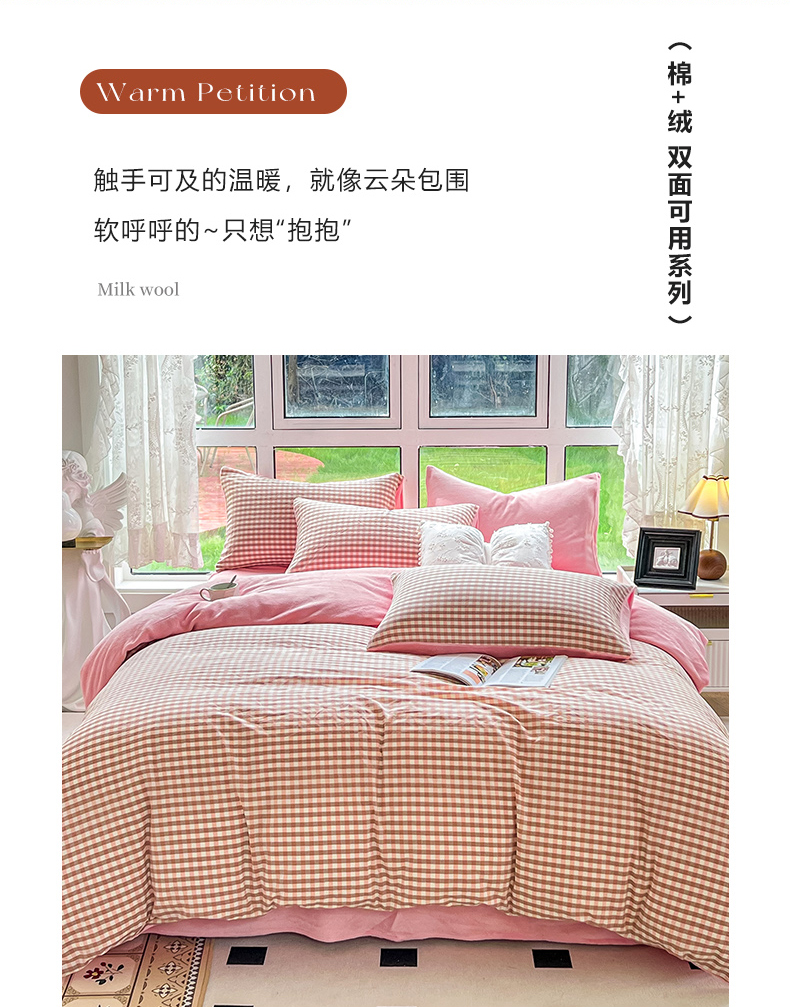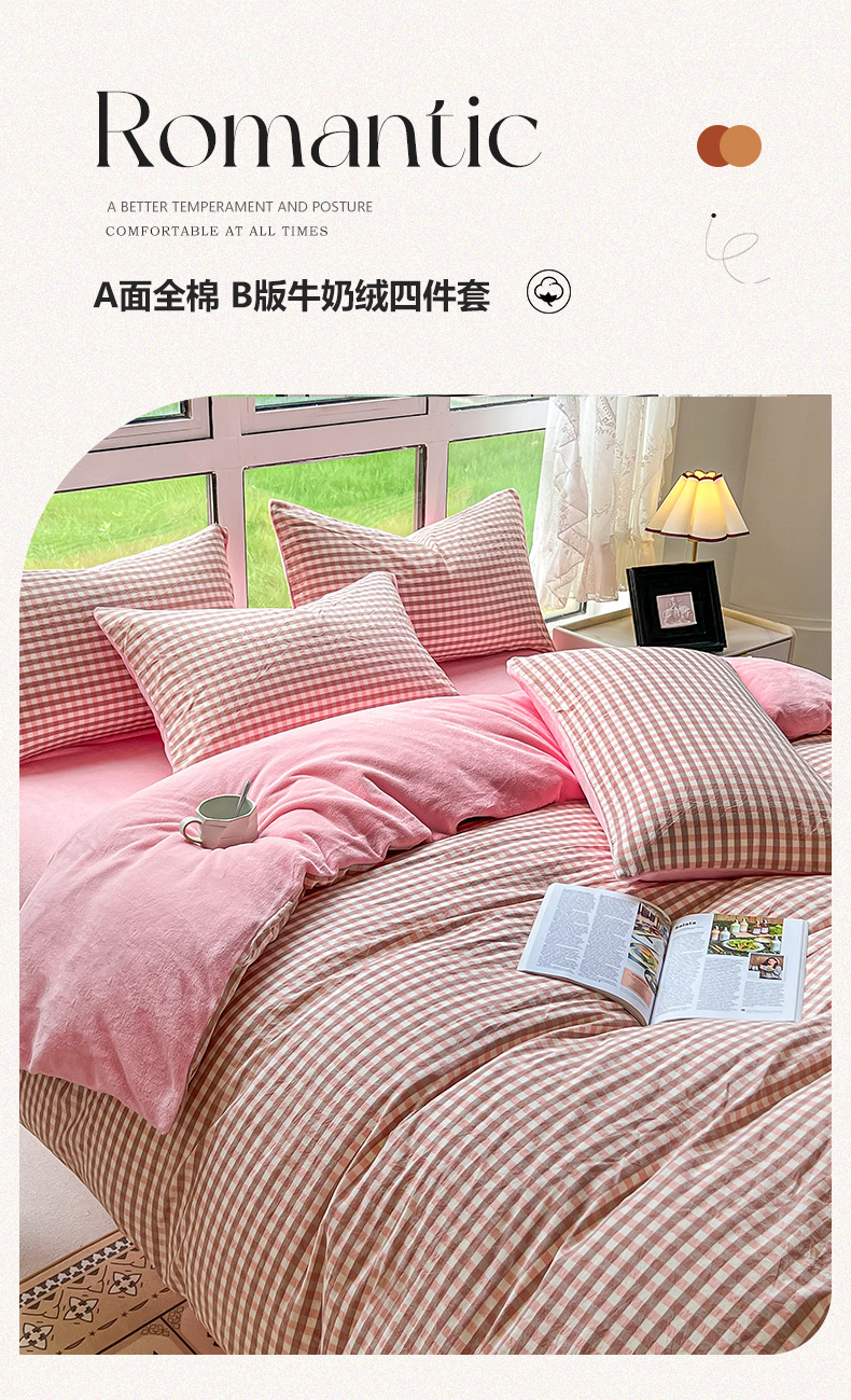 当前位置: 91家纺网 > 商品网购 > 床品套件 > 四件套 > 牛奶绒四件套 > 2024最新无印良品风双拼全棉色织水洗棉加牛奶绒四件套简约全棉拼牛奶绒 棉+绒-蜜粉小格