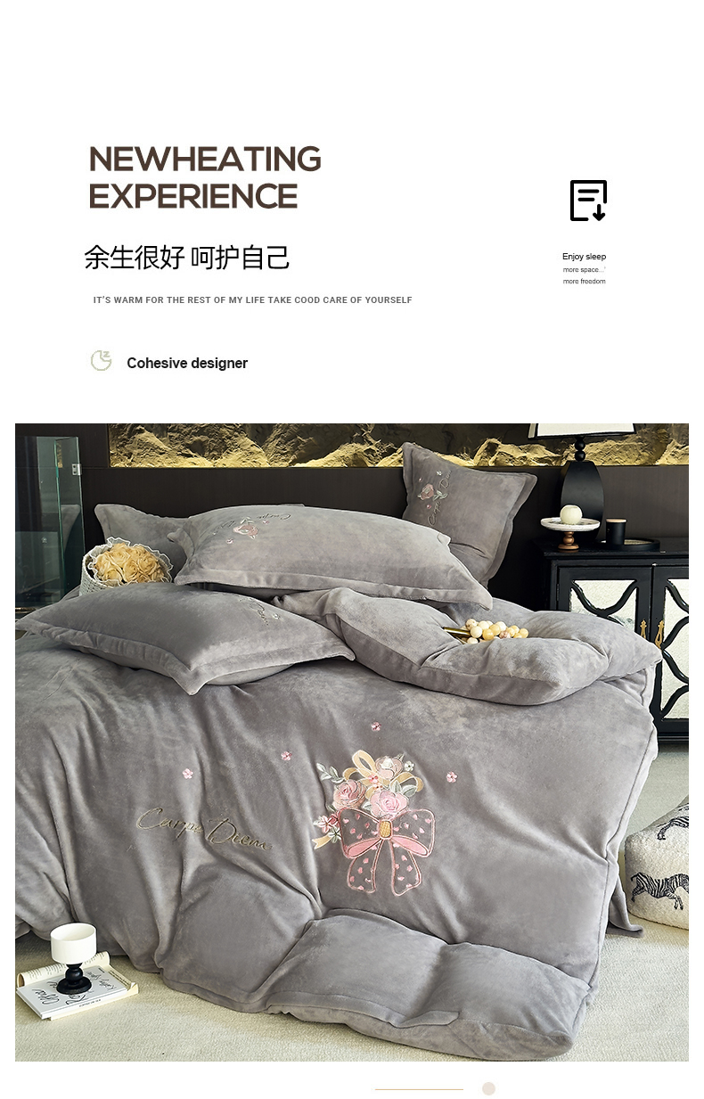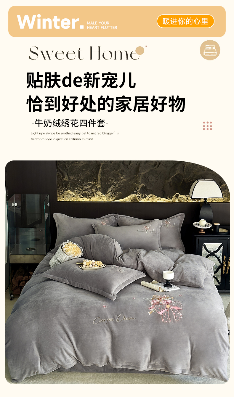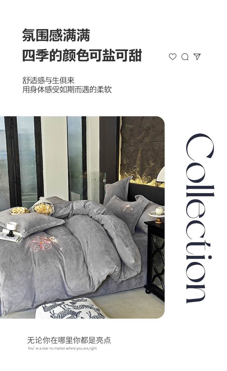 梦莱斯 2024新款牛奶绒绣花四件套 灰色