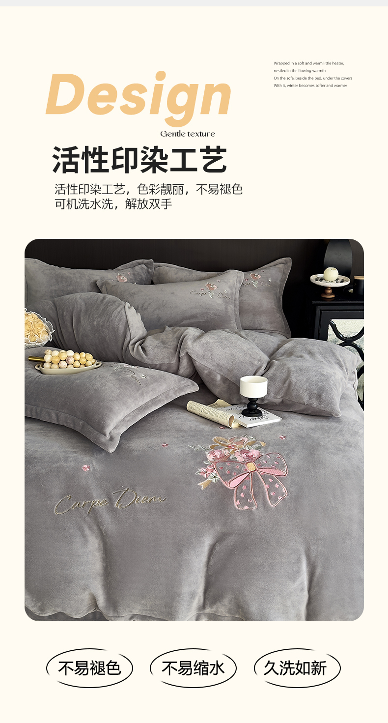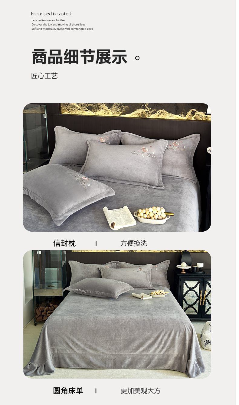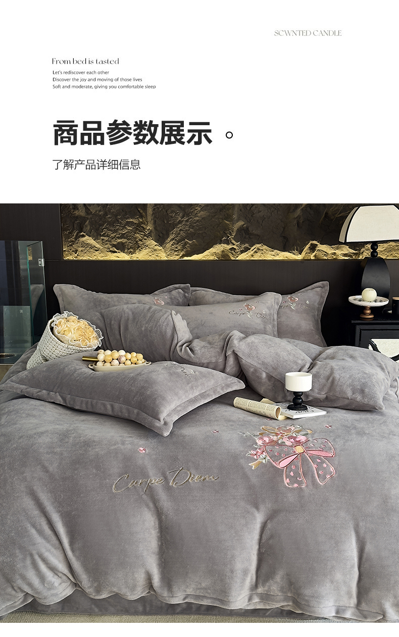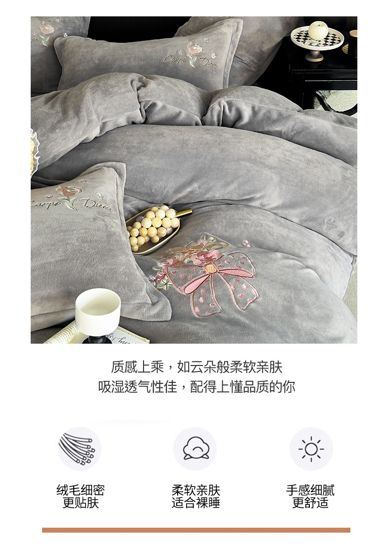 商品名称:梦莱斯 2024新款牛奶绒绣花四件套 灰色