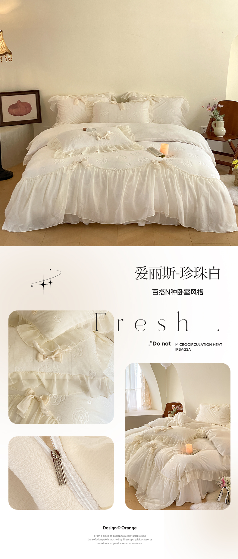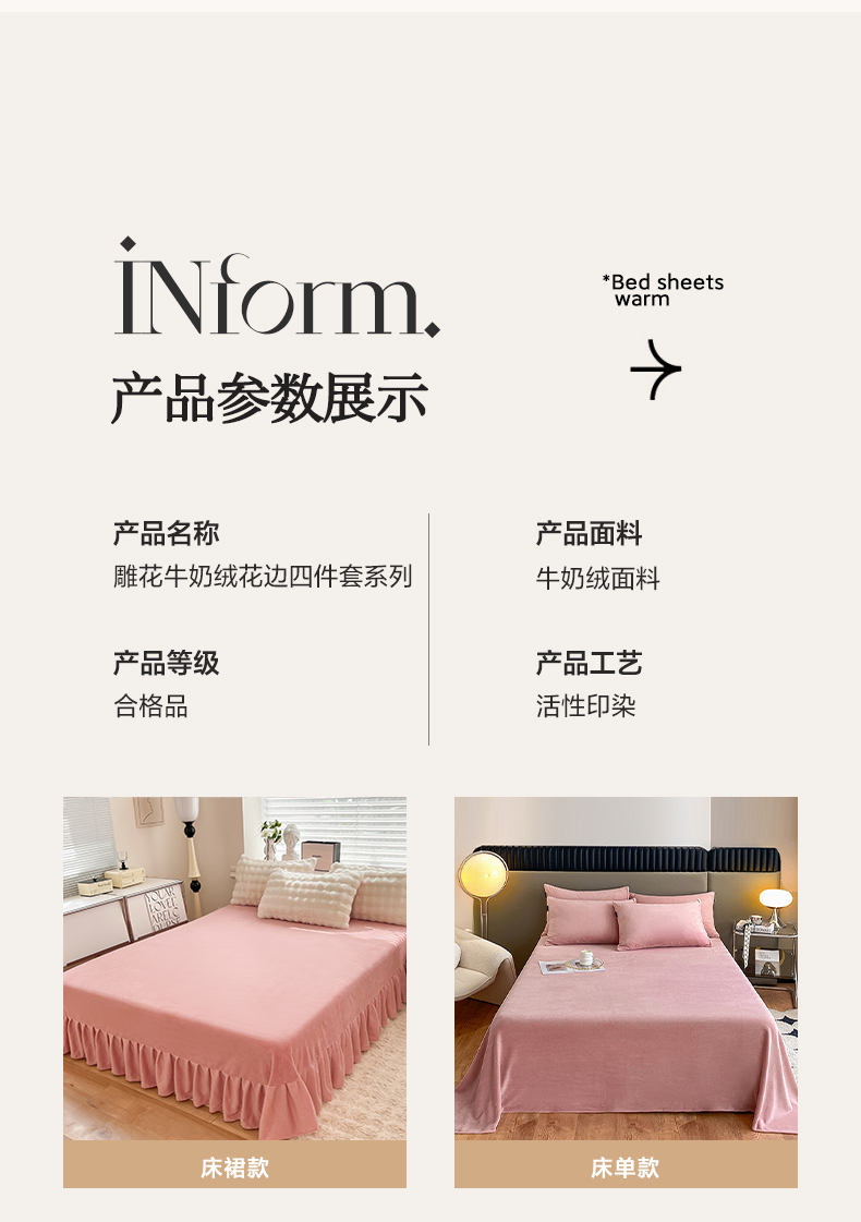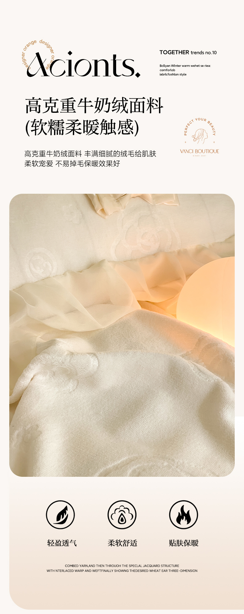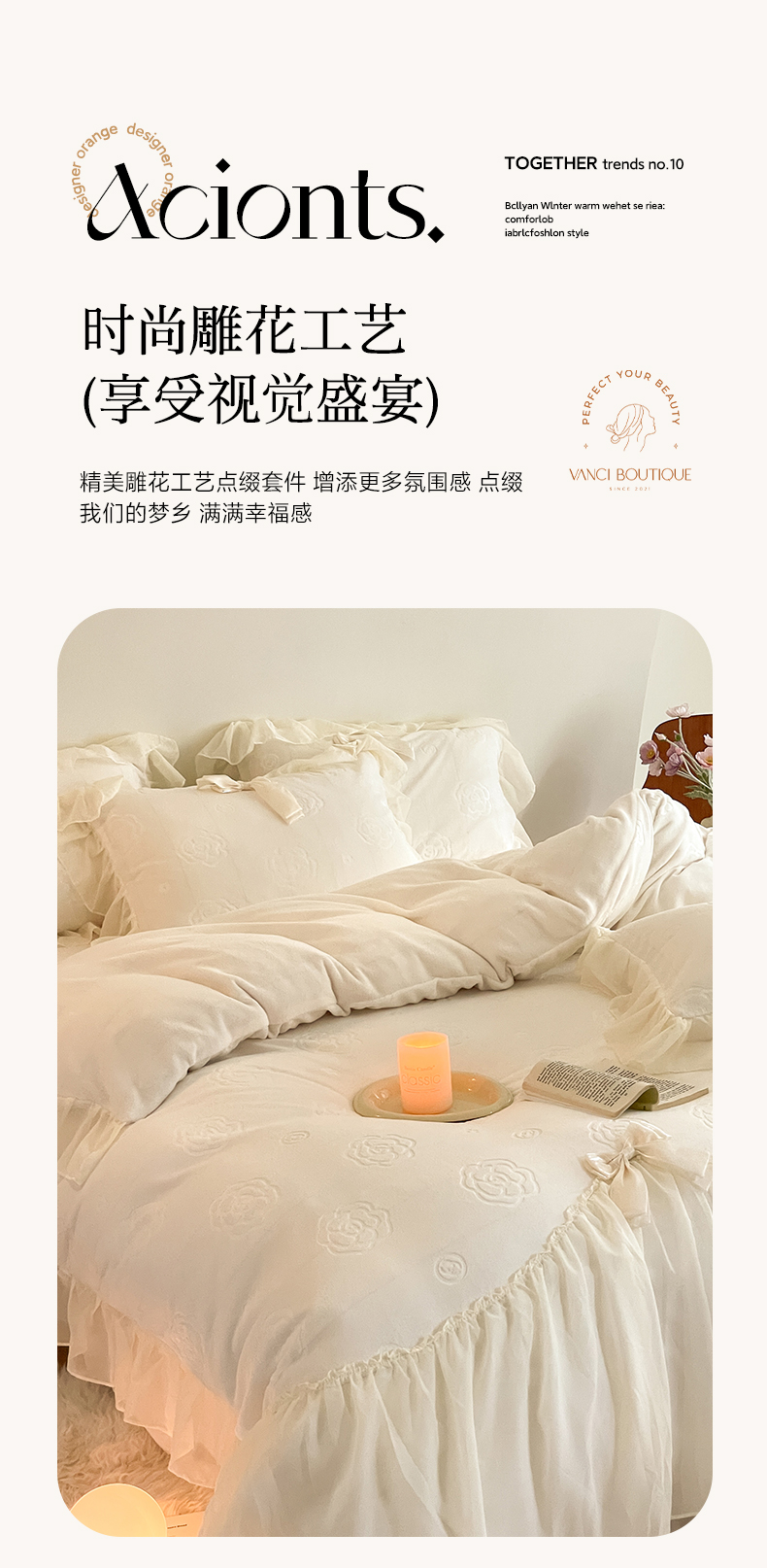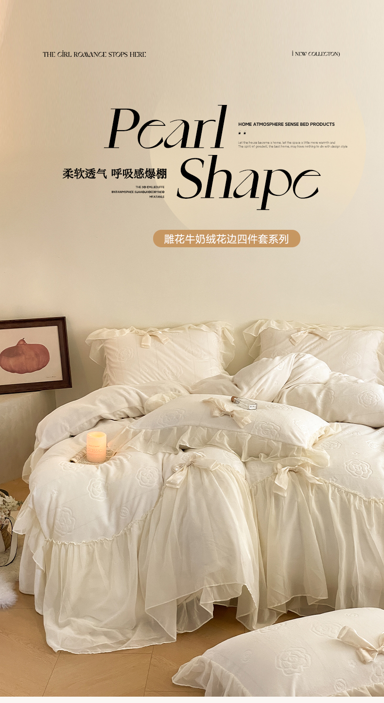 当前位置: 91家纺网 > 商品网购 > 床品套件 > 四件套 > 牛奶绒四件套 > 逸尚阁 2024新款雕花牛奶绒花边四件套-爱丽斯 爱丽斯-珍珠白