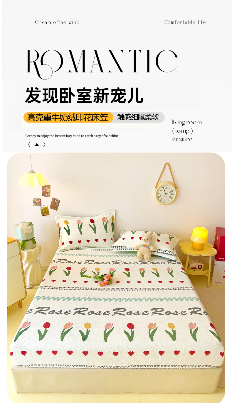 商品名称:大柏树 2025新款A类高克重亲肤舒适牛奶绒印花四件套-单床笠可定制 寻彩