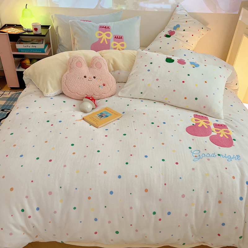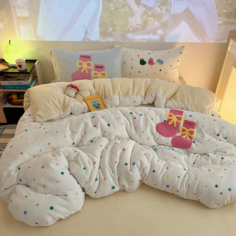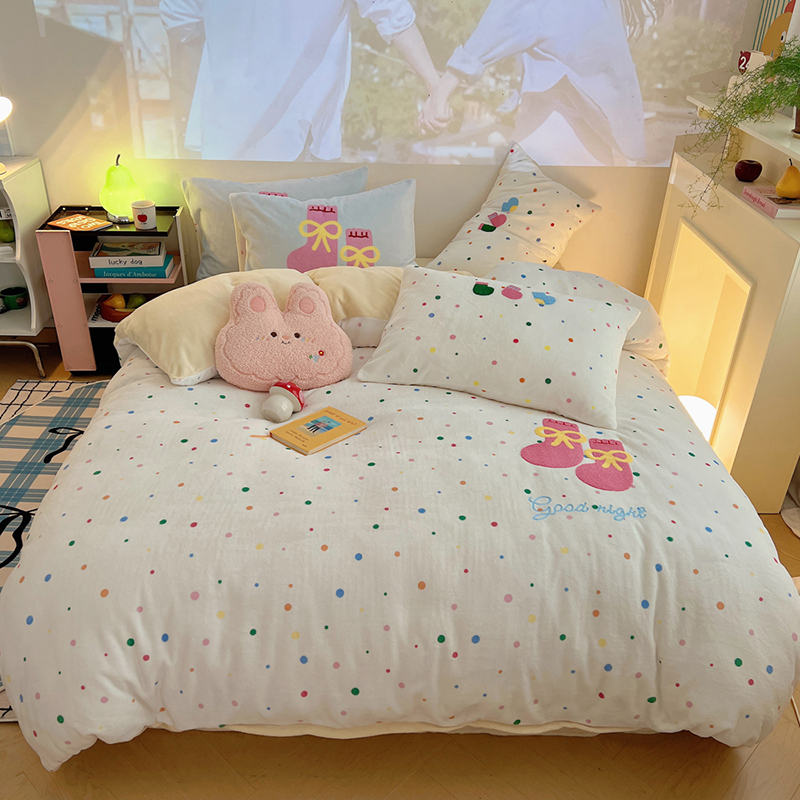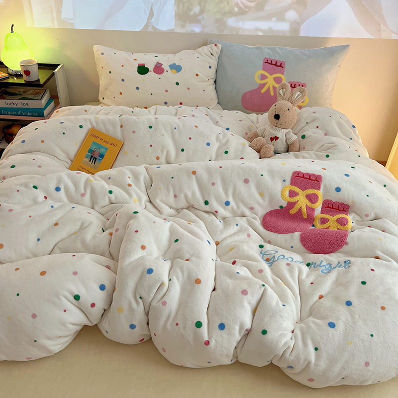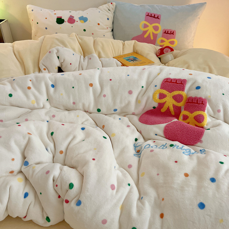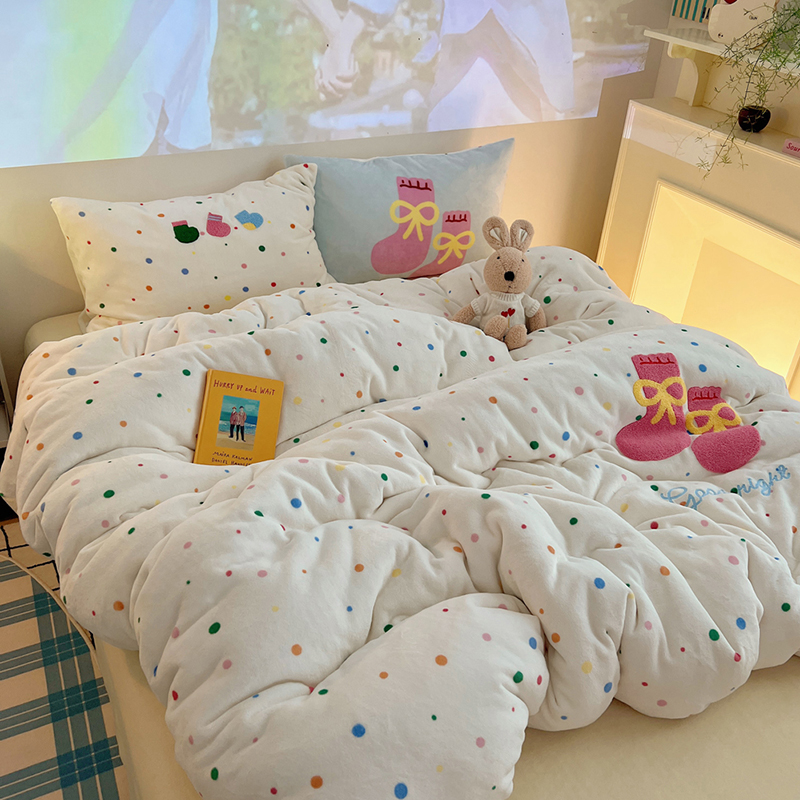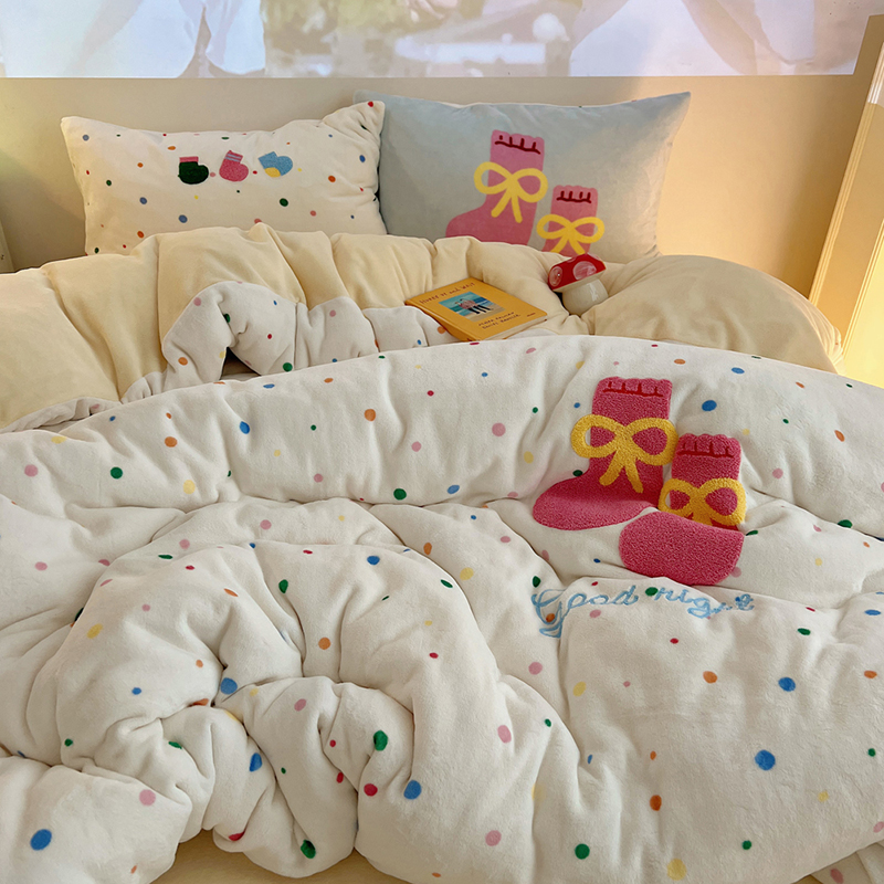 商品名称:桃喜 2024新款230g牛奶绒绣花系列四件套 彩色波点袜