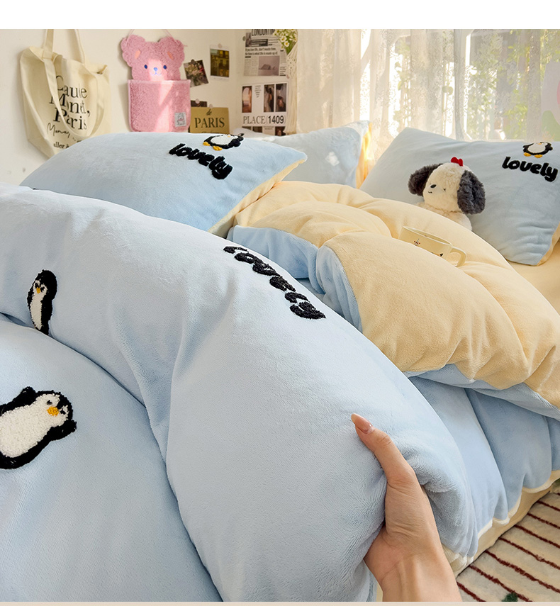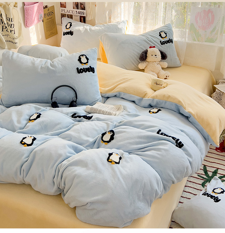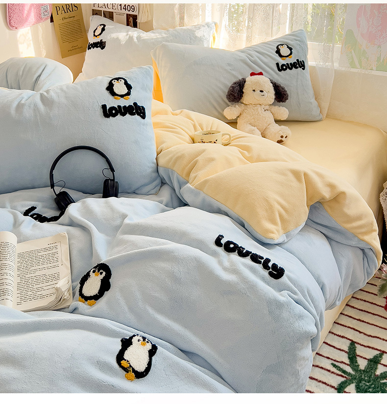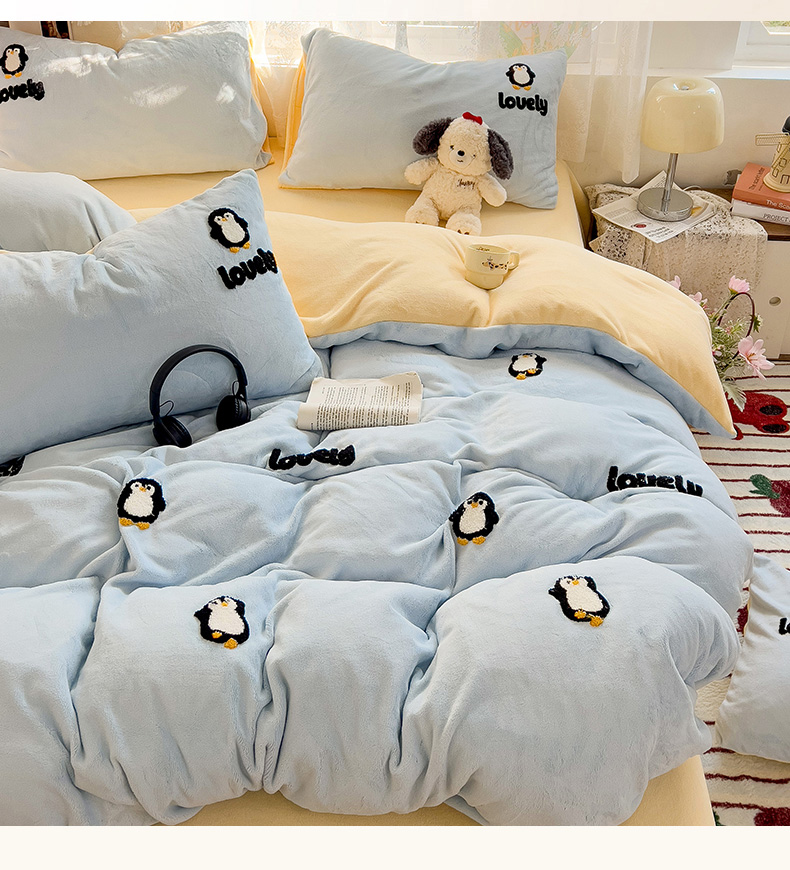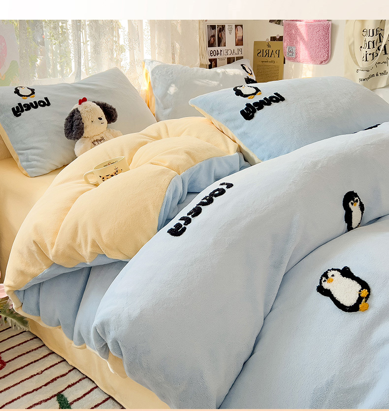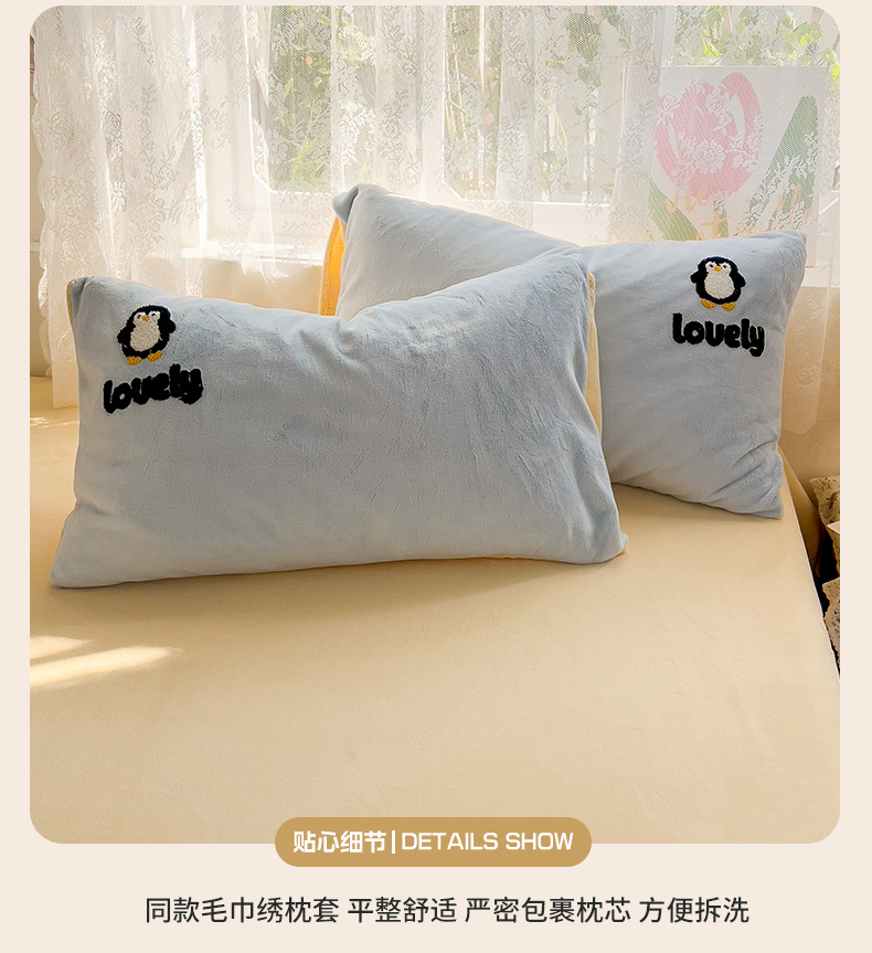 当前位置: 91家纺网 > 商品网购 > 床品套件 > 四件套 > 牛奶绒四件套 > 眠帛家居 2024高克重牛奶绒卡通毛巾绣系列 企鹅