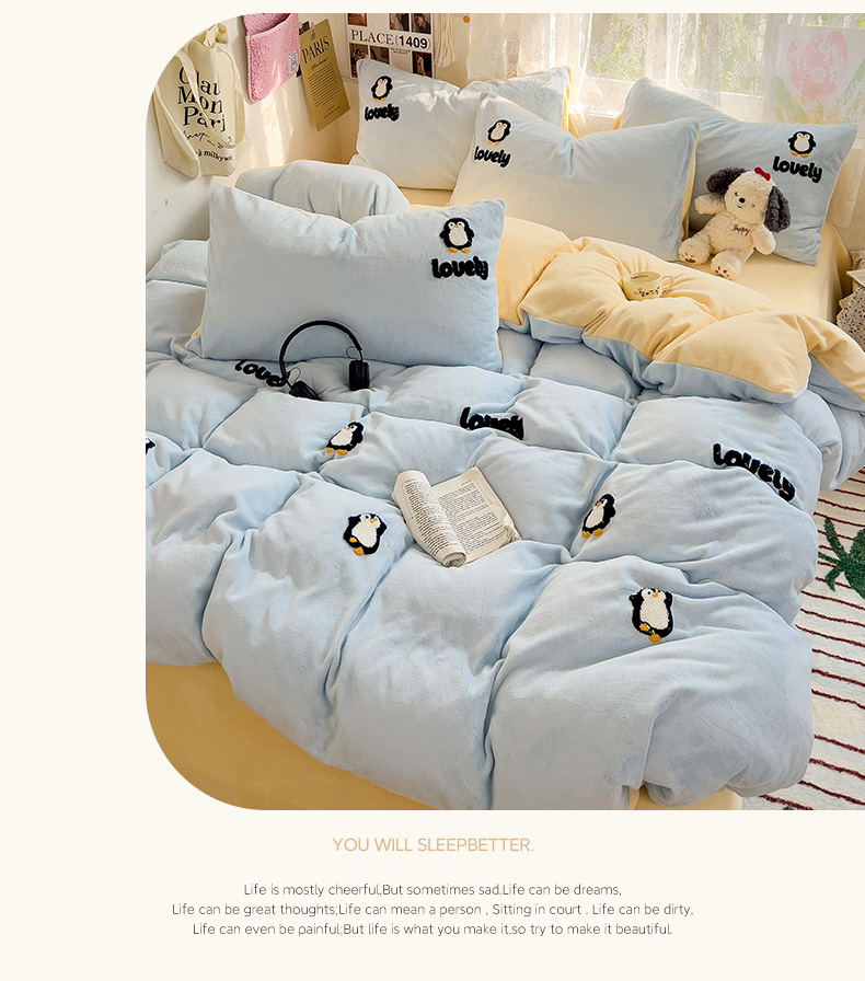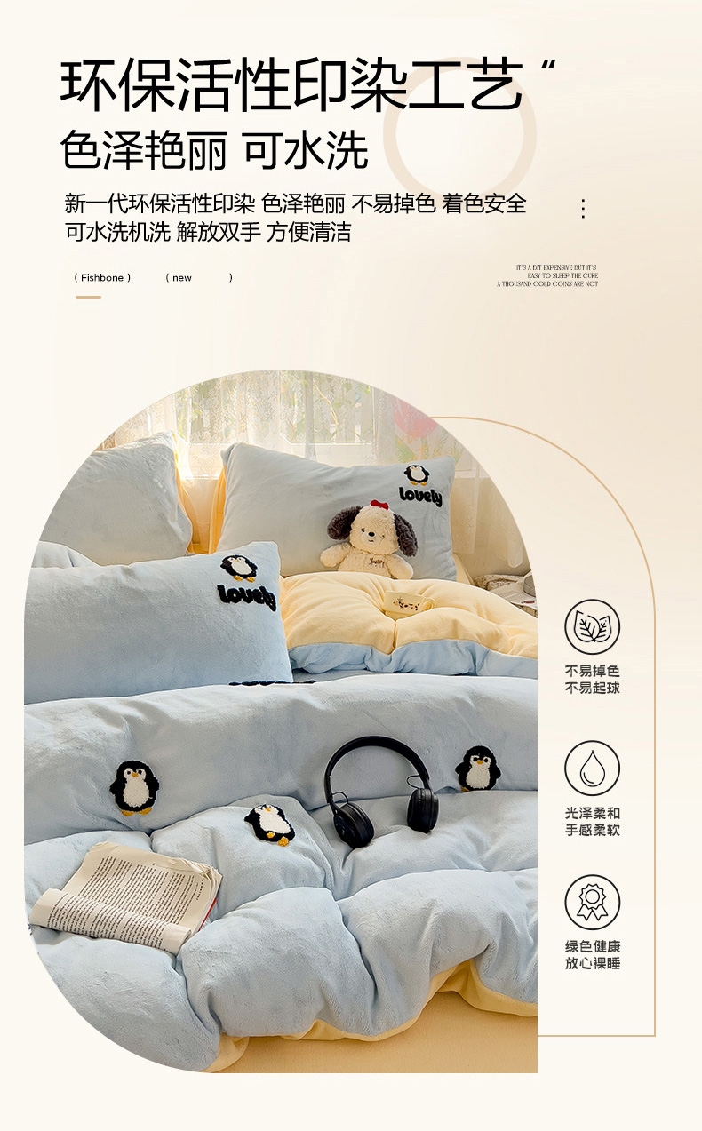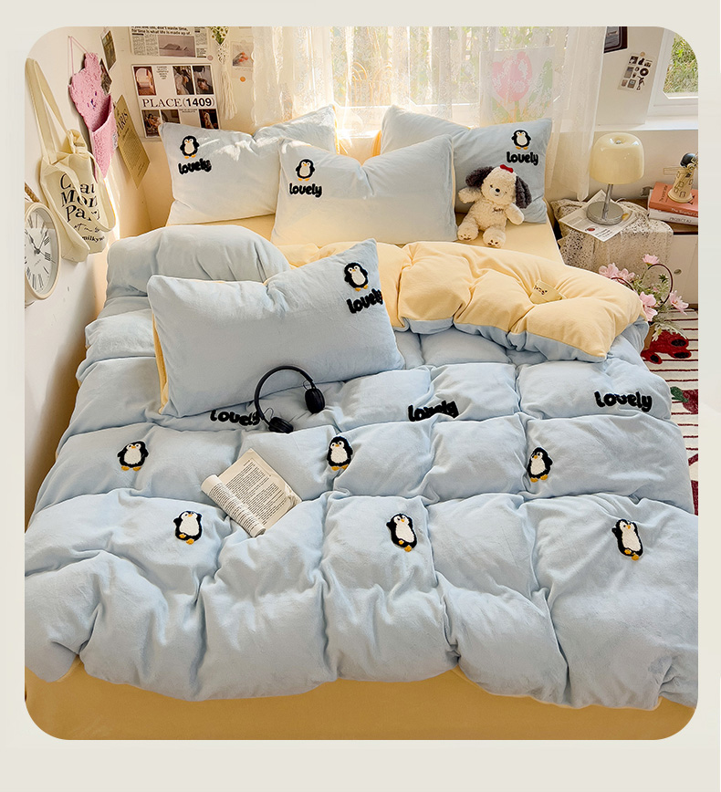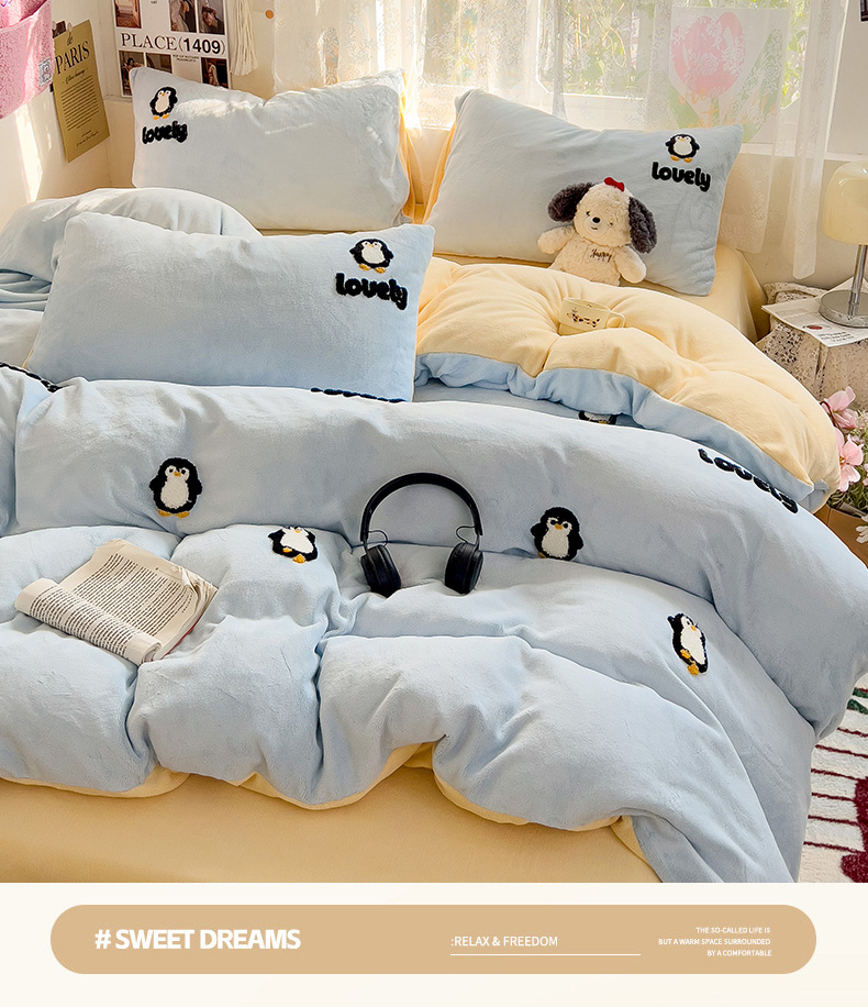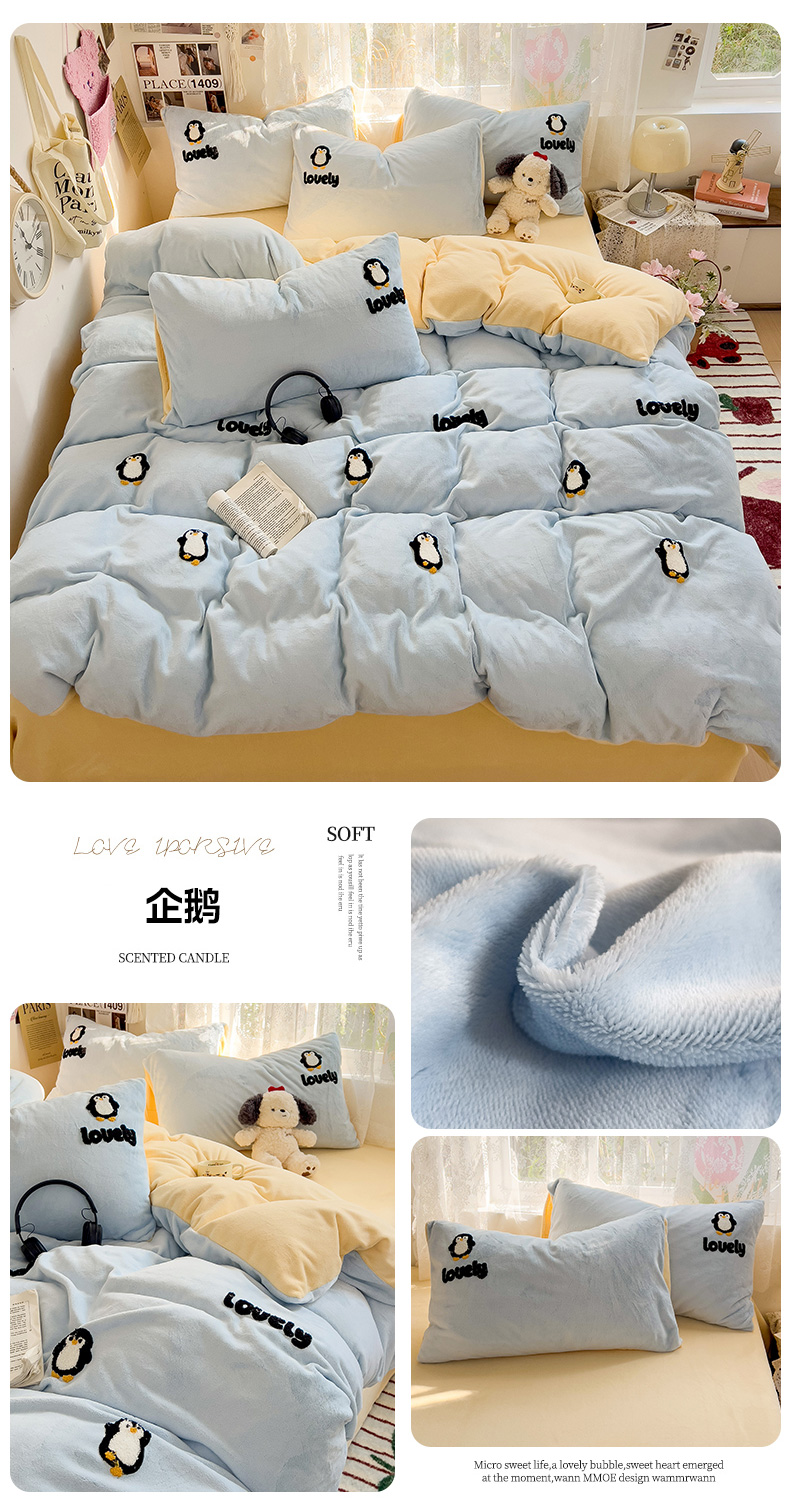 当前位置: 91家纺网 > 商品网购 > 床品套件 > 四件套 > 牛奶绒四件套 > 眠帛家居 2024高克重牛奶绒卡通毛巾绣系列 企鹅