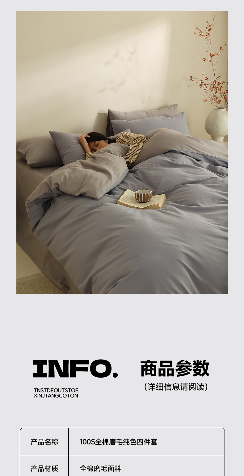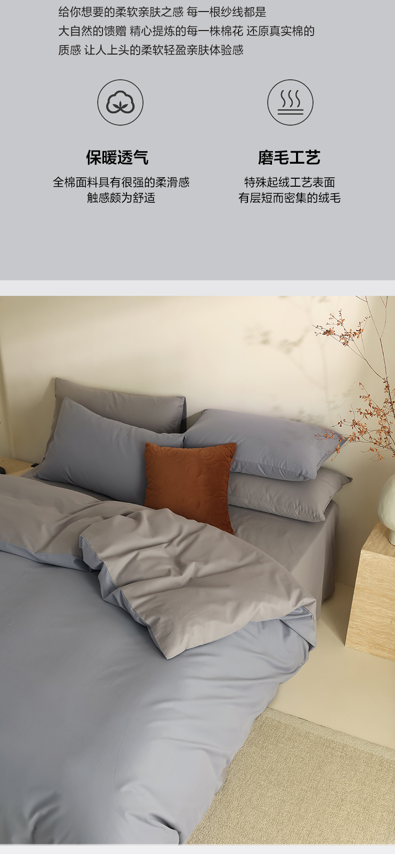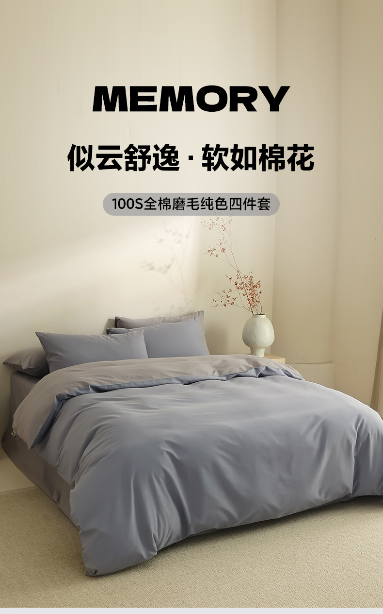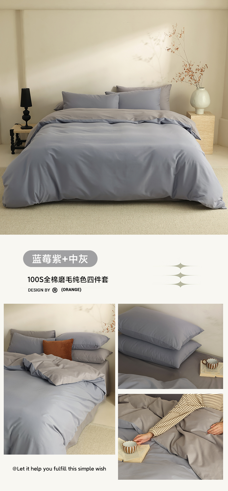 当前位置: 91家纺网 > 商品网购 > 床品套件 > 四件套 > 长绒棉四件套 > 轩和家居 2024新款50S长绒棉磨毛四件套(控价:179 、229 、249 床笠+10元) 蓝莓紫+中灰
