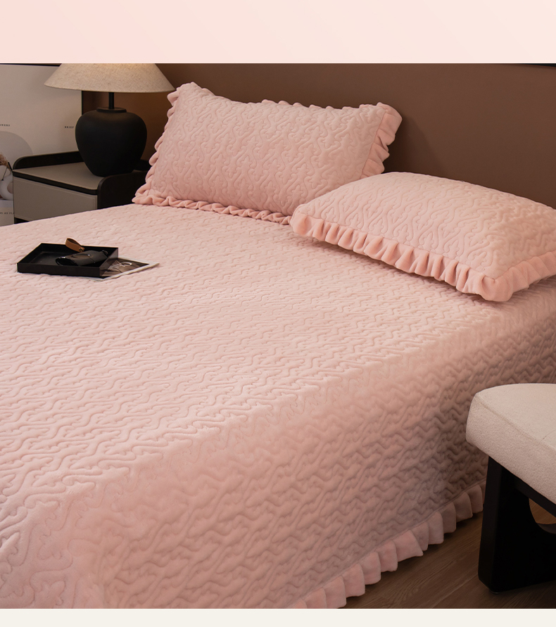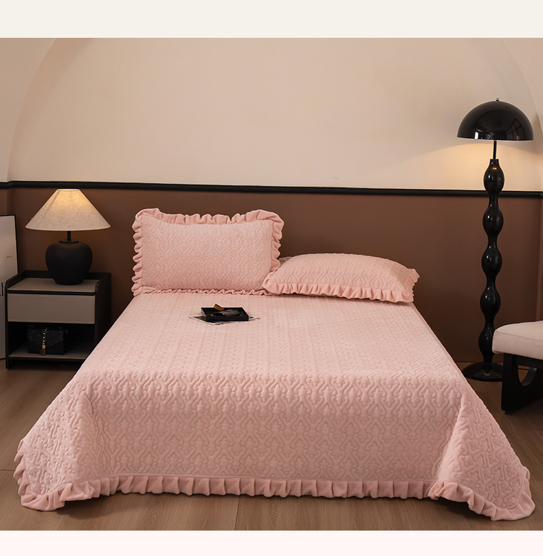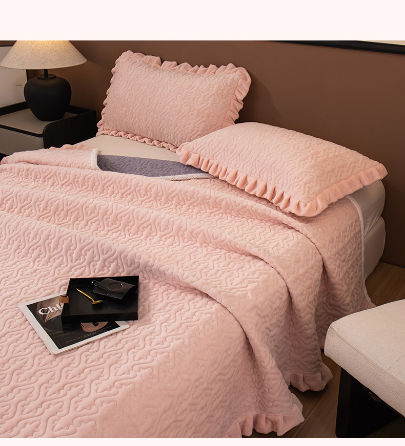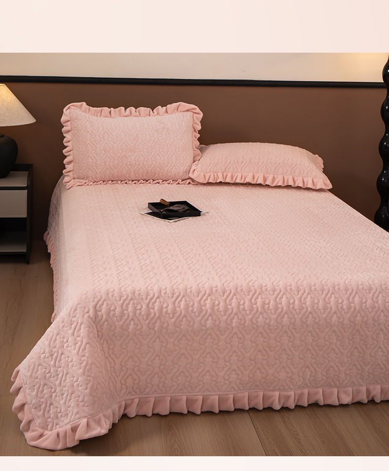 2025新款230克牛奶绒加厚床盖 花边款-樱花粉