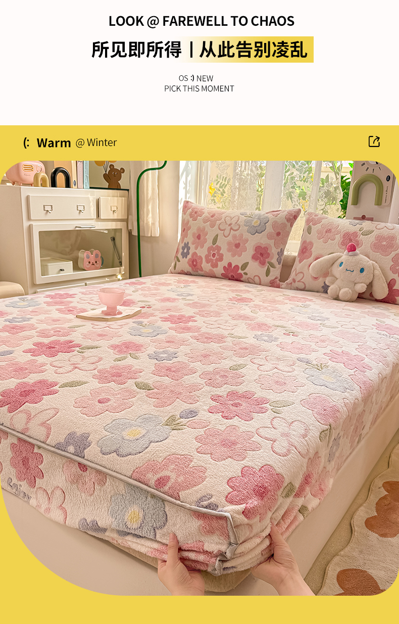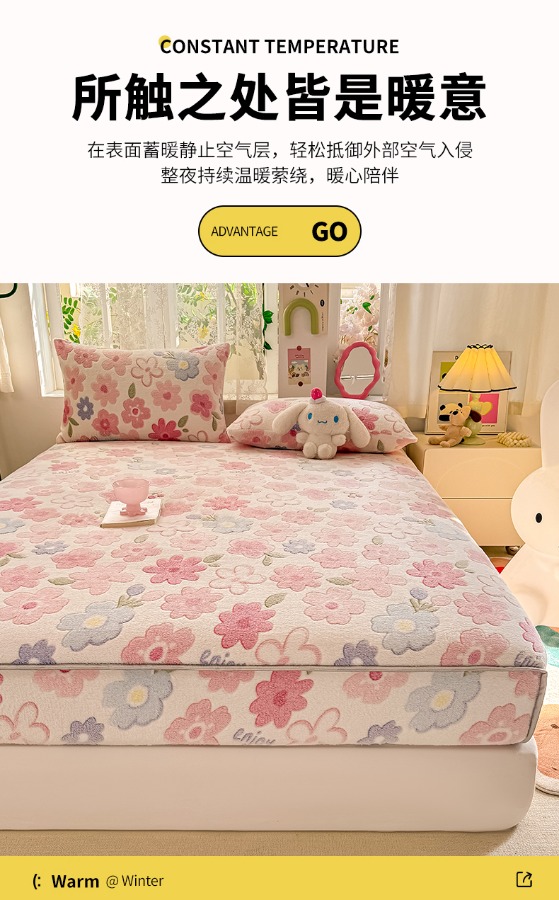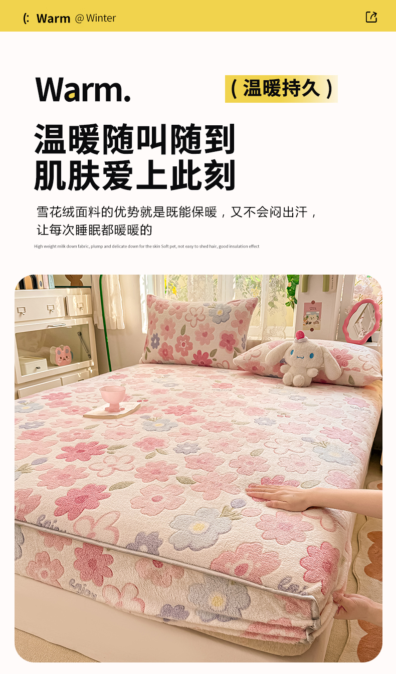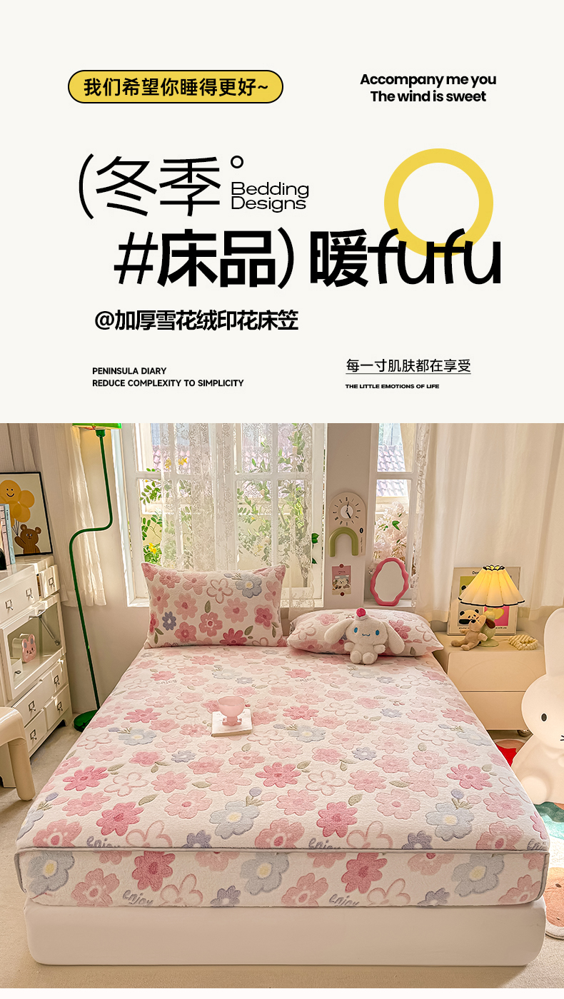 悦织湾家纺 2025新款加厚雪花绒印花床笠保暖牛奶绒床笠跨境专供外贸出口电商直播热销款 雪花绒床笠-毛毛球