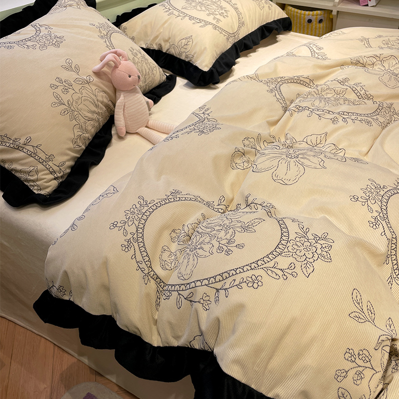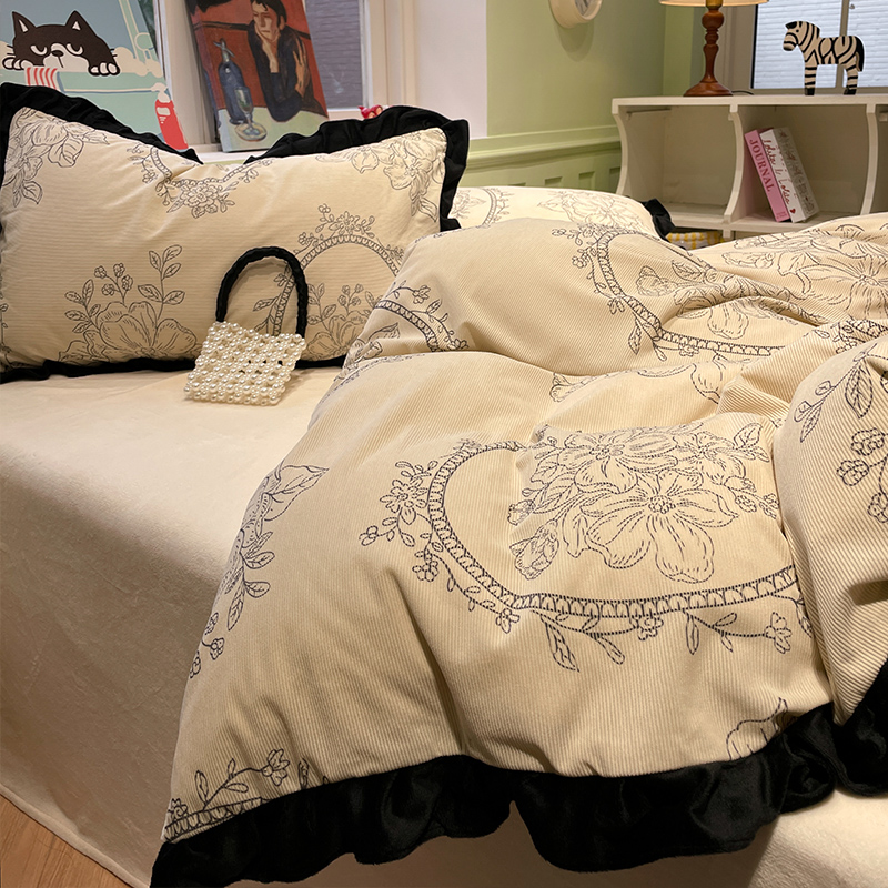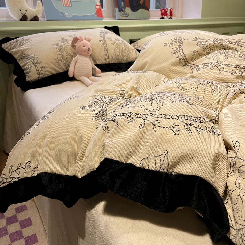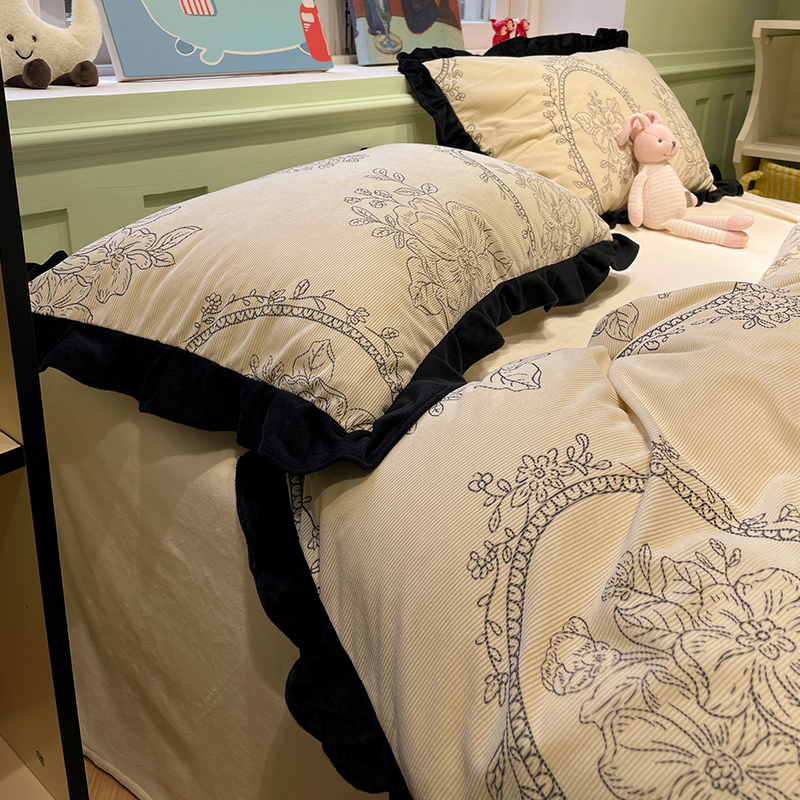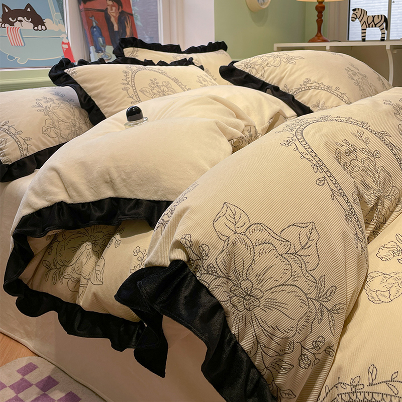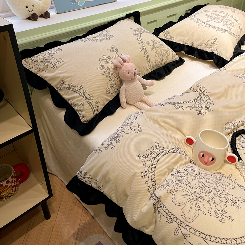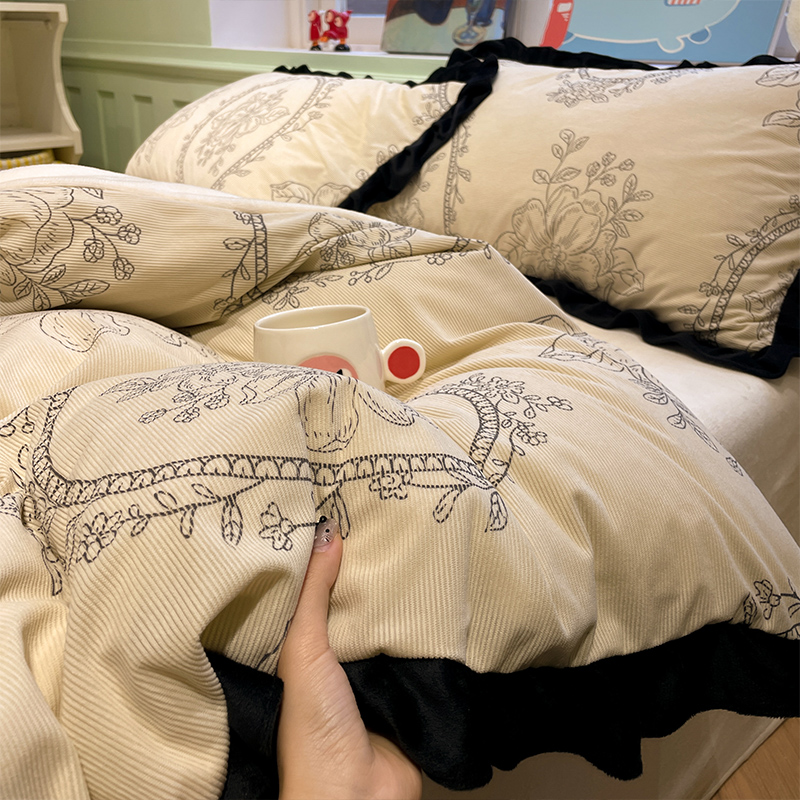 当前位置: 91家纺网 > 商品网购 > 床品套件 > 四件套 > 牛奶绒四件套 > 羚羊语家纺 爆款2024轻法式赫本风灯芯绒四件套小香风提花立体韩版花边牛奶绒三件套珊瑚法莱绒灯芯绒单被套-实拍风 月亮花房-艺境