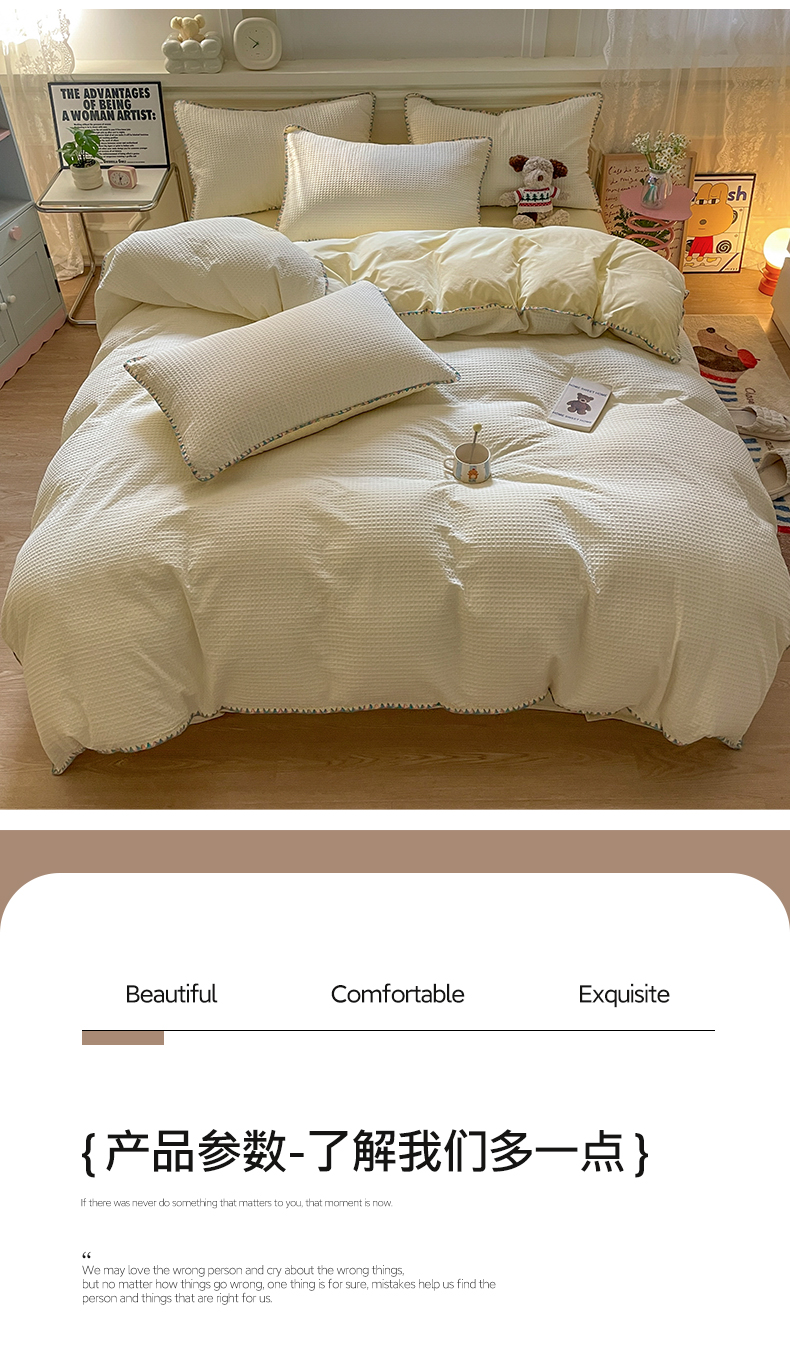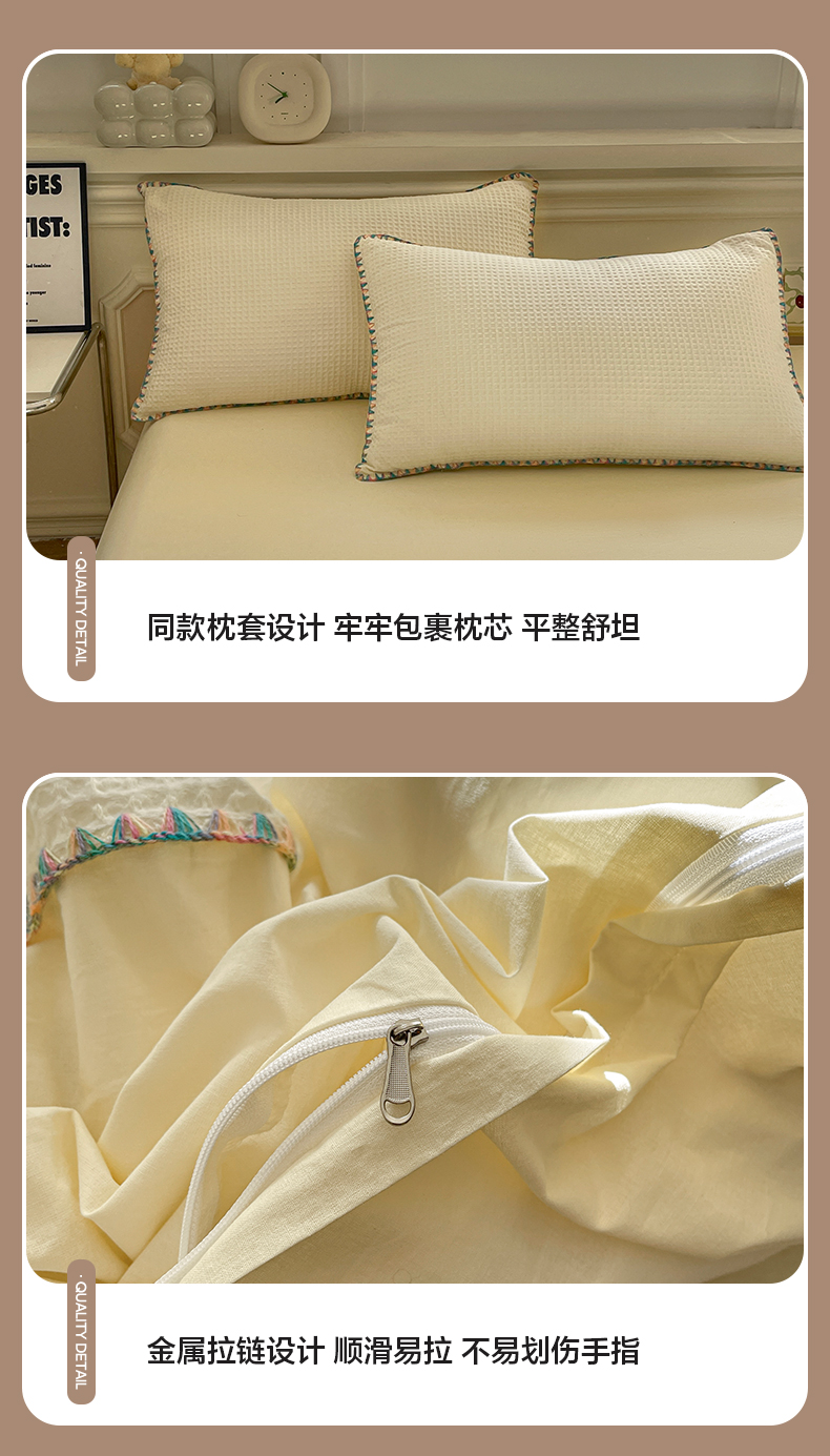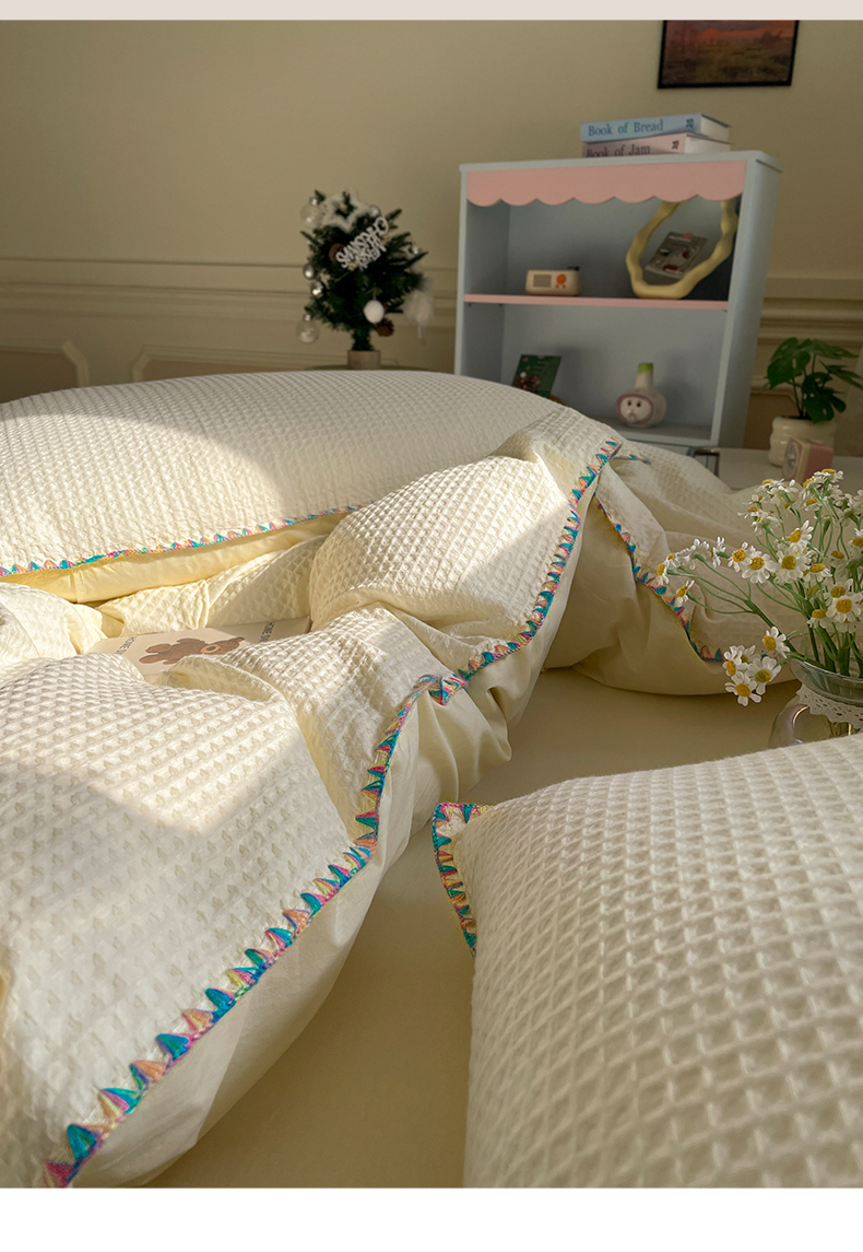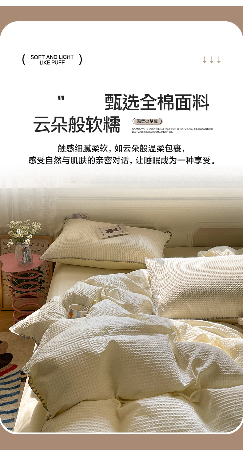商品名称:雅居纺家纺 2025新款全棉贝壳边华夫格四件套 贝壳边米黄