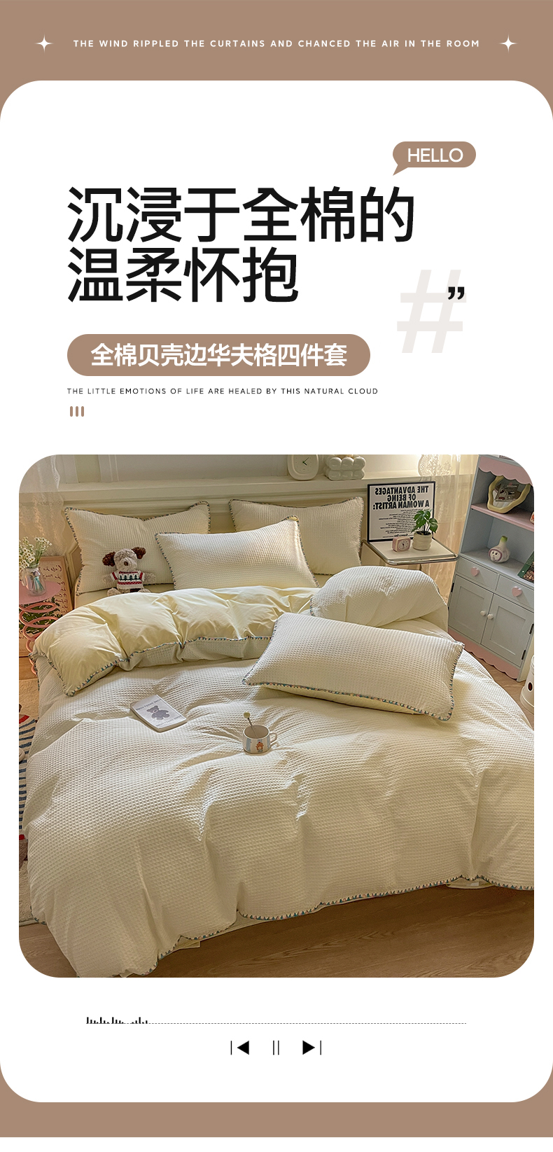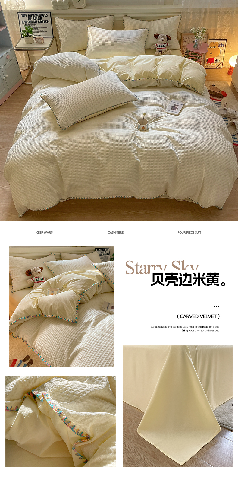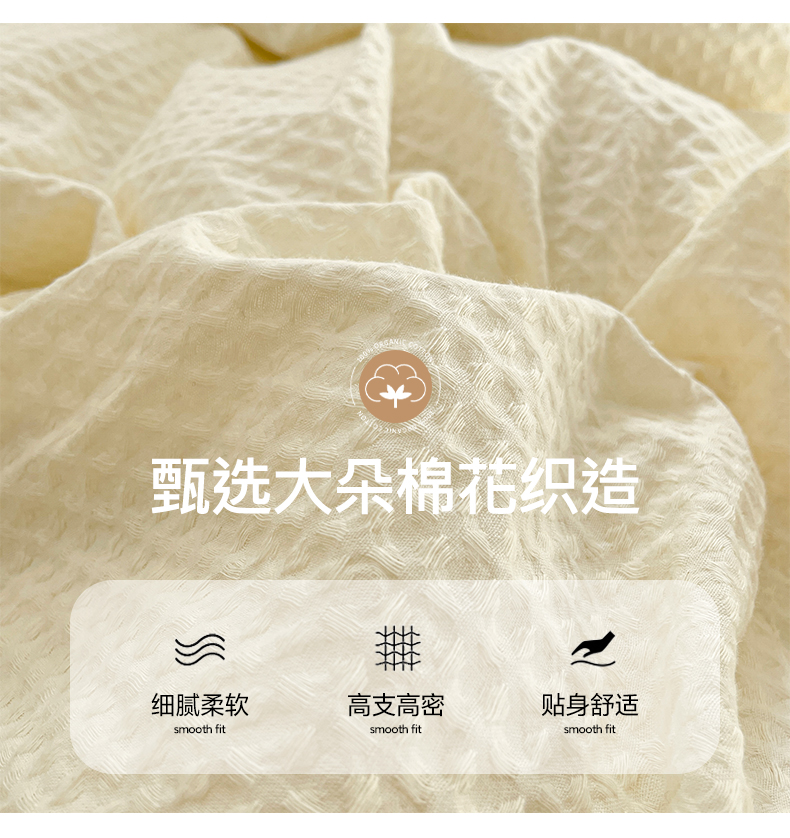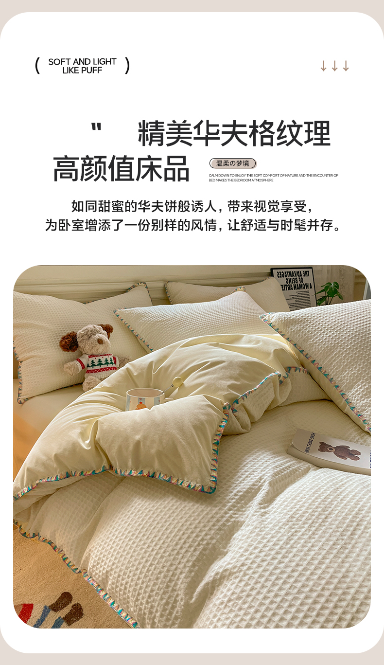 商品名称:雅居纺家纺 2025新款全棉贝壳边华夫格四件套 贝壳边米黄