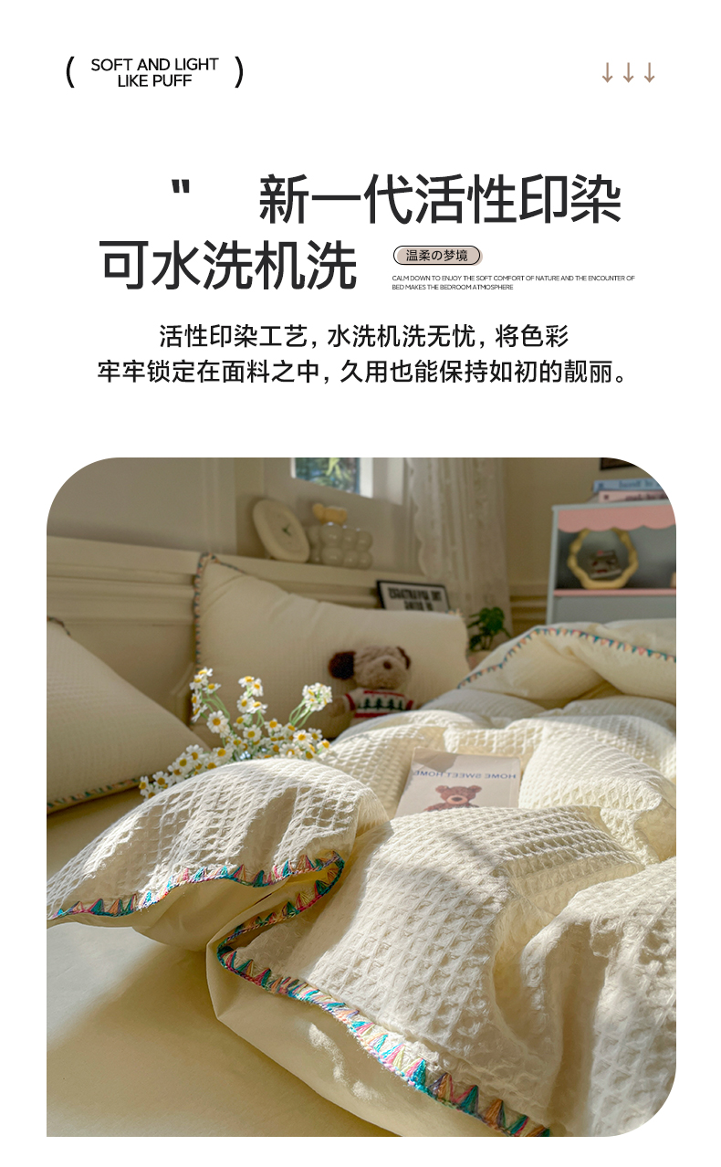 (总)雅居纺家纺 2022新款华夫格花边款四件套,梦幻蓝,橙色,纯白,米咖,浅粉,浅灰,优雅灰