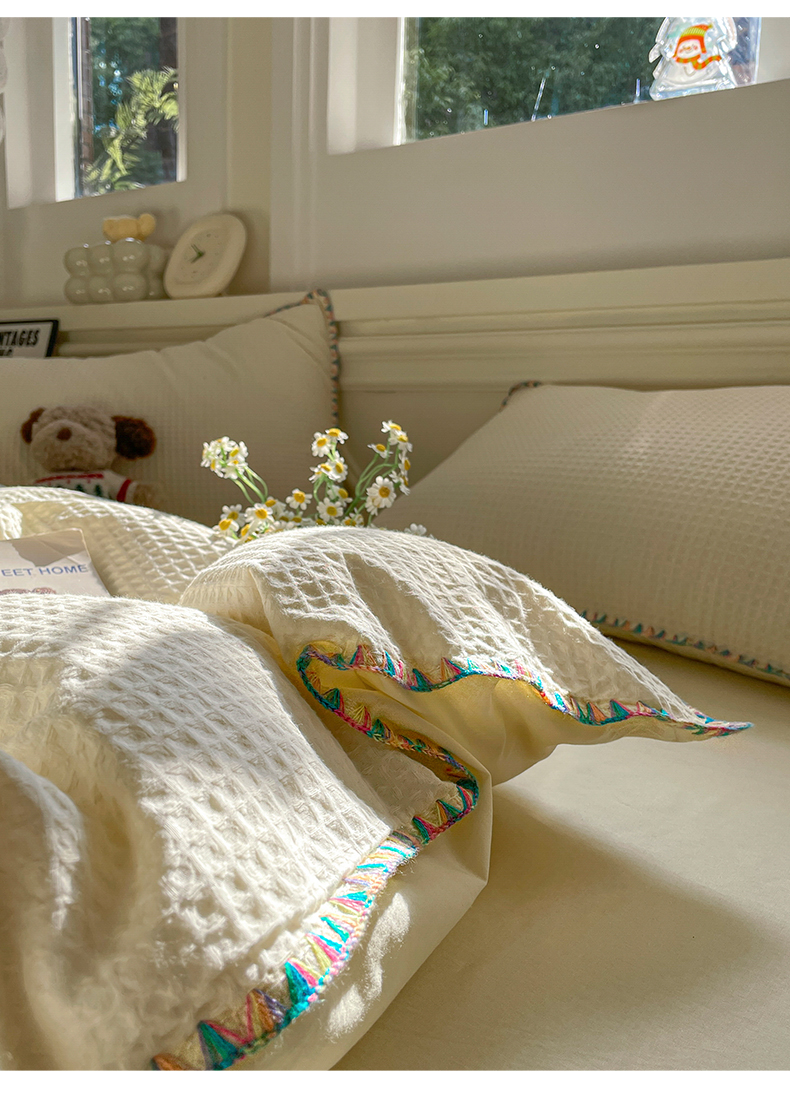 雅居纺家纺 2025新款全棉贝壳边华夫格四件套 贝壳边米黄