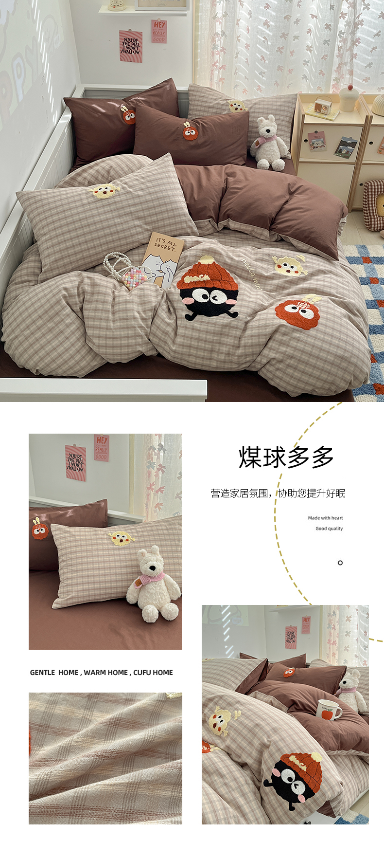 商品名称:呗旺鹿 2025新款A类全棉色织水洗棉毛巾绣系列四件套 煤球多多