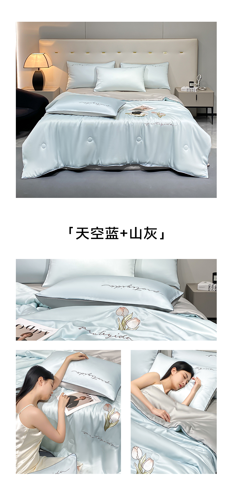 • 91家纺网 家纺一手货源 找家纺 仔仔熊 2025新款水洗真丝夏被四件套-百合 百合-天空蓝+山灰