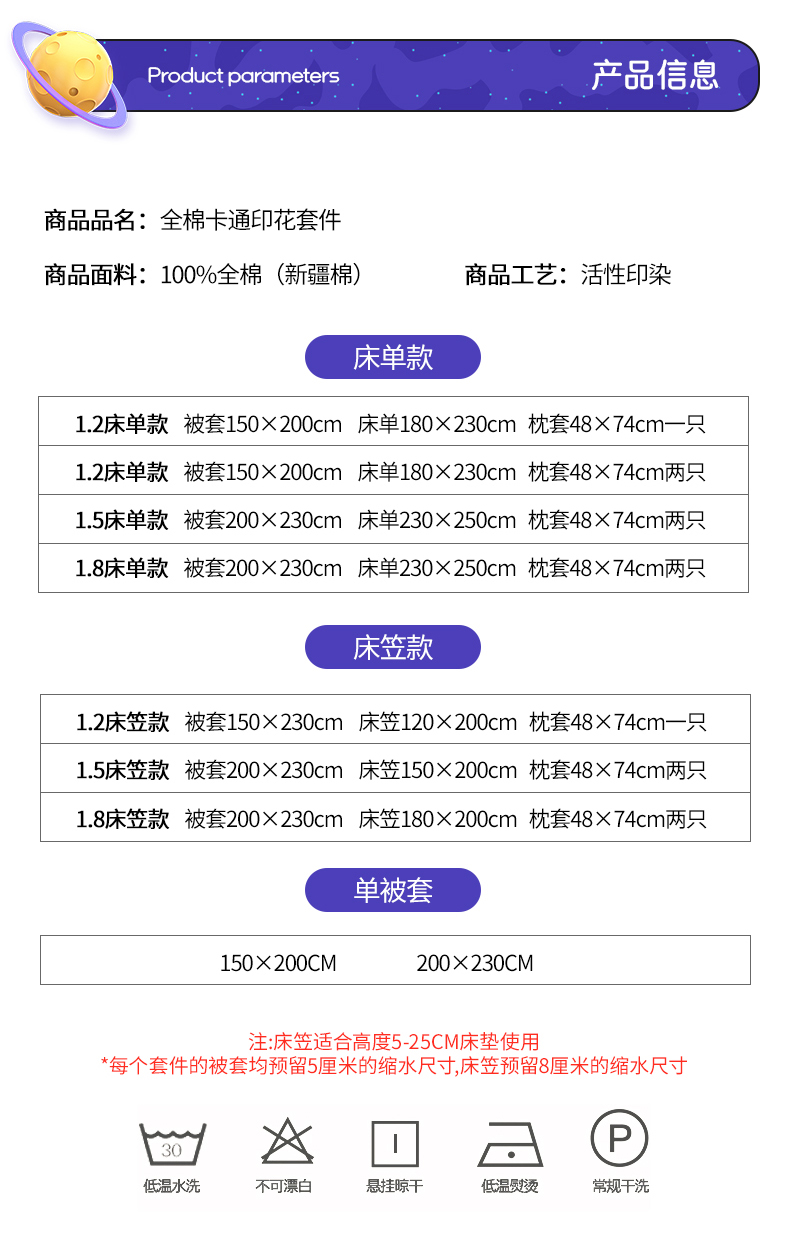 1.2米(被套155×205,床单180×230, 枕套48×74一只) | ¥115.00 |