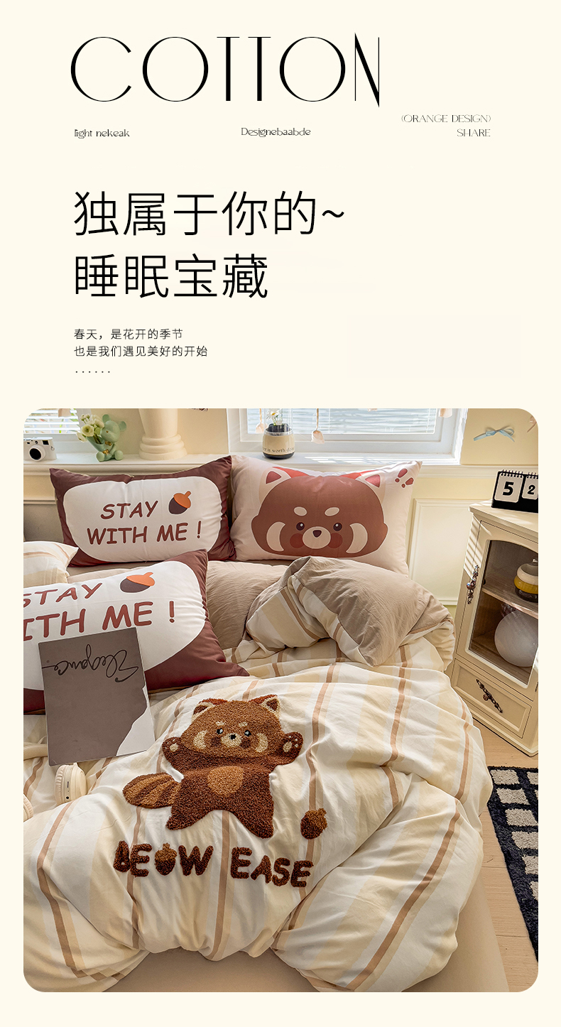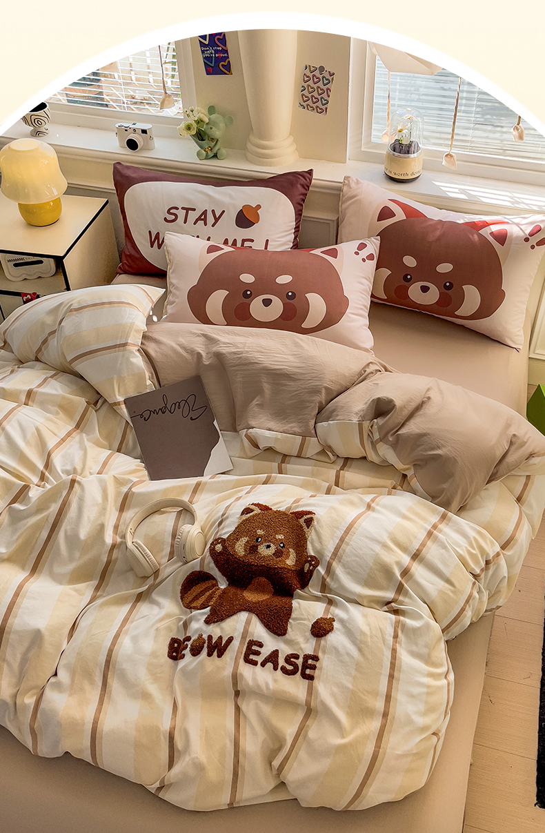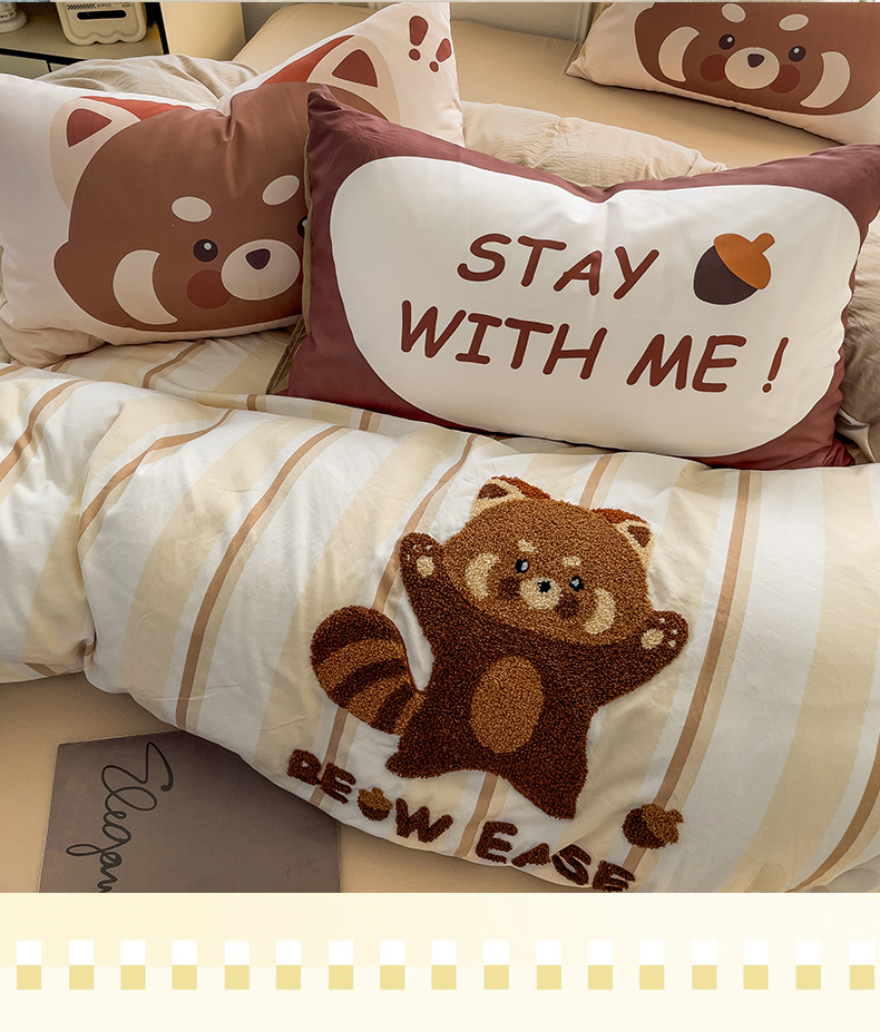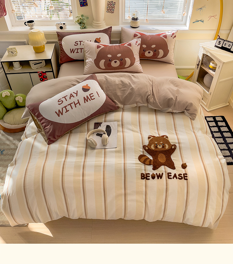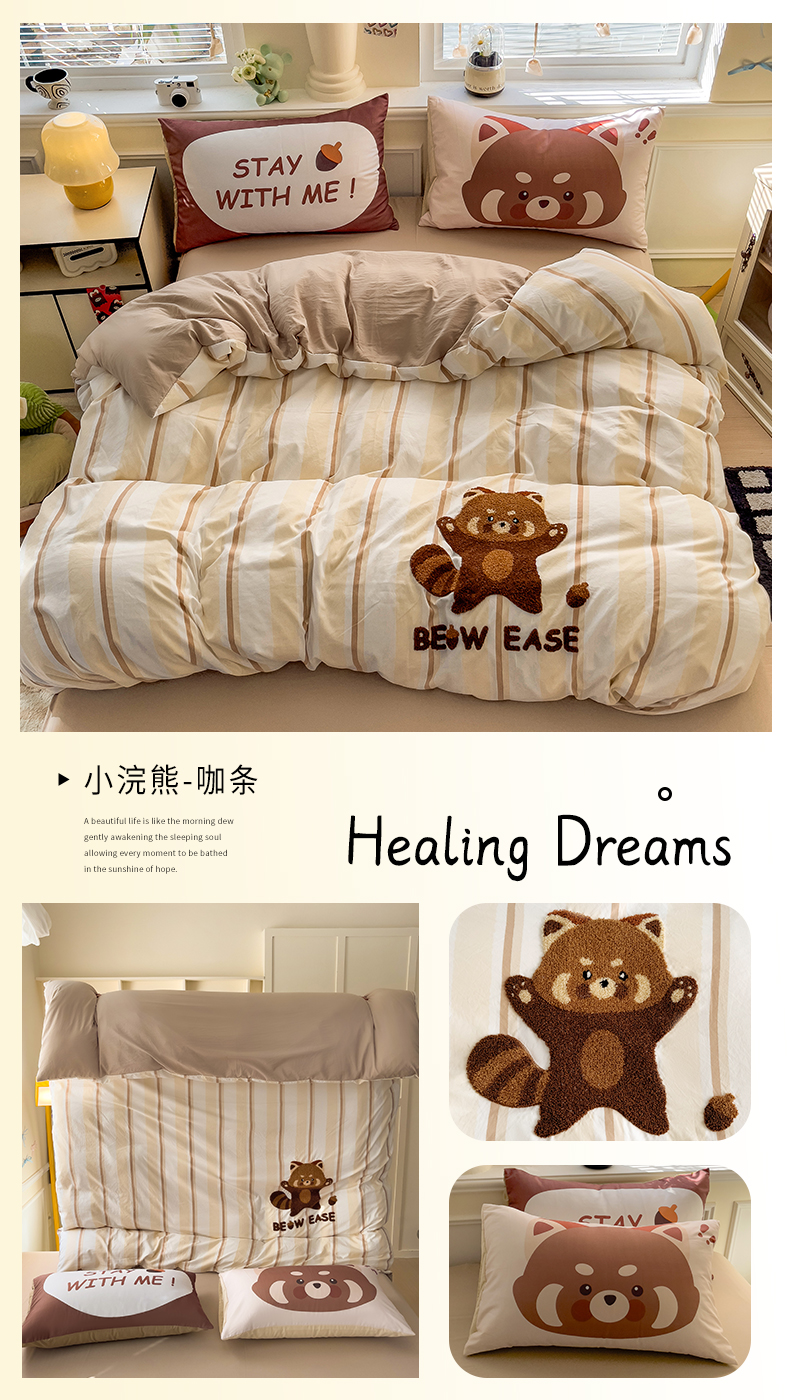 当前位置: 91家纺网 > 商品网购 > 床品套件 > 四件套 > 全棉普通四件套 > 尤米【提供买家秀】2025新款水洗棉大版卡通毛巾绣四件套 小浣熊-咖条