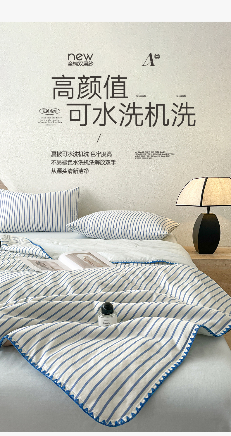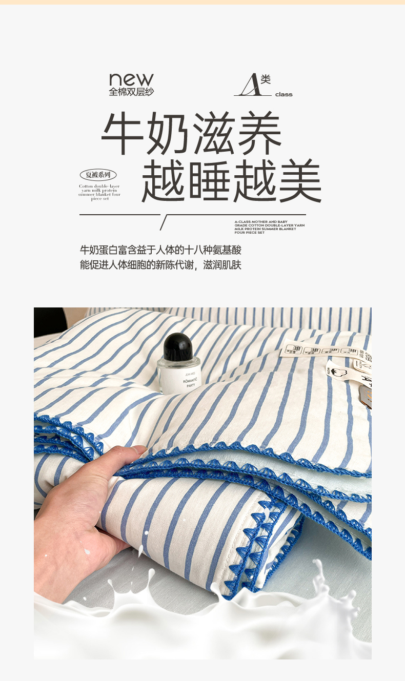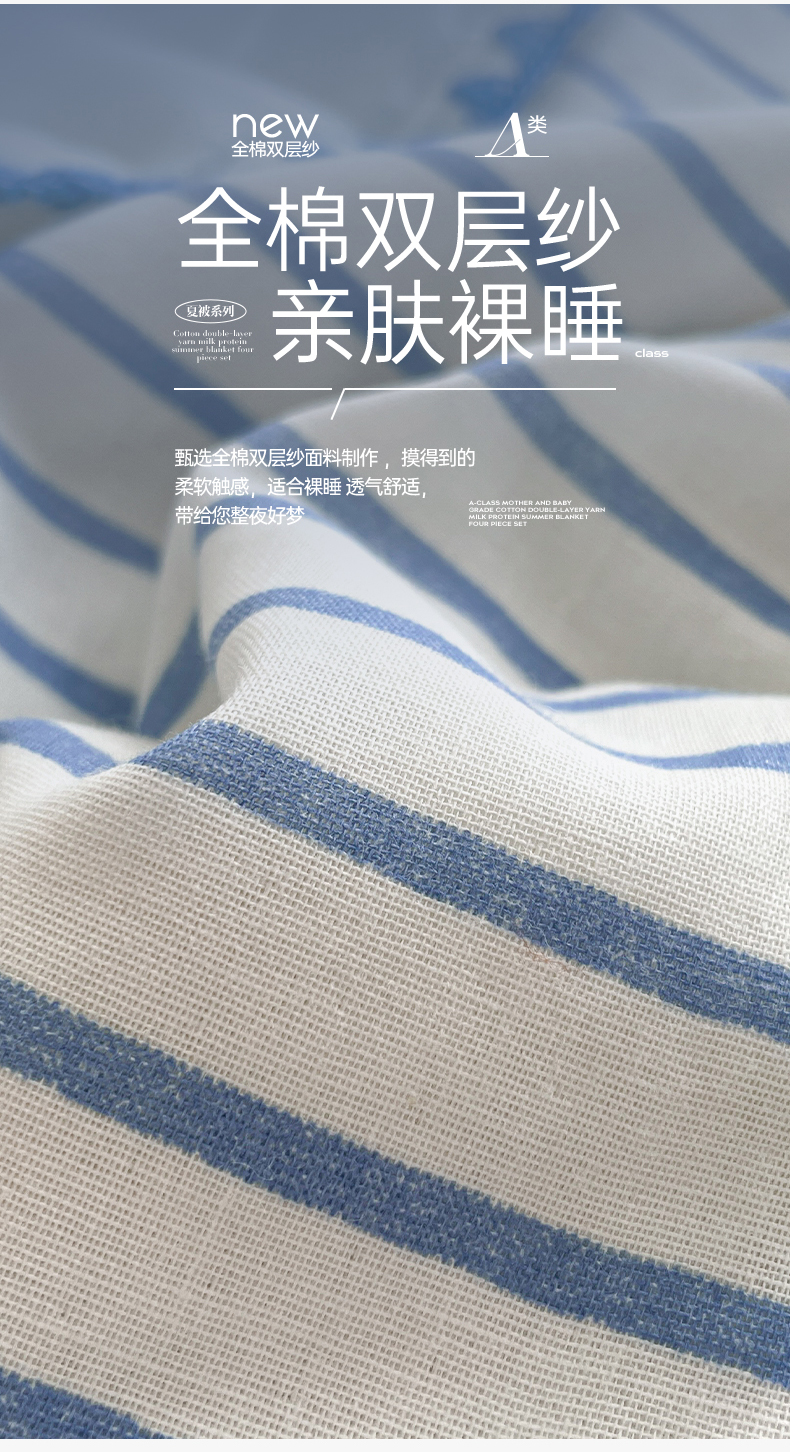 • 91家纺网 家纺一手货源 找家纺 一加一 2025新款A类母婴级全棉双层纱牛奶蛋白夏被四件套 蓝大条