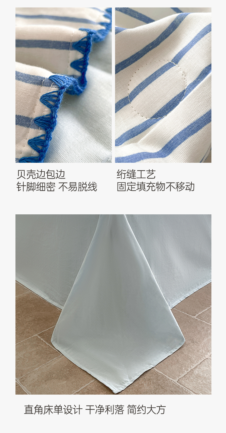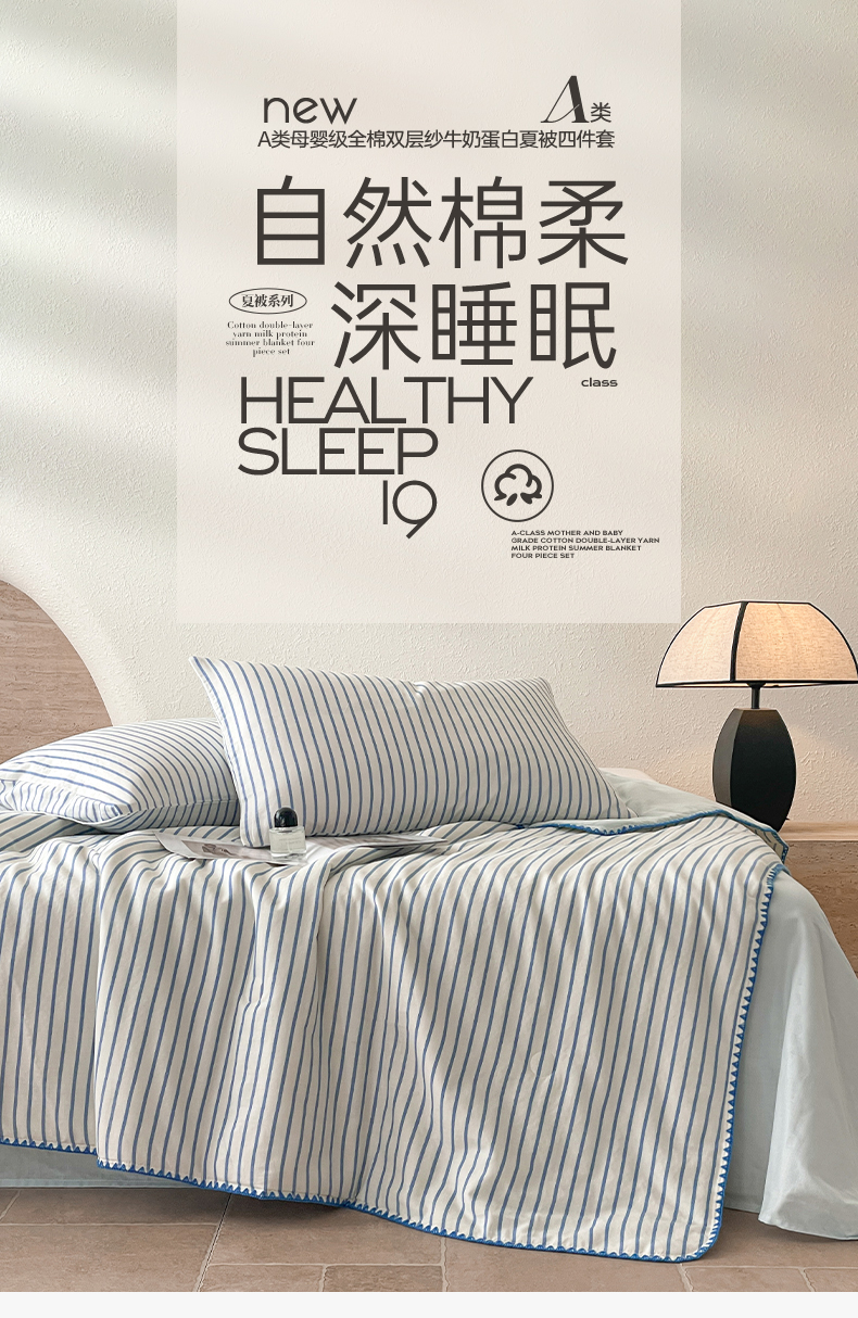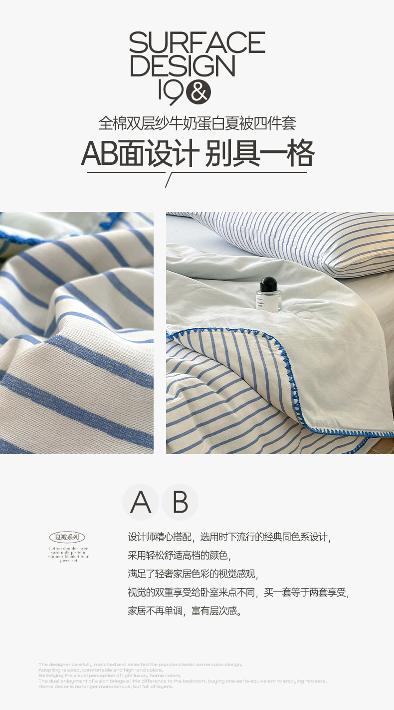 • 91家纺网 家纺一手货源 找家纺 一加一 2025新款A类母婴级全棉双层纱牛奶蛋白夏被四件套 蓝大条