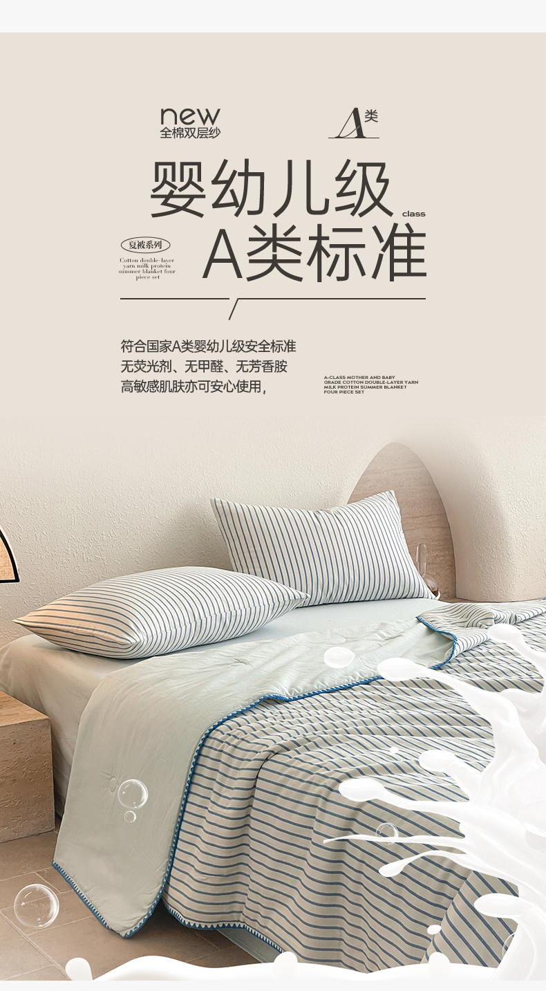 一加一 2025新款A类母婴级全棉双层纱牛奶蛋白夏被四件套 蓝大条