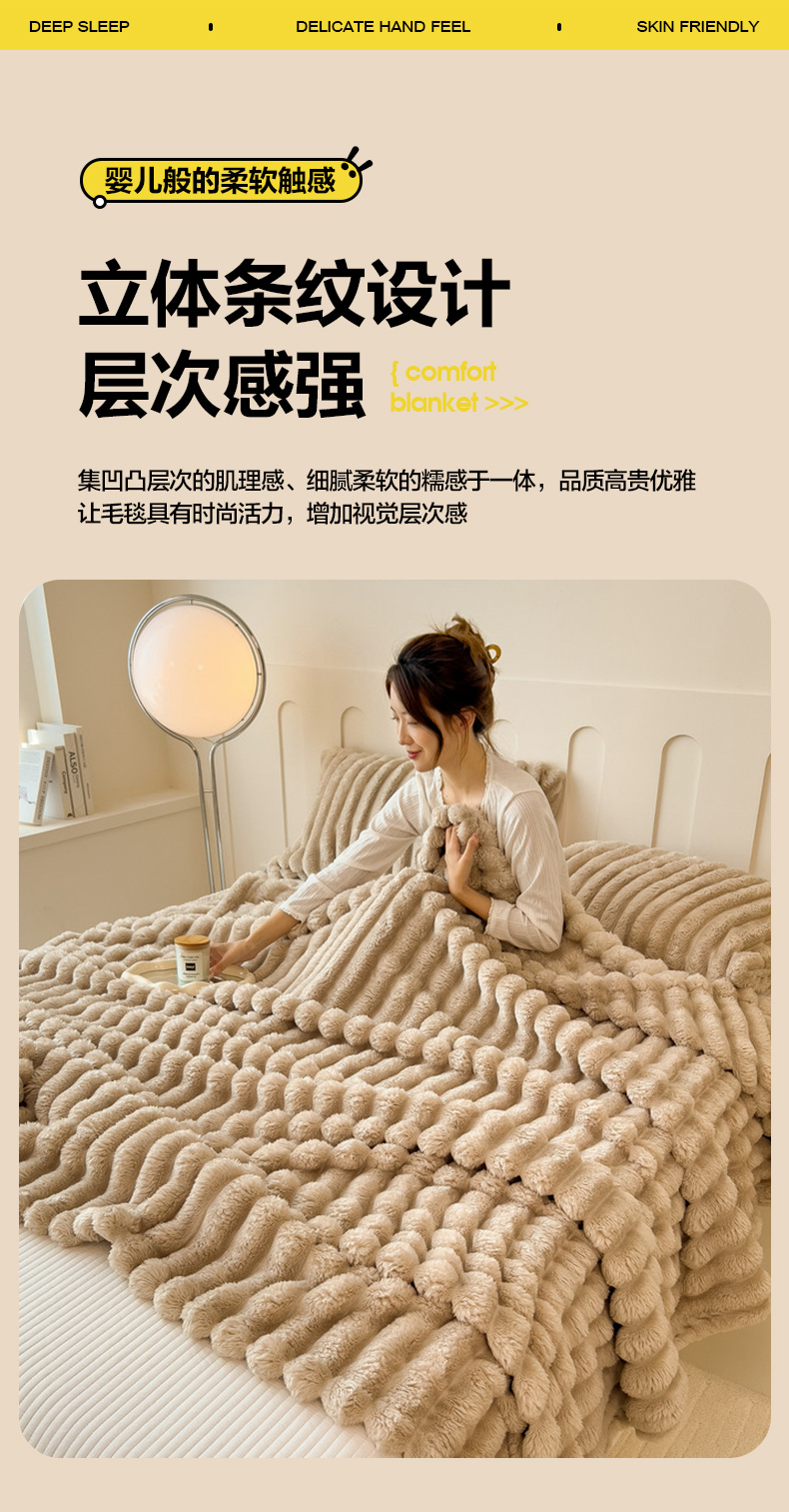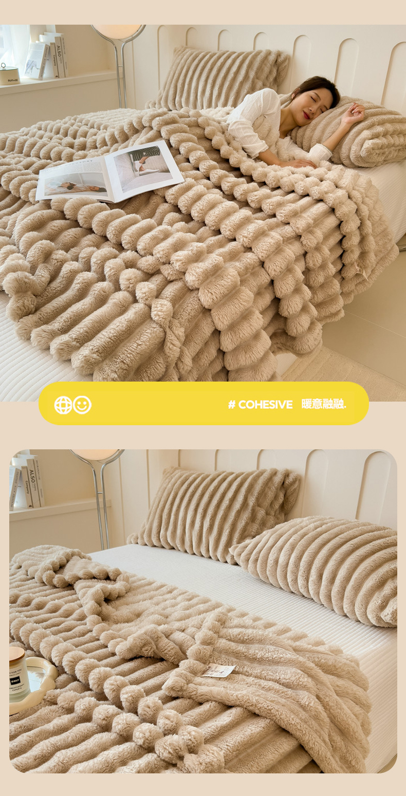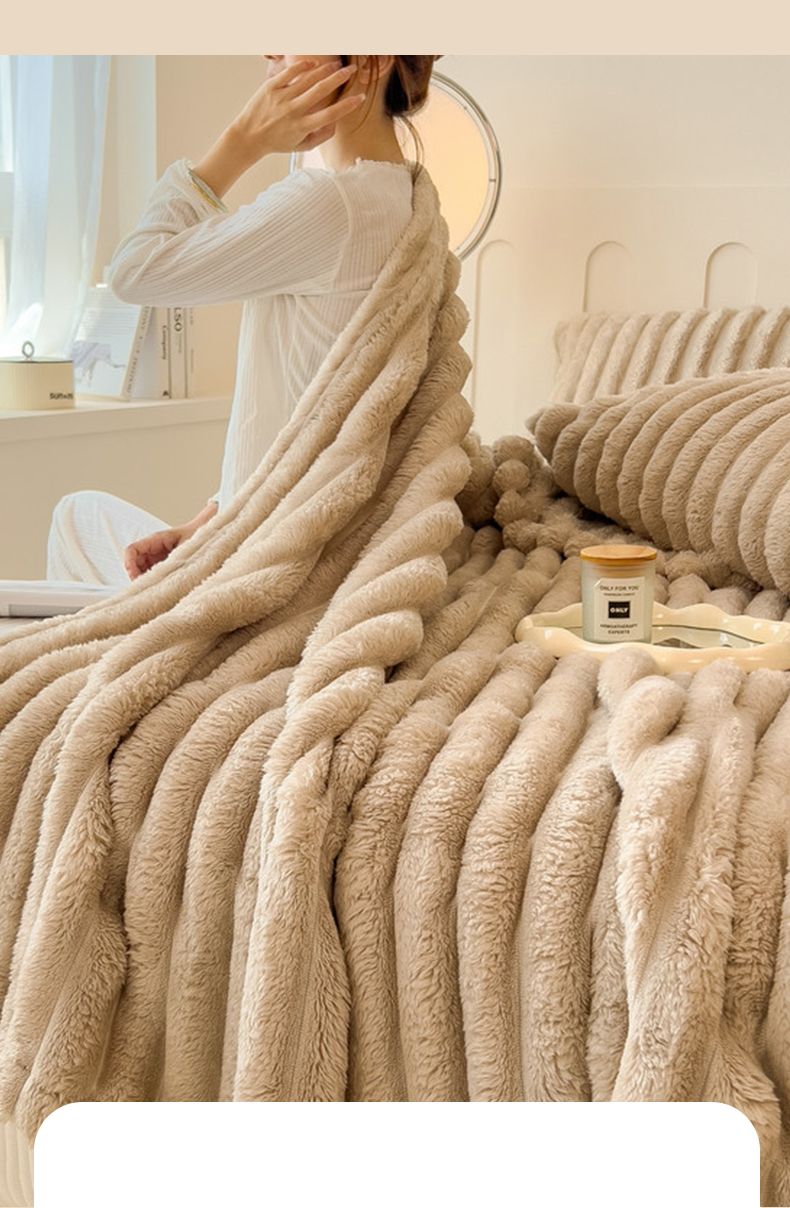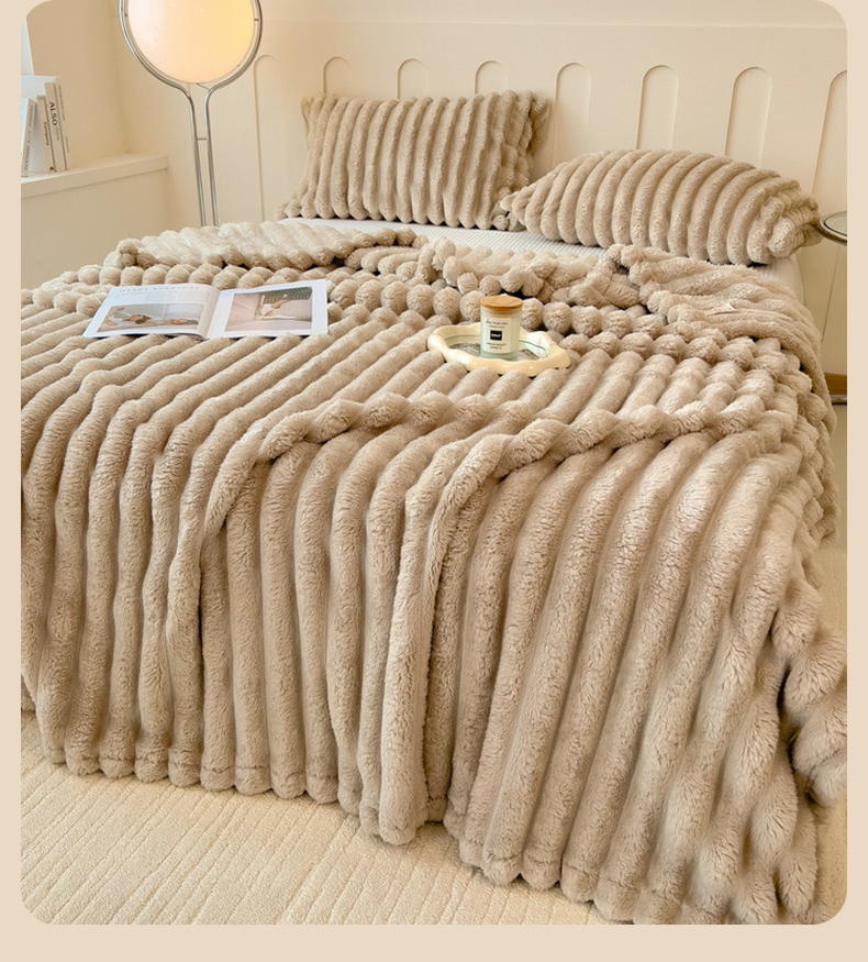 商品名称:一帆毯业 跨境外贸2025新款仿兔毛宽抽条牛奶绒盖毯 抽条卡其