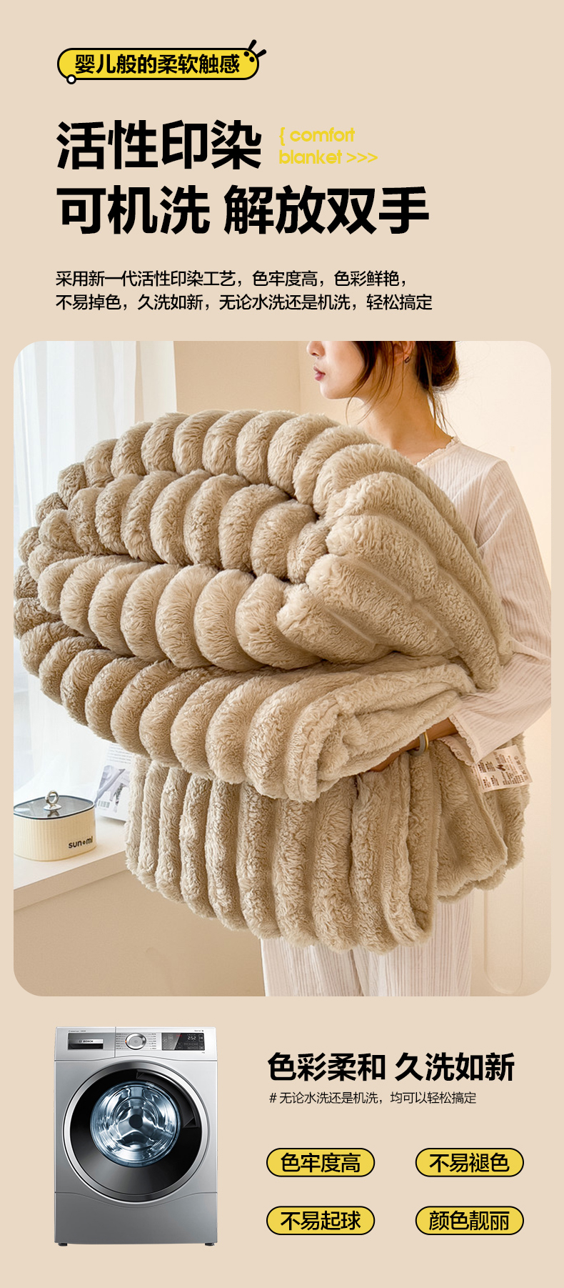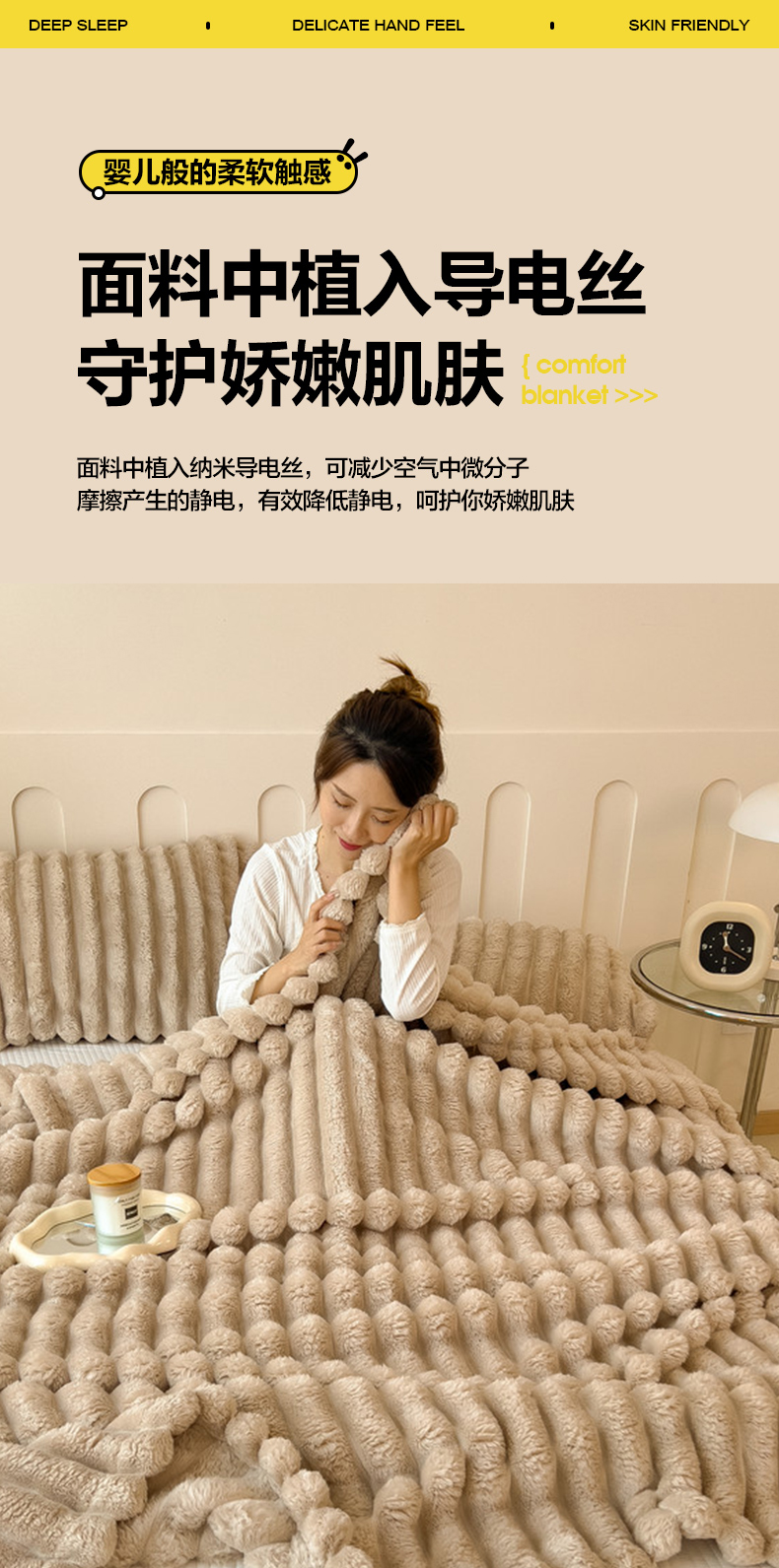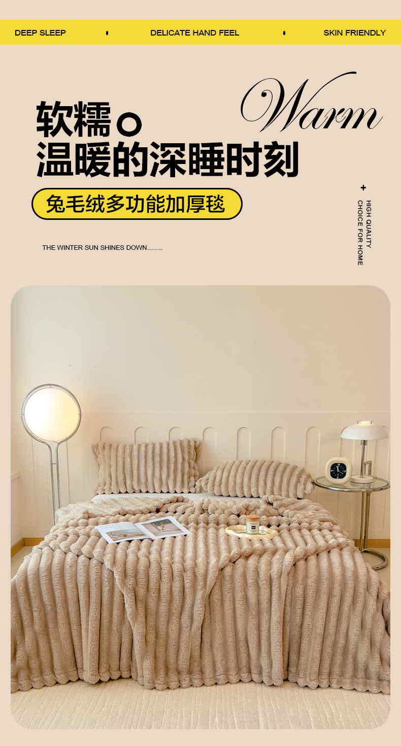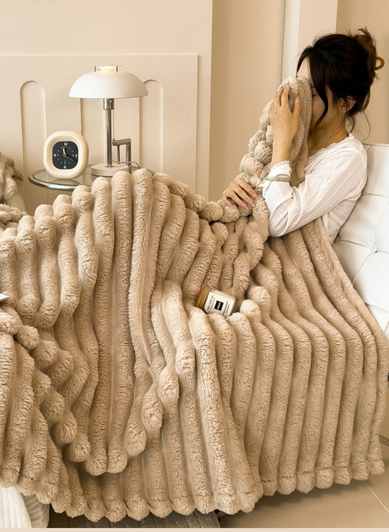 商品名称:一帆毯业 跨境外贸2025新款仿兔毛宽抽条牛奶绒盖毯 抽条卡其