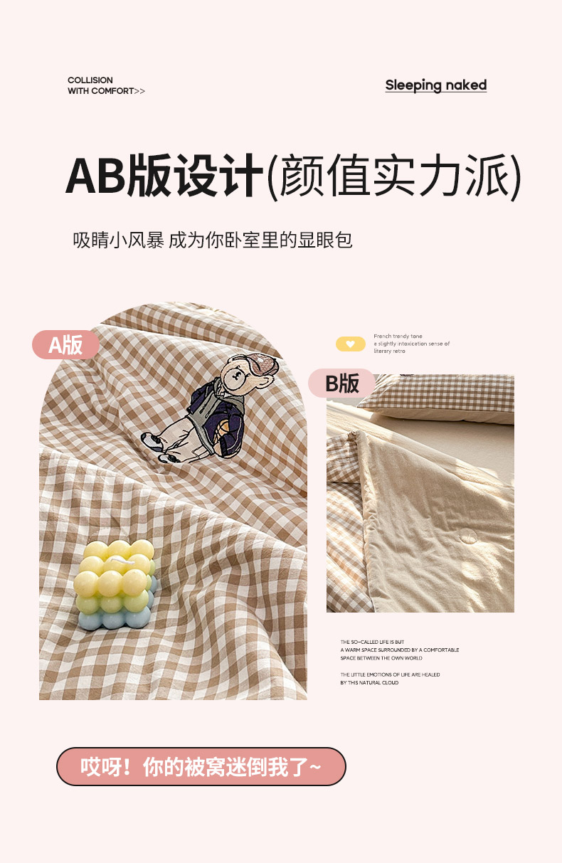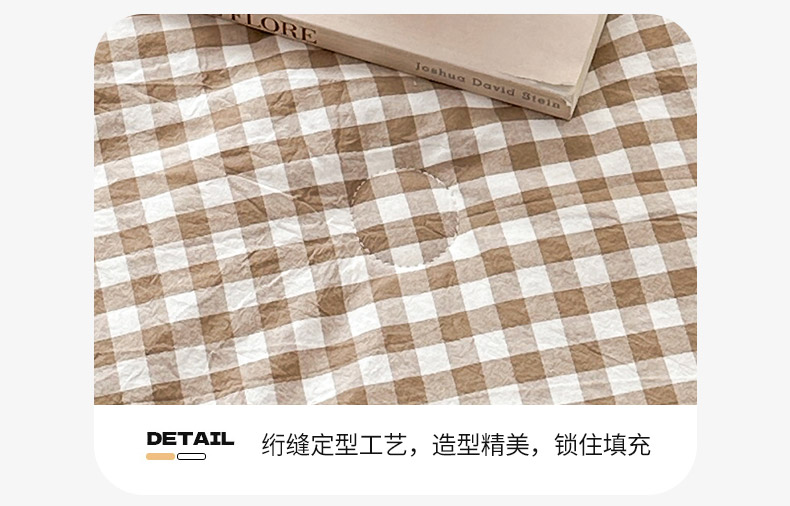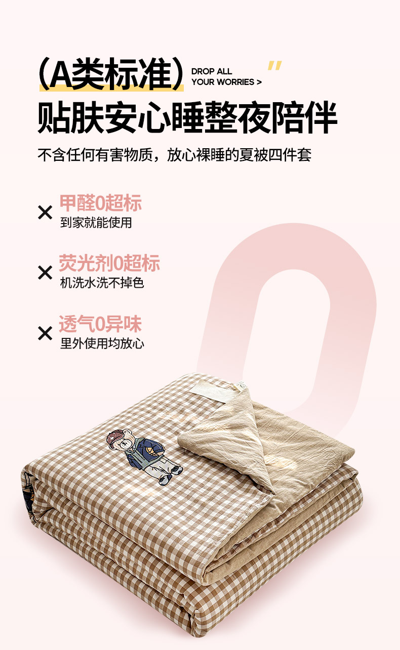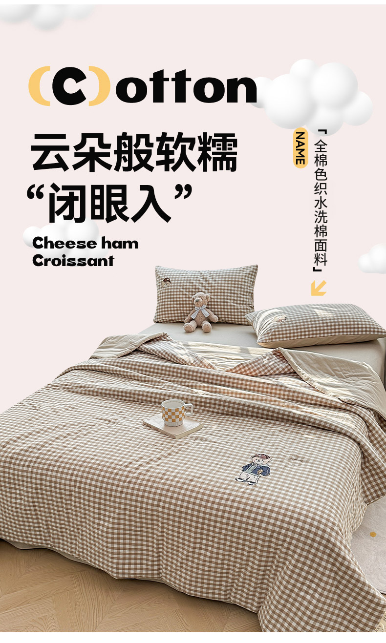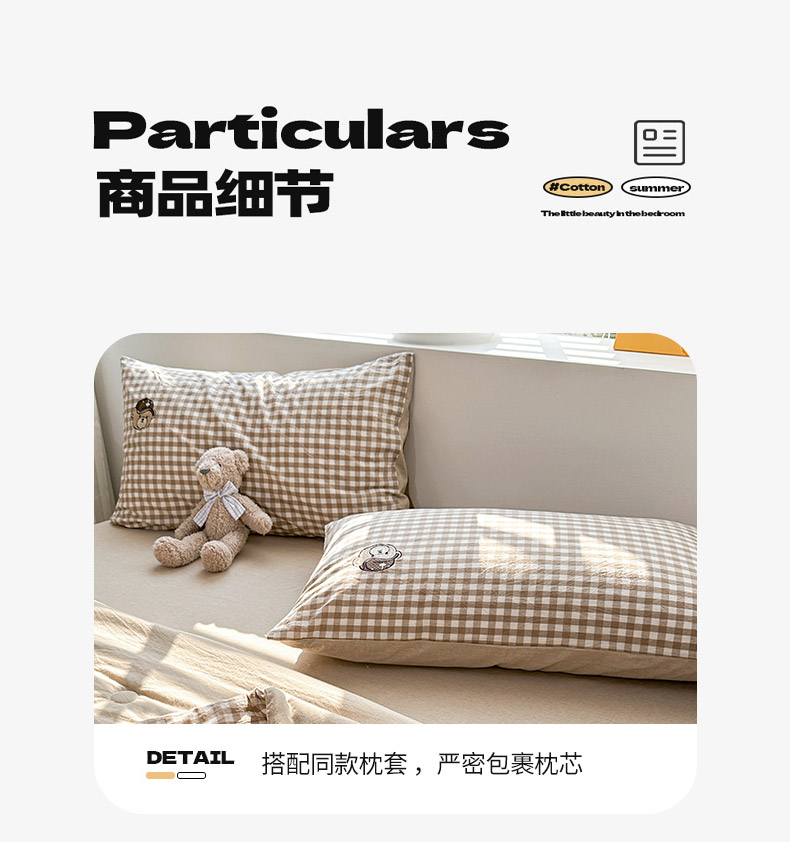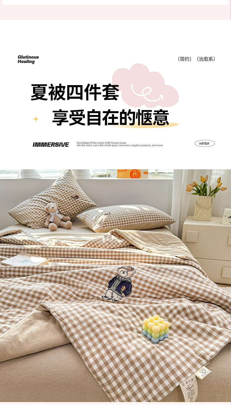 商品名称:大境 2025新款专版纯棉色织水洗棉刺绣全棉夏被四件套 篮球小熊-格子咖