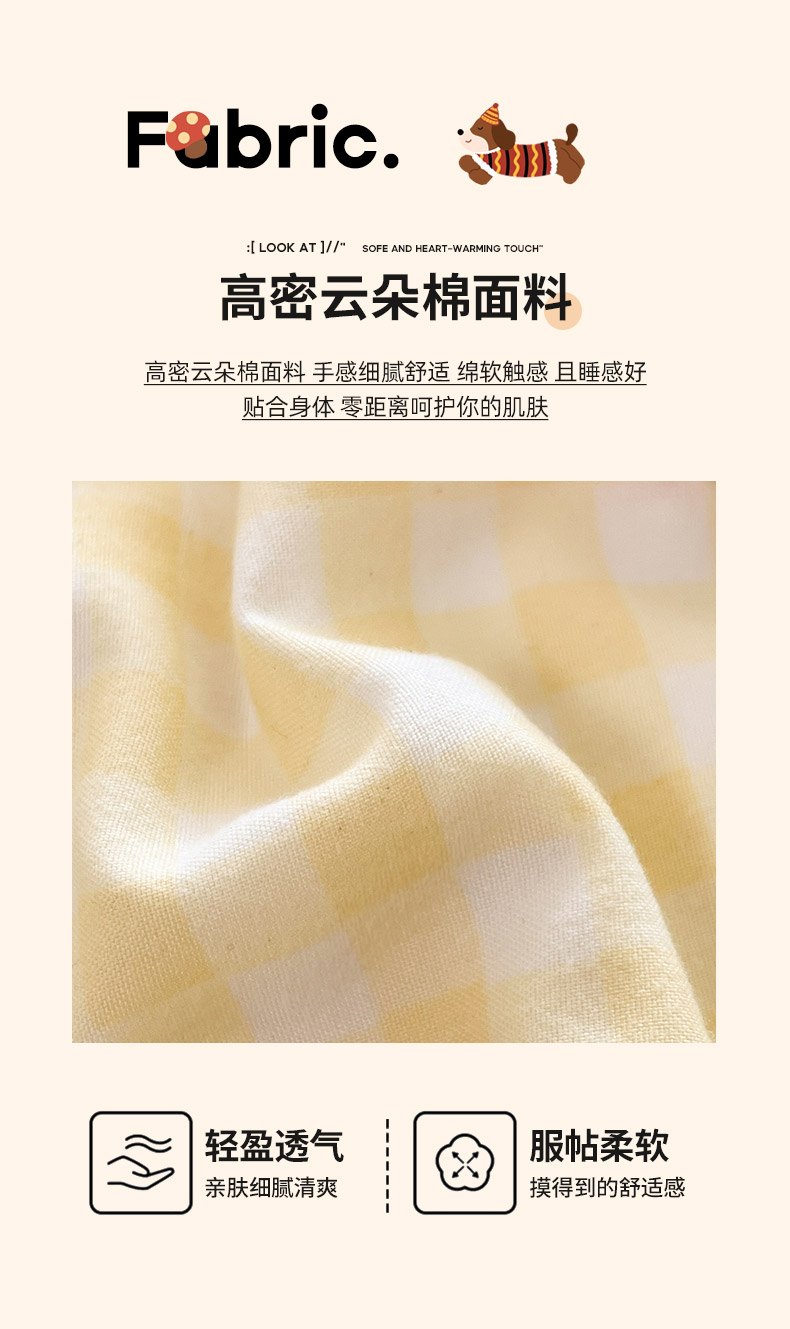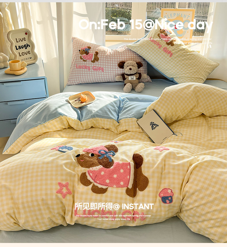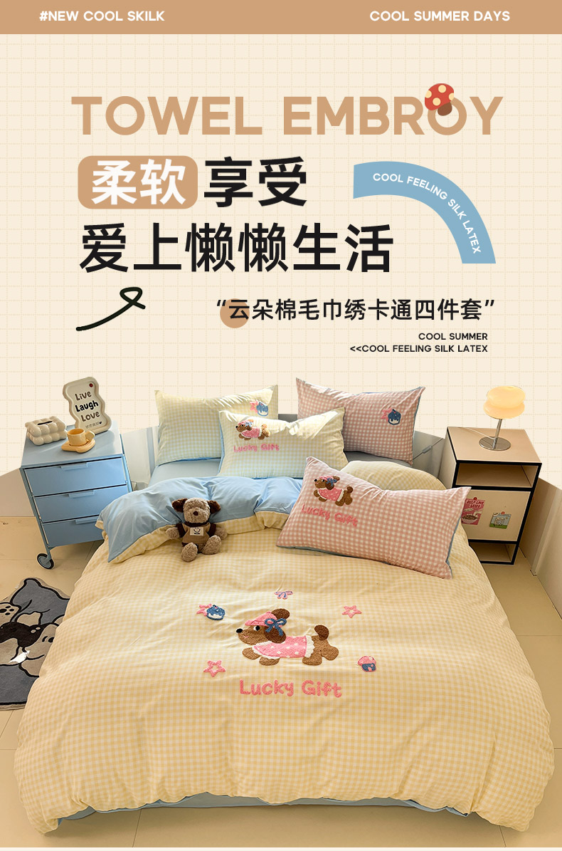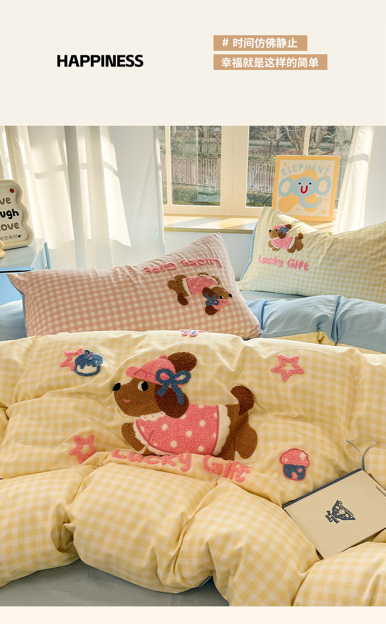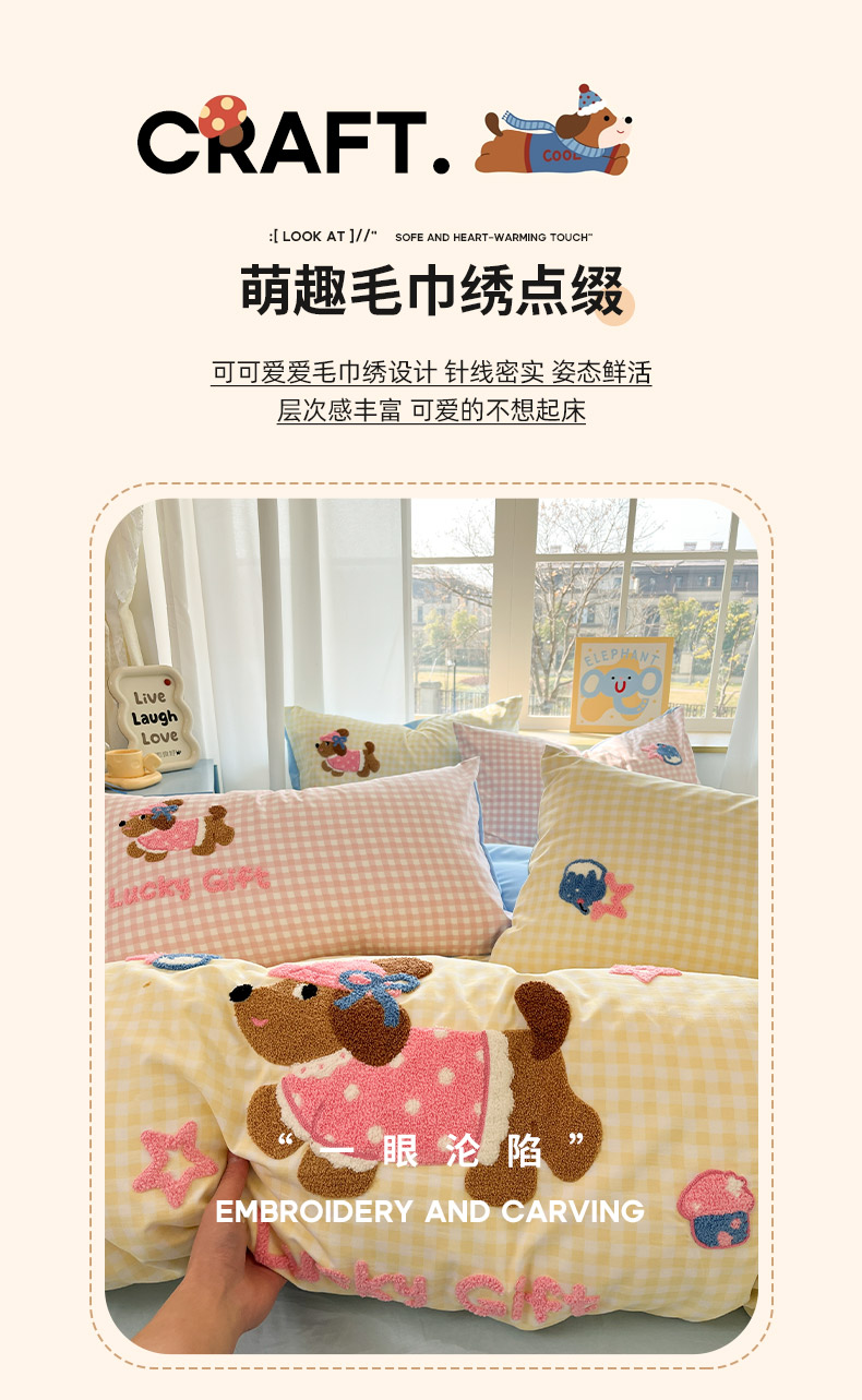 商品名称:乐坊2025新款云朵棉毛巾绣四件套 腊肠狗-黄格