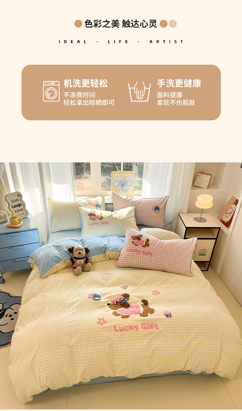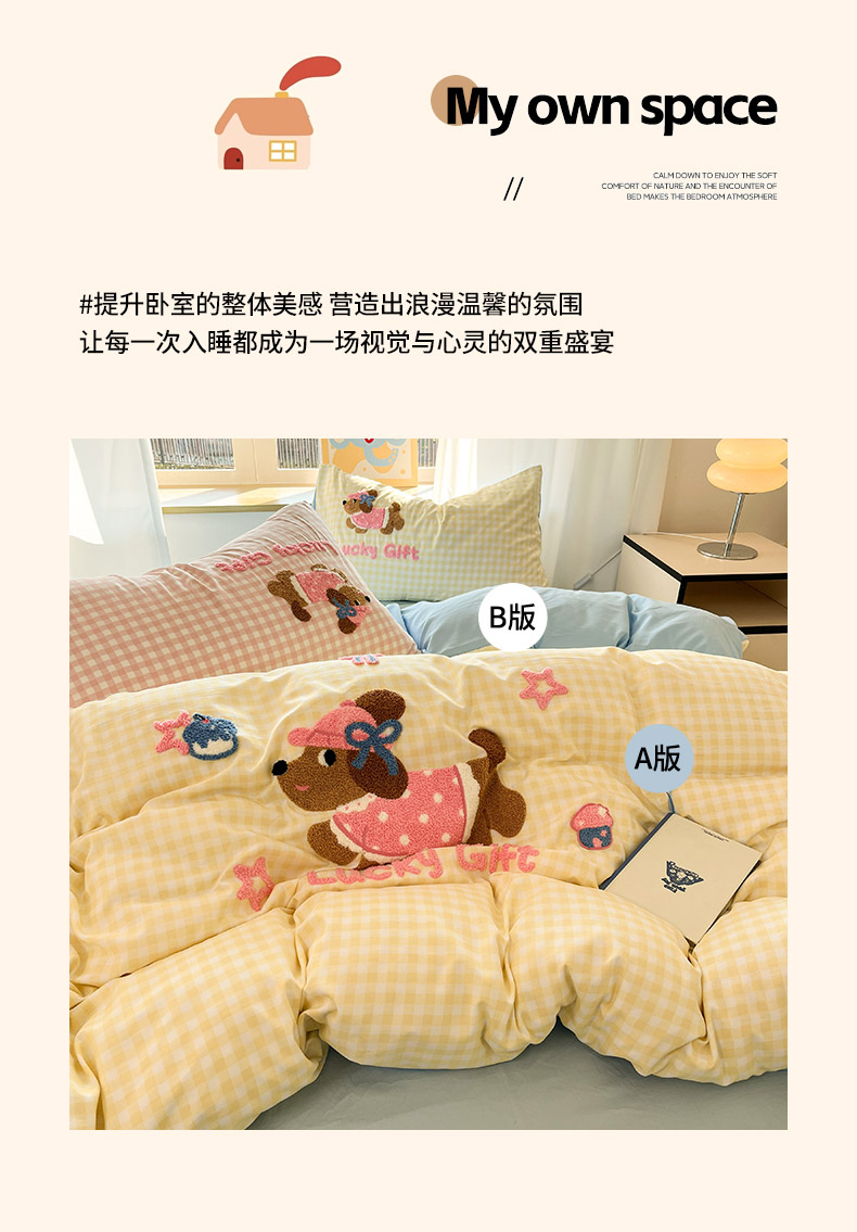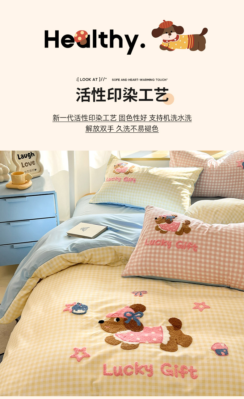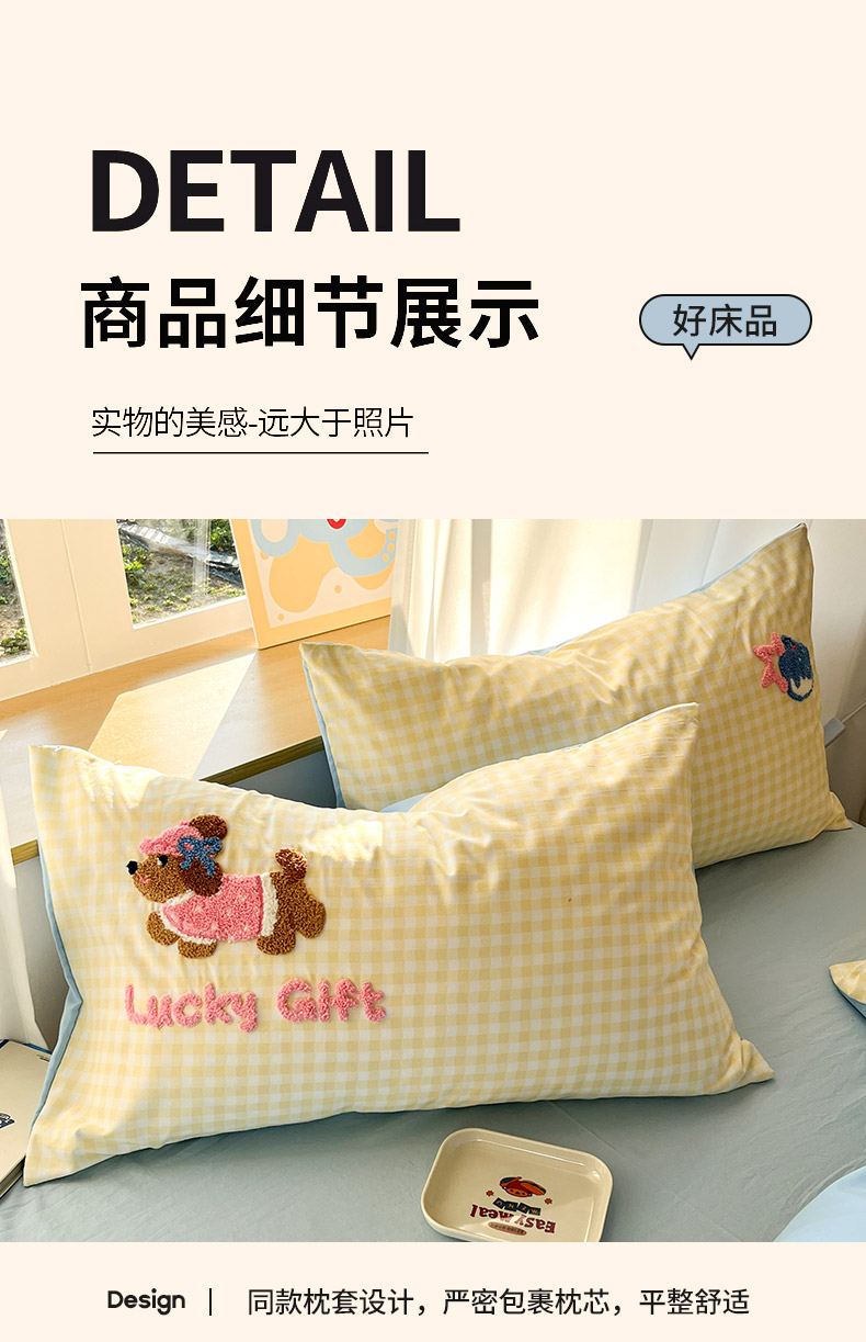 商品名称:乐坊2025新款云朵棉毛巾绣四件套 腊肠狗-黄格