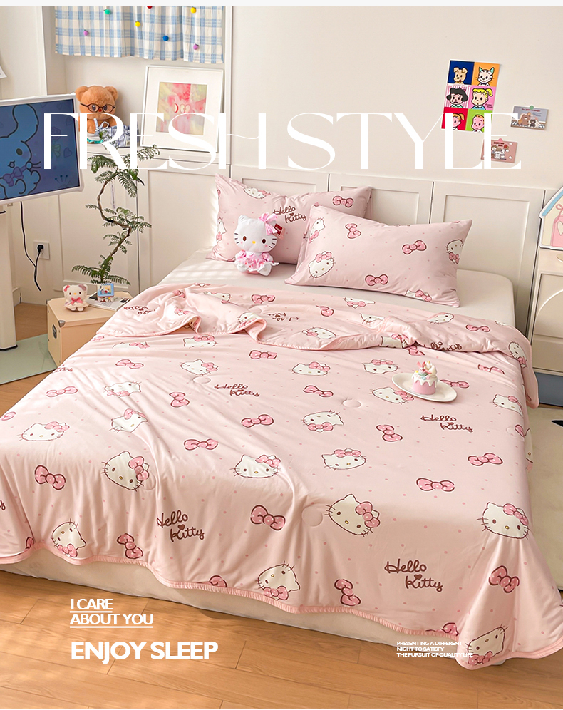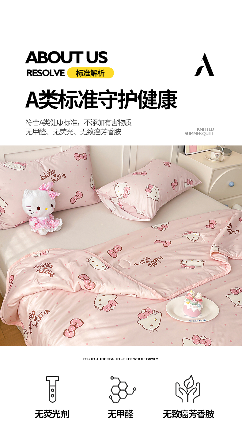 当前位置: 91家纺网 > 商品网购 > 被子 > 夏被 > 桃子家居 2025新款A类三丽鸥正版授权高品质牛奶丝软糯针织棉大豆夏被系列 针织棉三丽鸥-爱心美少女kitty