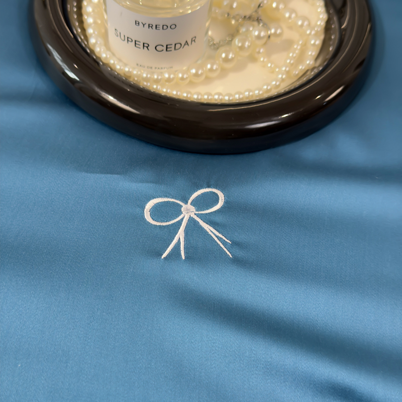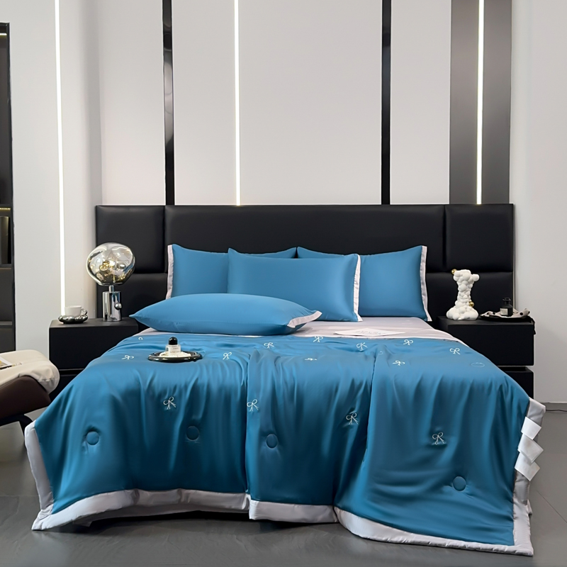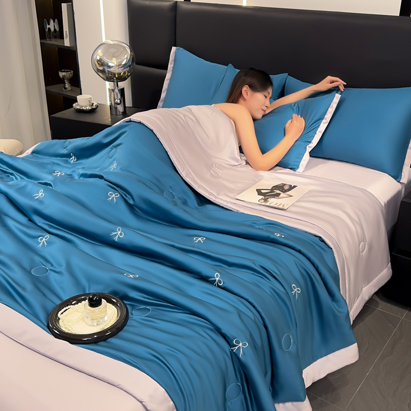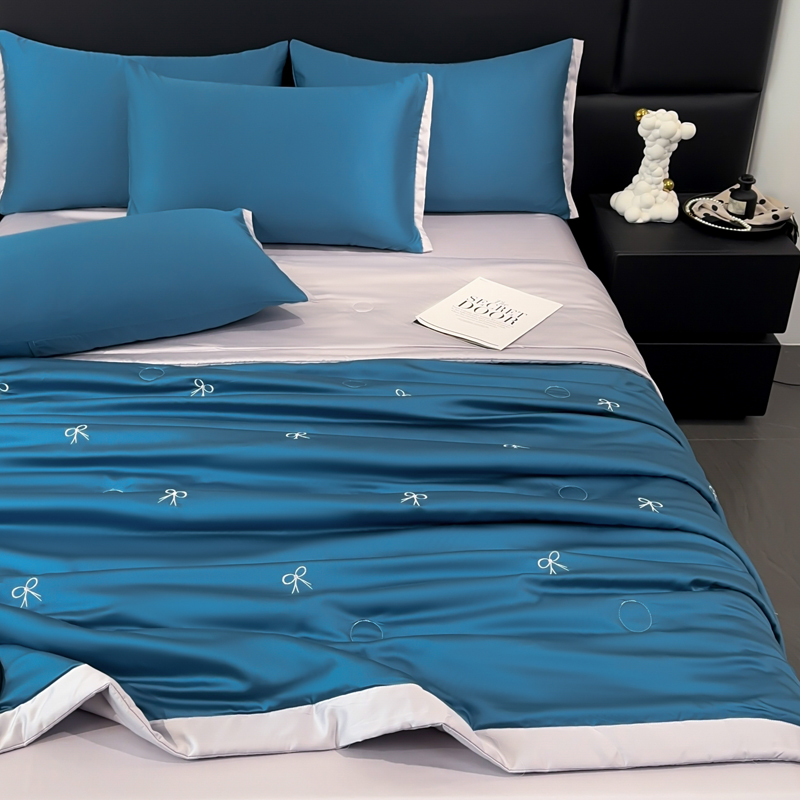 2025新款清凉舒适水洗冰丝刺绣夏被四件套 蝴蝶結-青蓝
