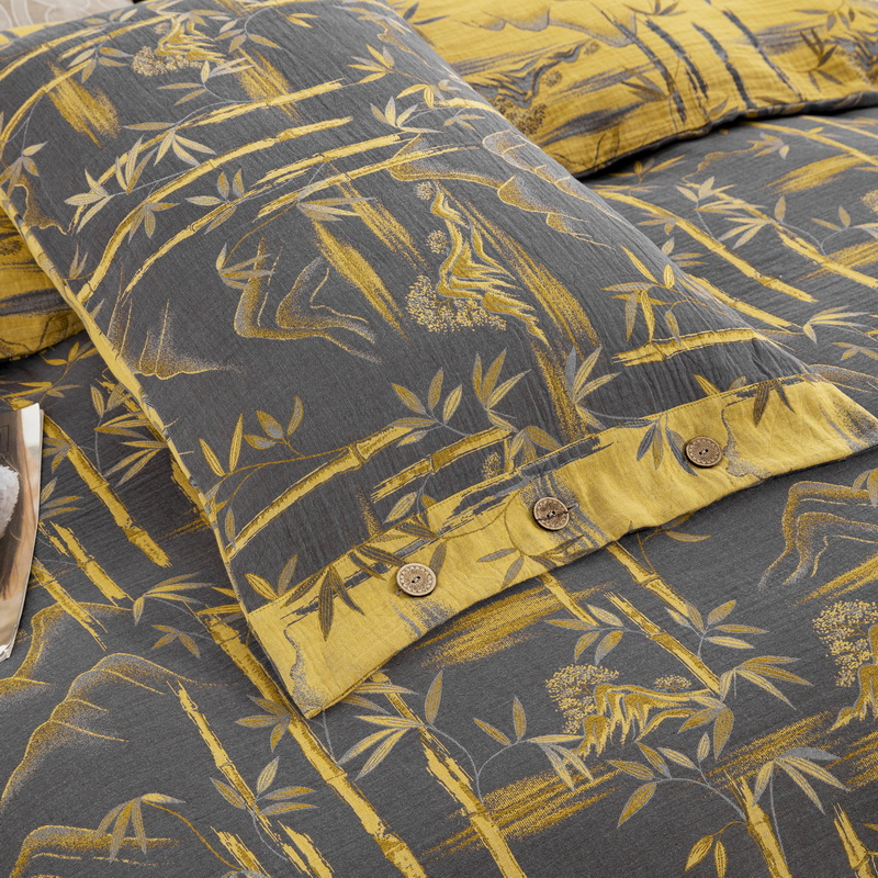 商品名称:2025新款全棉色织双层纱纽扣款四件套 竹报平安-黑金