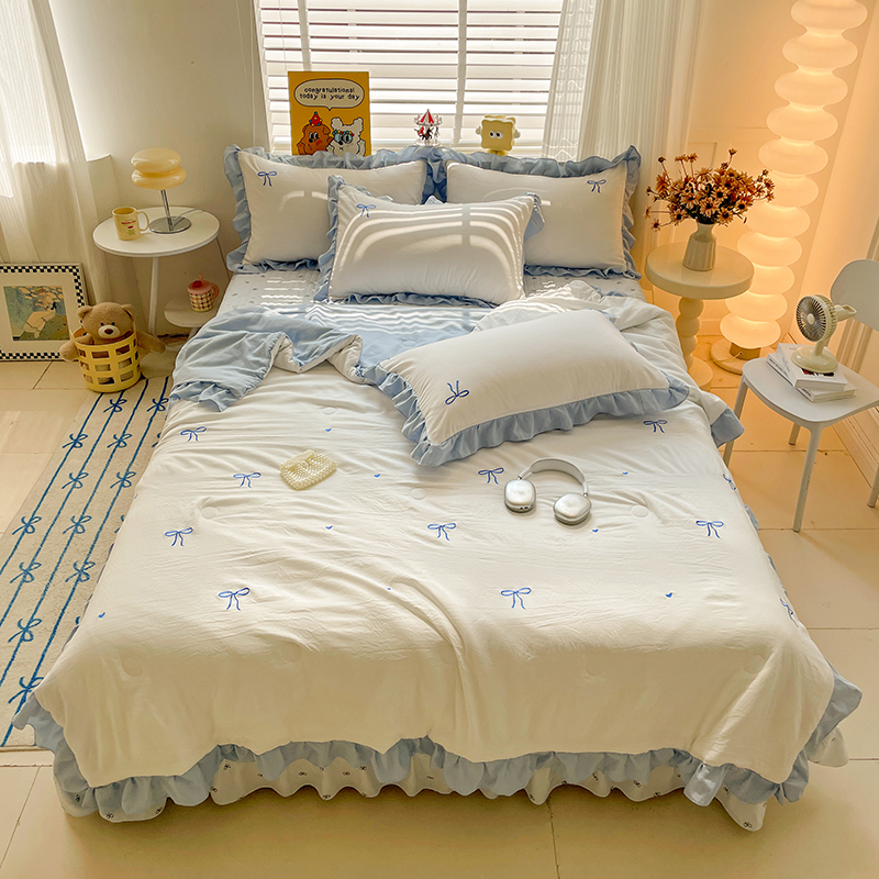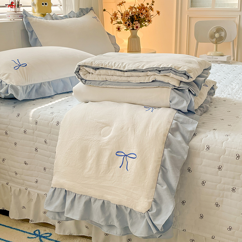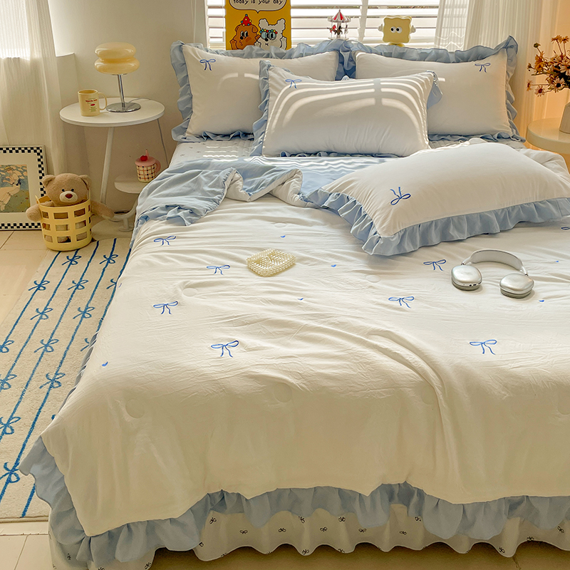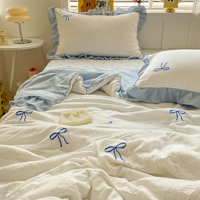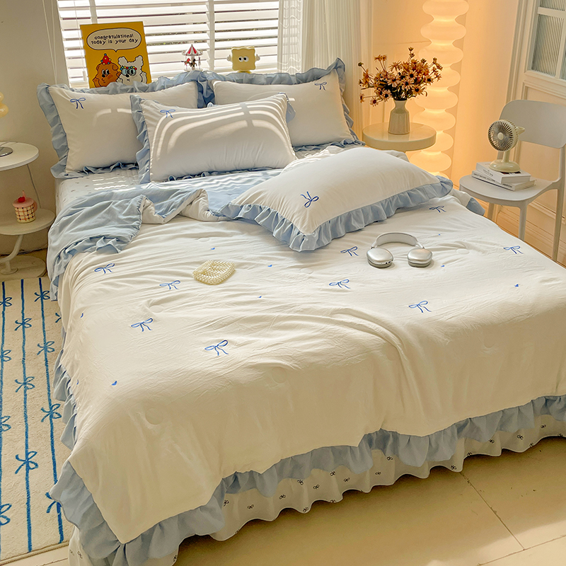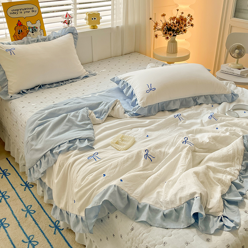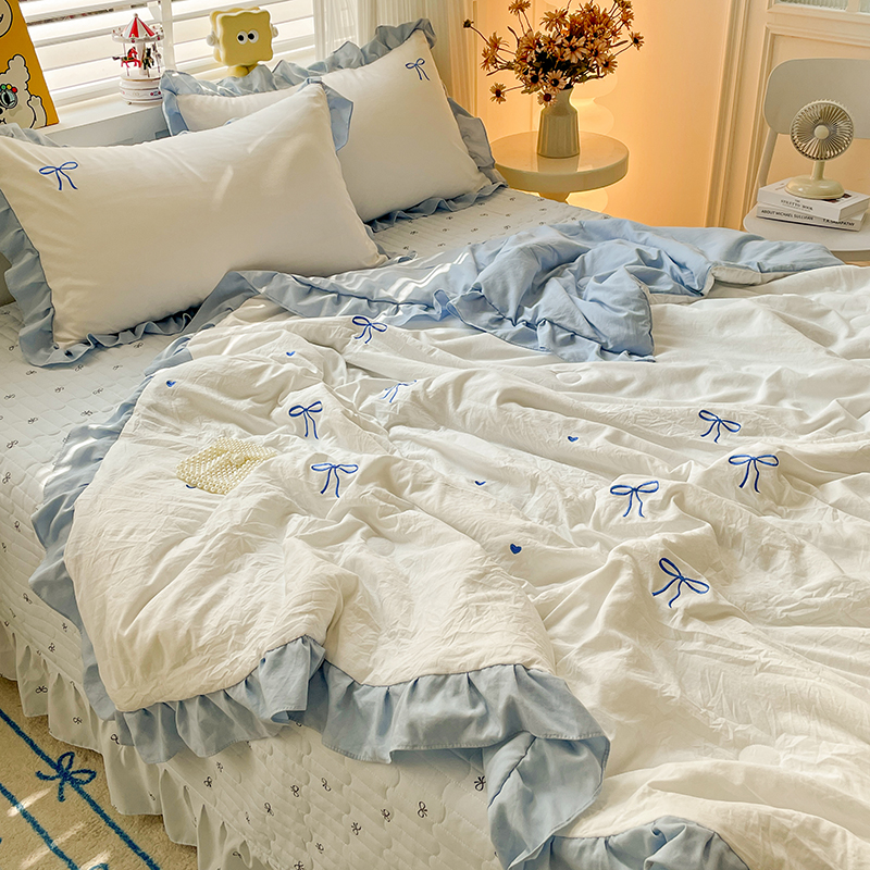 2025新款绣花双层纱针织棉夏被床盖四件套全棉夏被四件套 蝴蝶结蓝