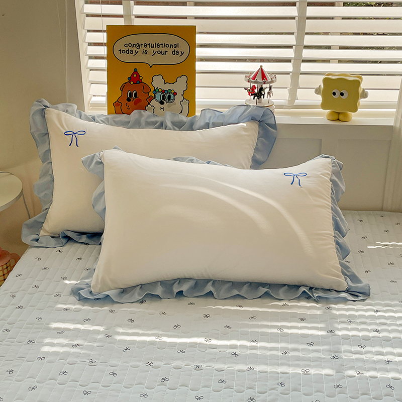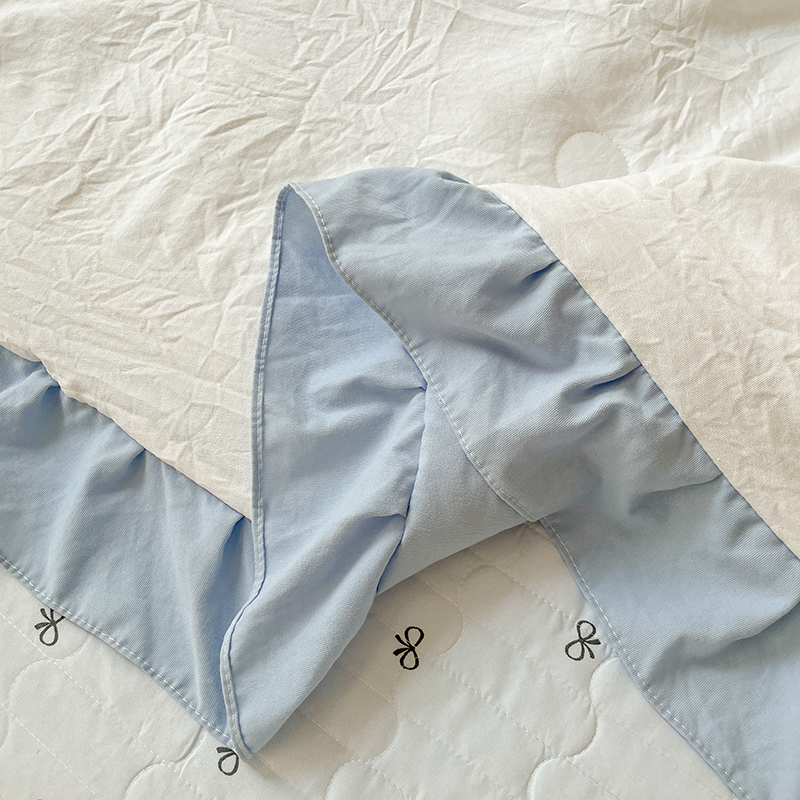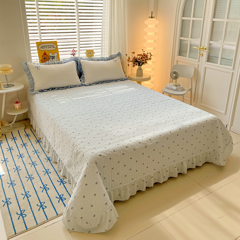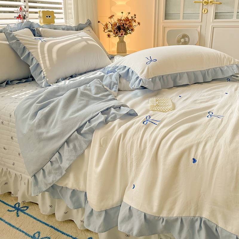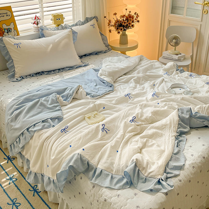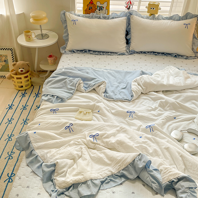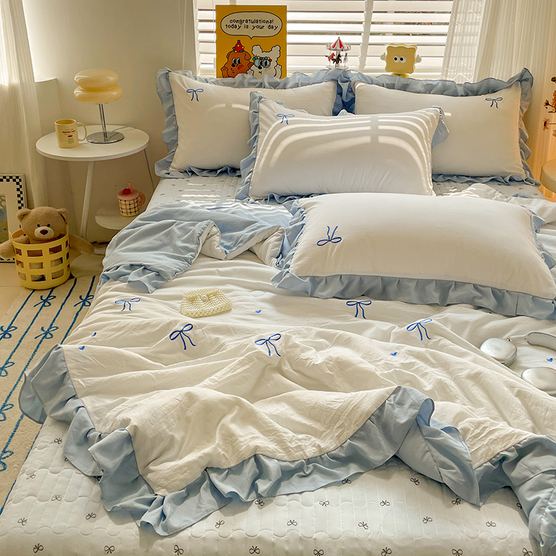 2025新款绣花双层纱针织棉夏被床盖四件套全棉夏被四件套 蝴蝶结蓝
