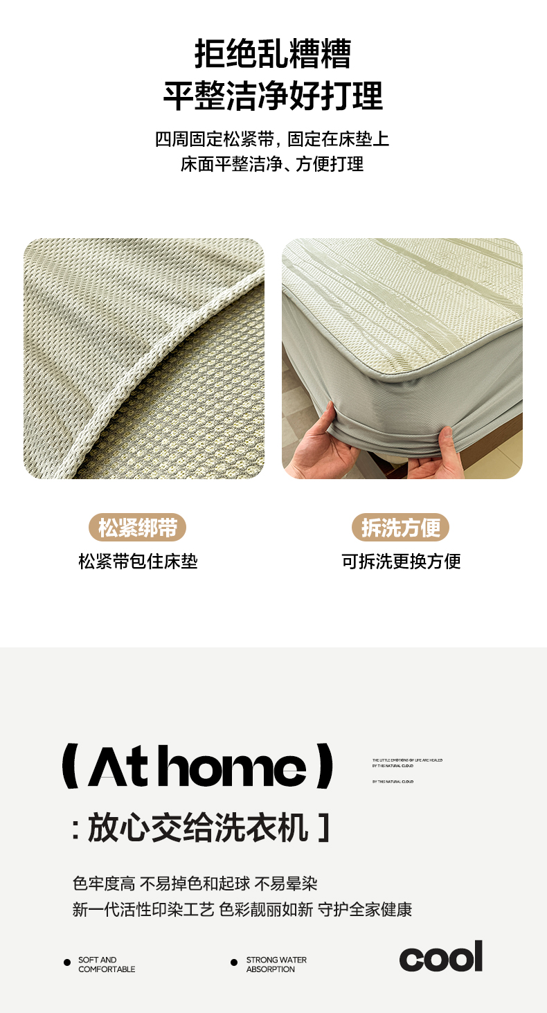 商品名称:雅居纺家纺 2025新款A类加厚三明治底简约提花凉感席系列-床笠款 线条-绿