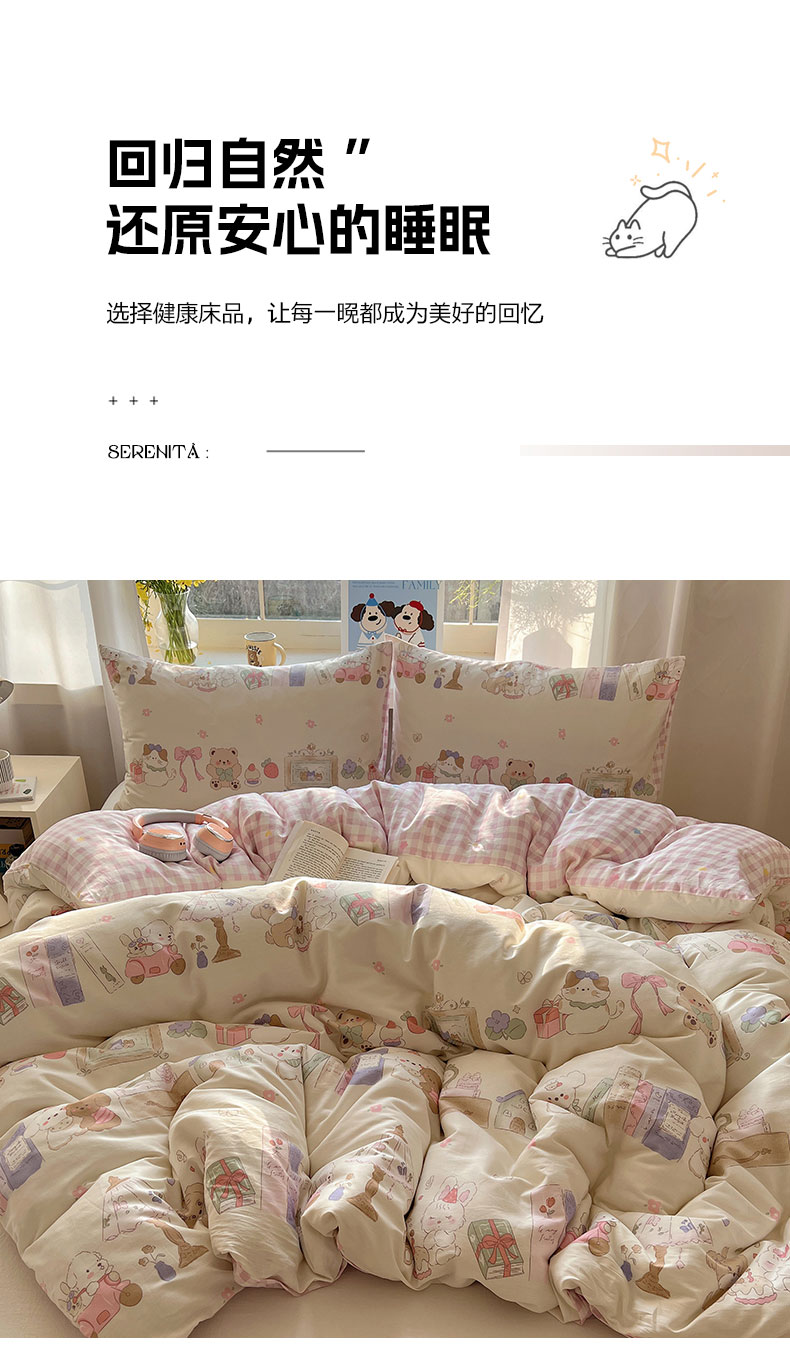 (总)六巷胡同 2025新款INS童趣可爱风卡通全棉四件套-第四系,彩虹甜筒猫,草莓害羞喵,粉格元气猫,咖格樱桃狗,蓝格嗨皮狗,圣诞麋鹿狗,仙人掌粉象,熊熊猫咪崽