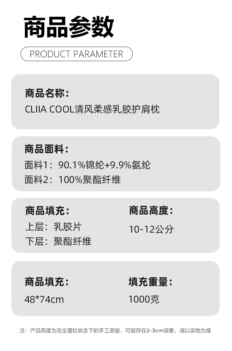 当前位置: 91家纺网 > 商品网购 > 枕头/枕芯/保健枕/颈椎枕 > 普通枕芯 > (总)麦肯锡 2025新款CLIIA COOL凉感系列 清风柔感乳胶护肩枕-产品图