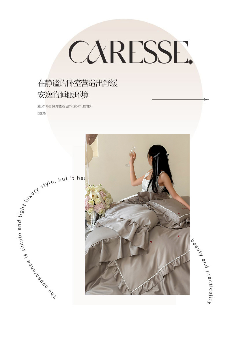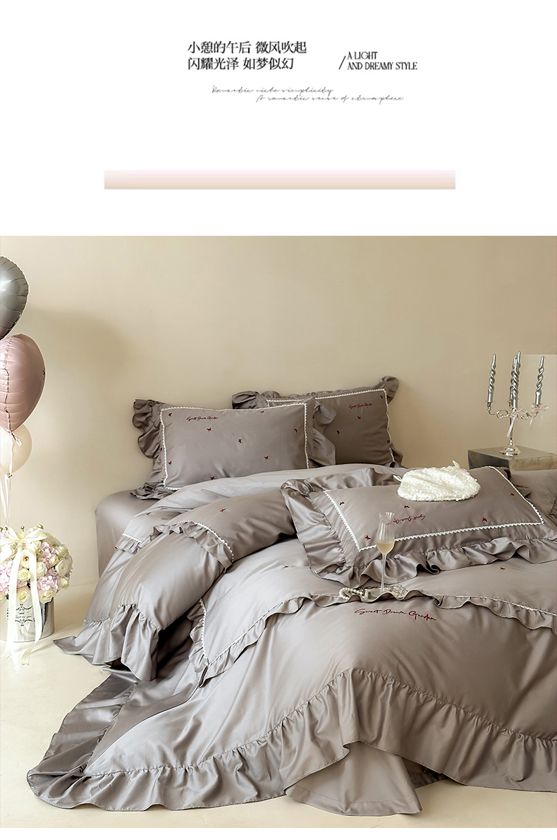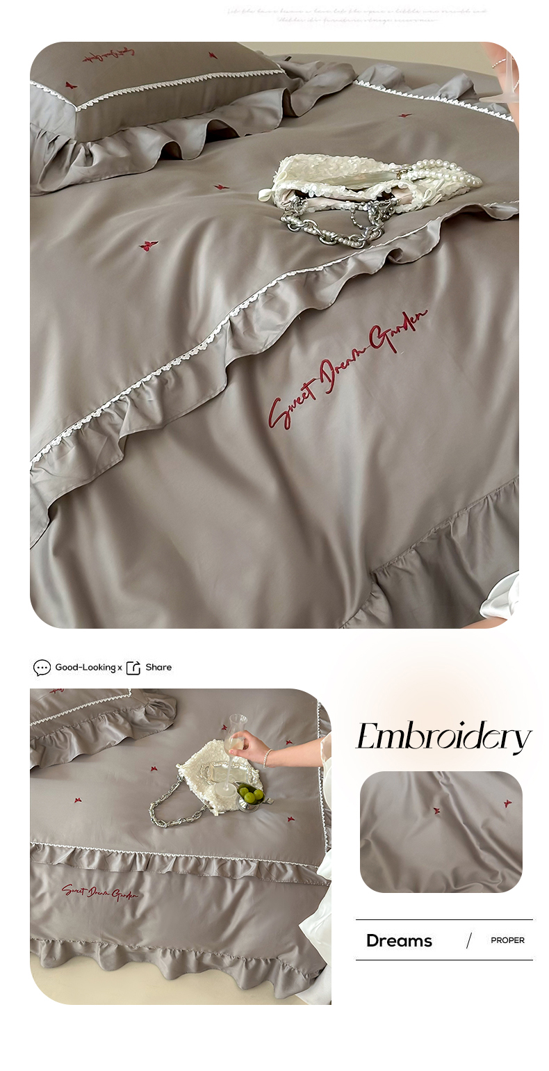 红番天家居馆 2025新款全棉纯棉贡缎长绒棉法式刺绣花边四件套-蝶梦 蝶梦-星辰灰