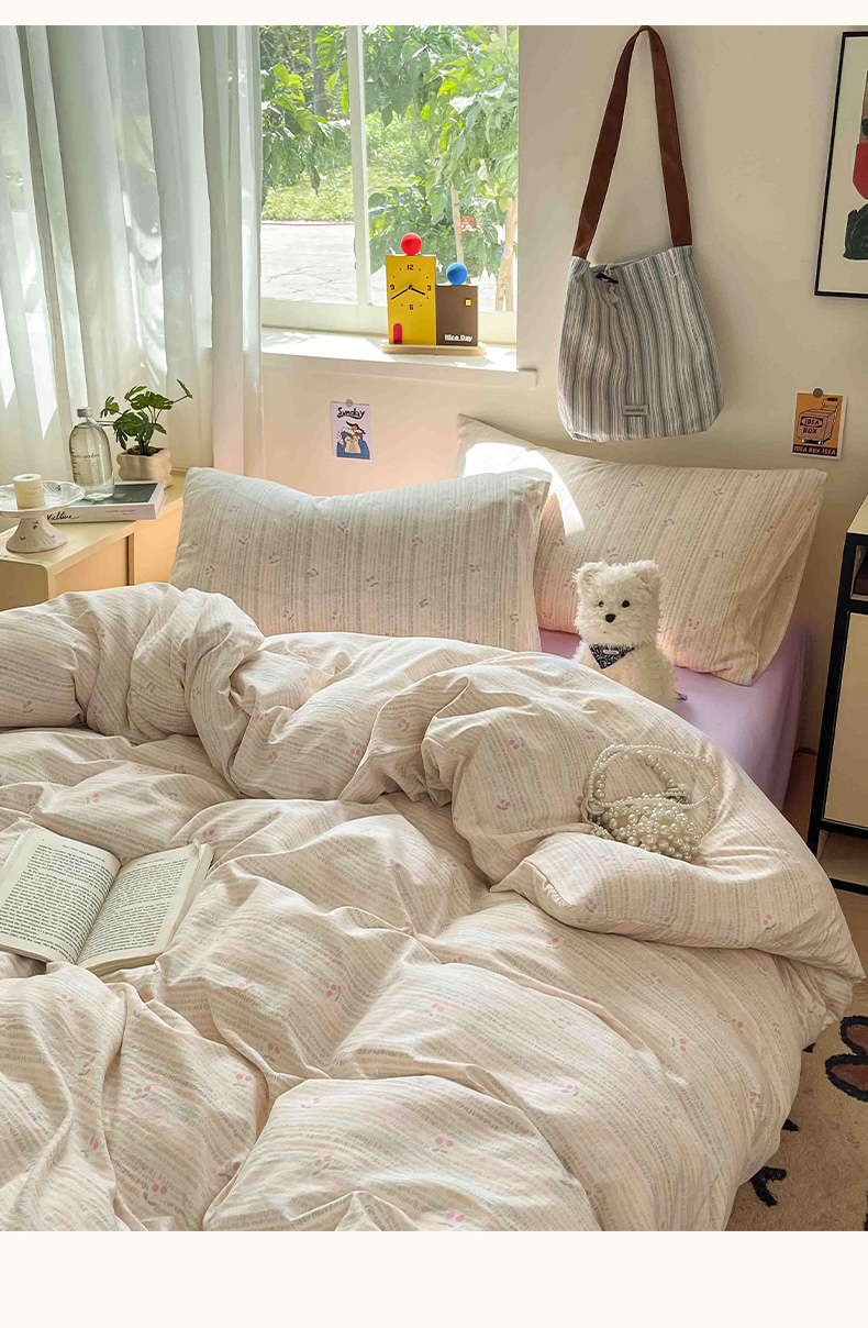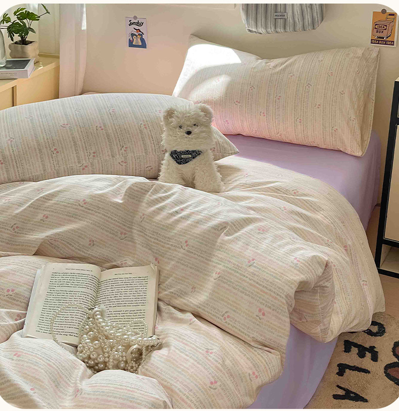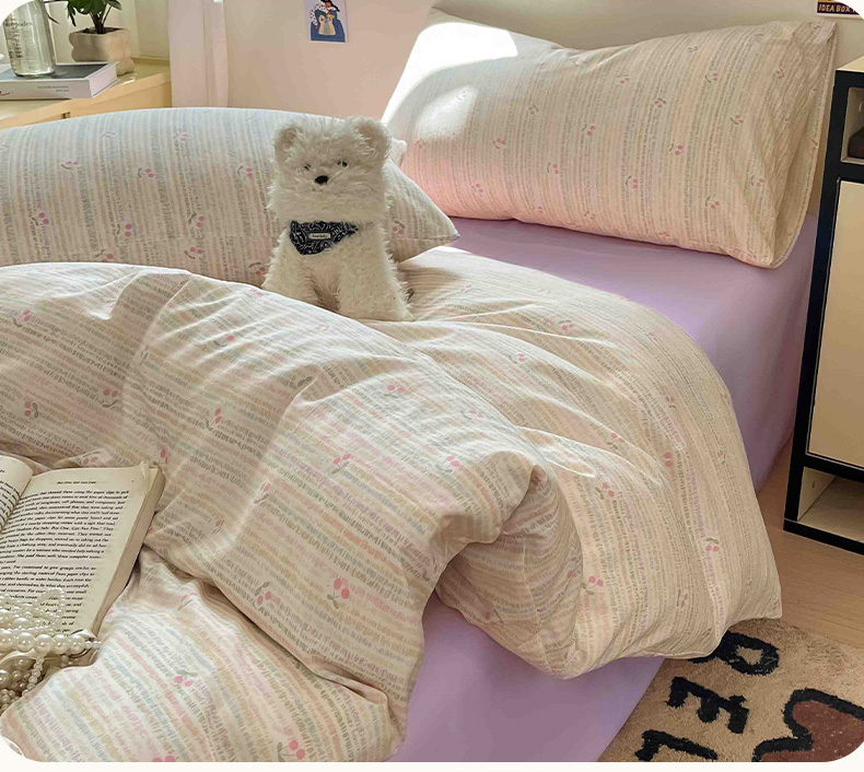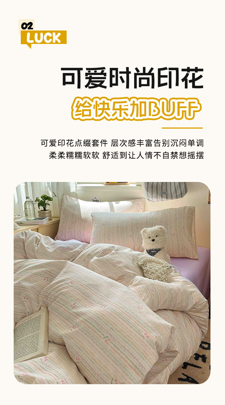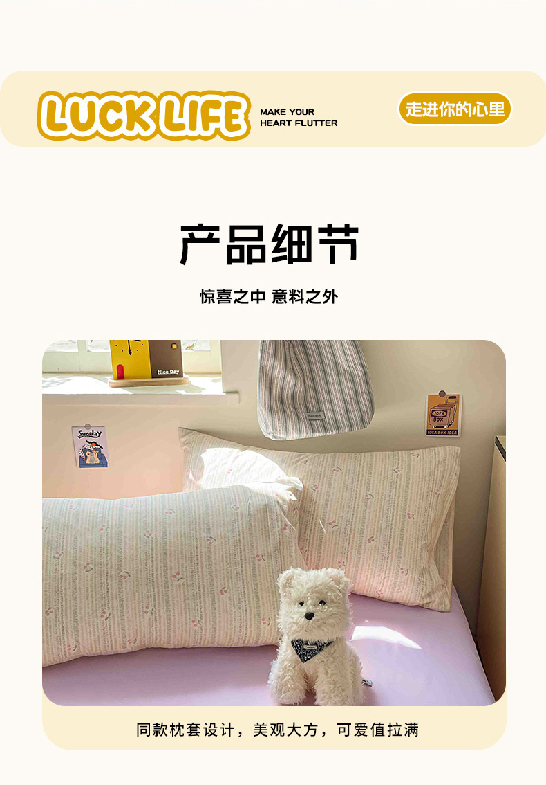 商品名称:罗亿家纺 2025新款软绵绵的双拼印花小清新水洗云朵棉四件套(含买家秀场景二) 樱桃恋曲