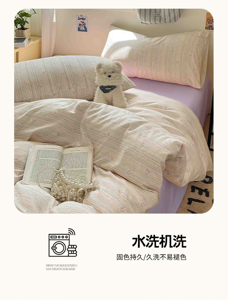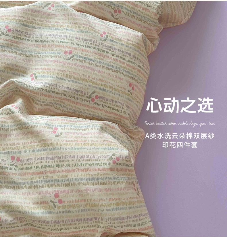 罗亿家纺 2025新款软绵绵的双拼印花小清新水洗云朵棉四件套(含买家秀场景二) 樱桃恋曲