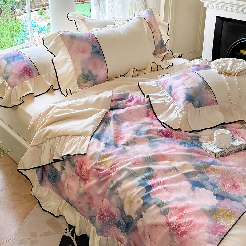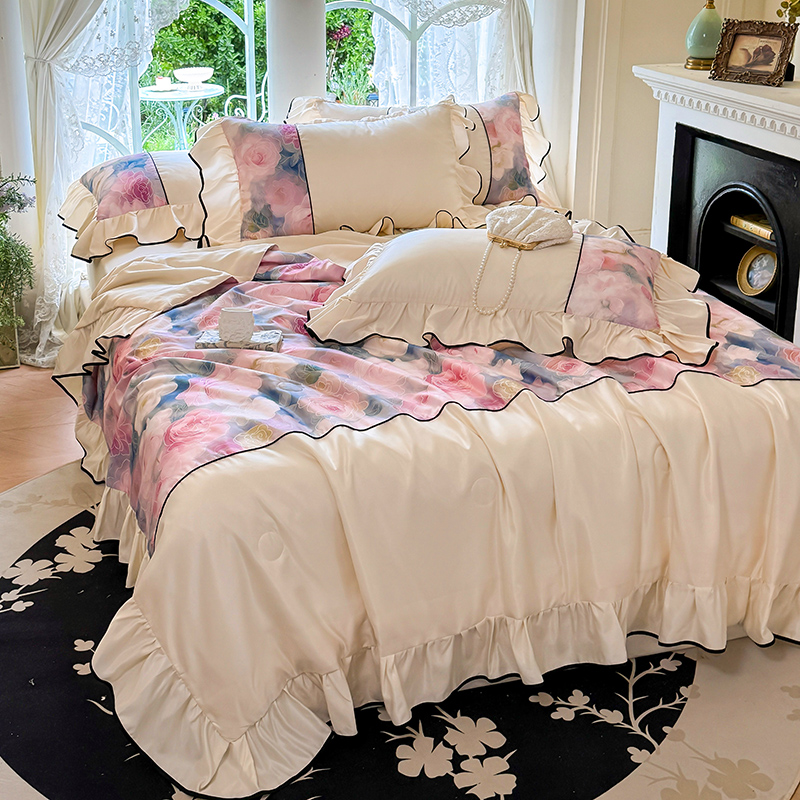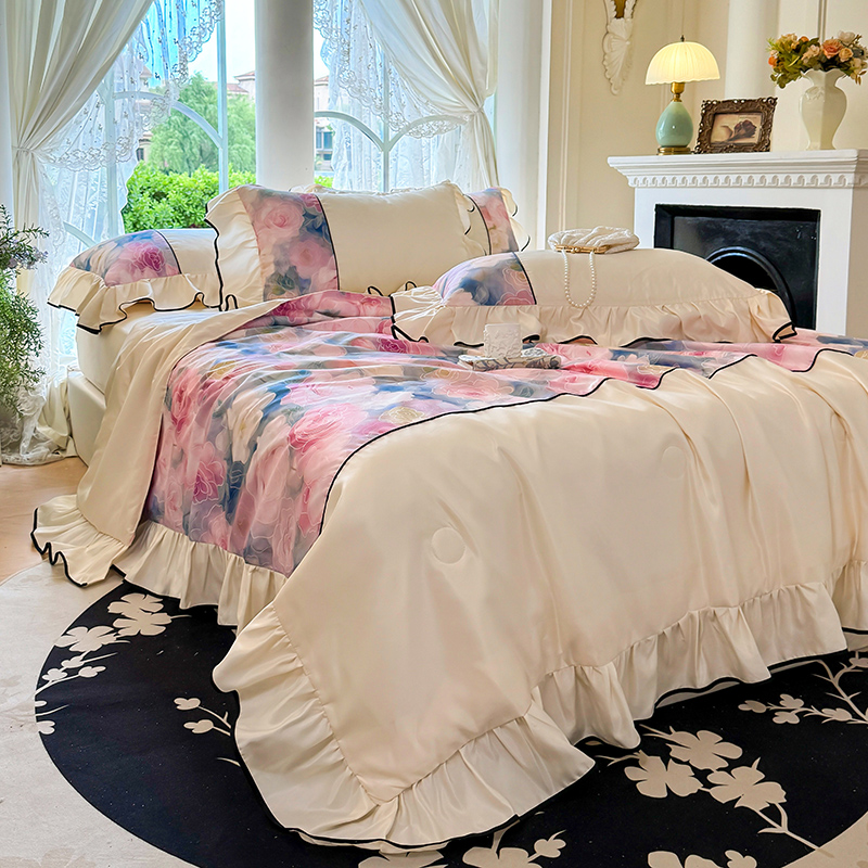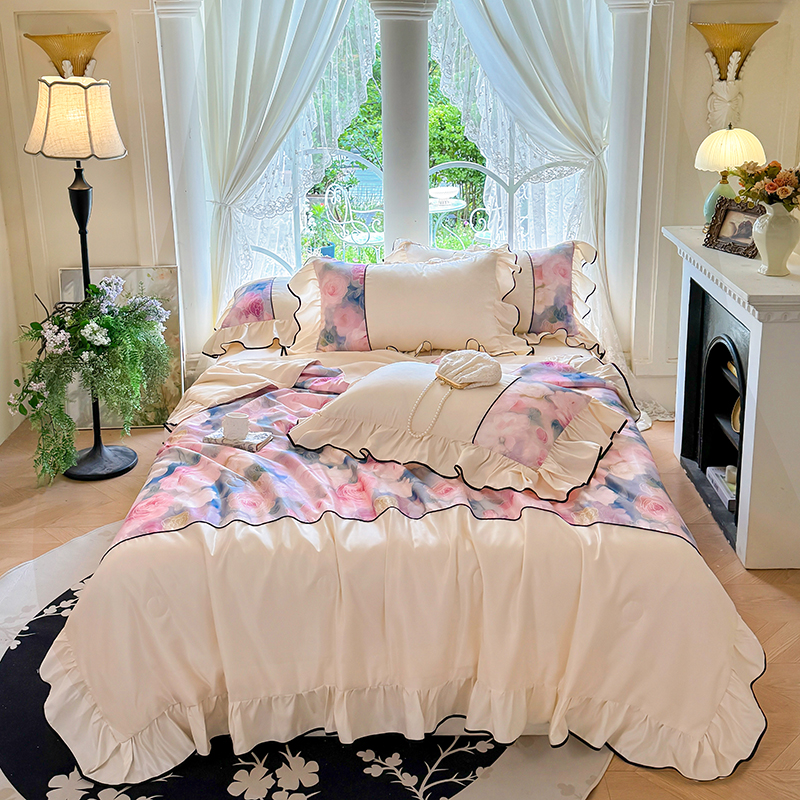宅家居 2025新款水光冰丝法式拼接数码印花奶油韩式花边款夏被四件套 暖暖花香
