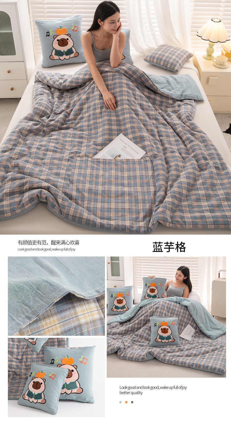 商品名称:吉利家居 2025新款全棉色织水洗抱枕被-卡皮巴拉 控价小号65 大号92 组合图仅做展示