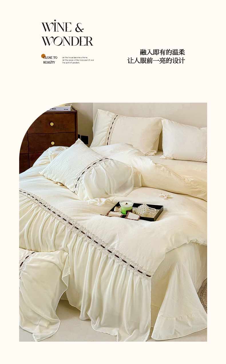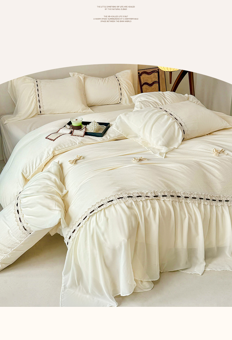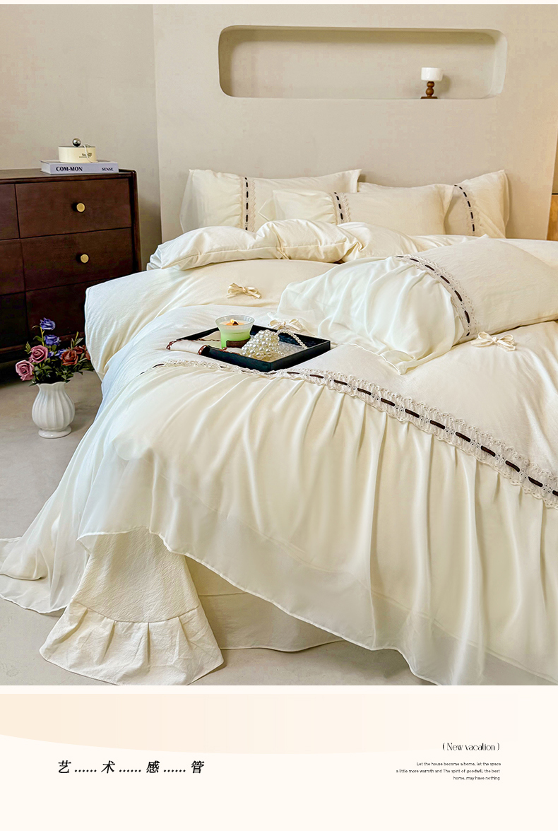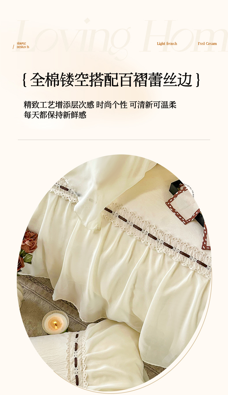 商品名称:庭笙 2025新款法式少女全棉镂空花边仙女梦幻纱蕾丝边四件套-清甜少女 清甜少女-米白
