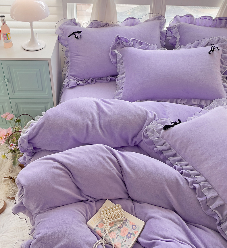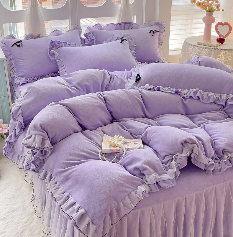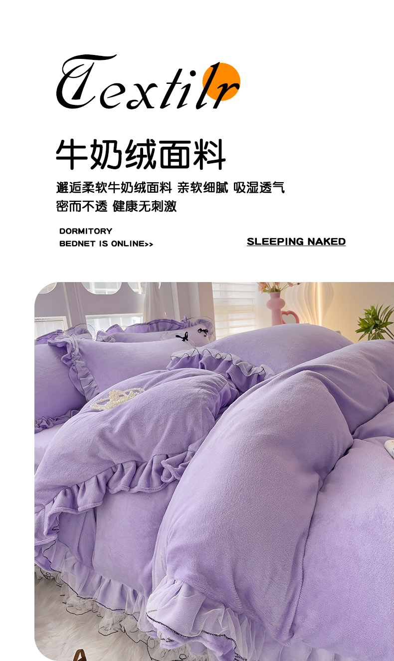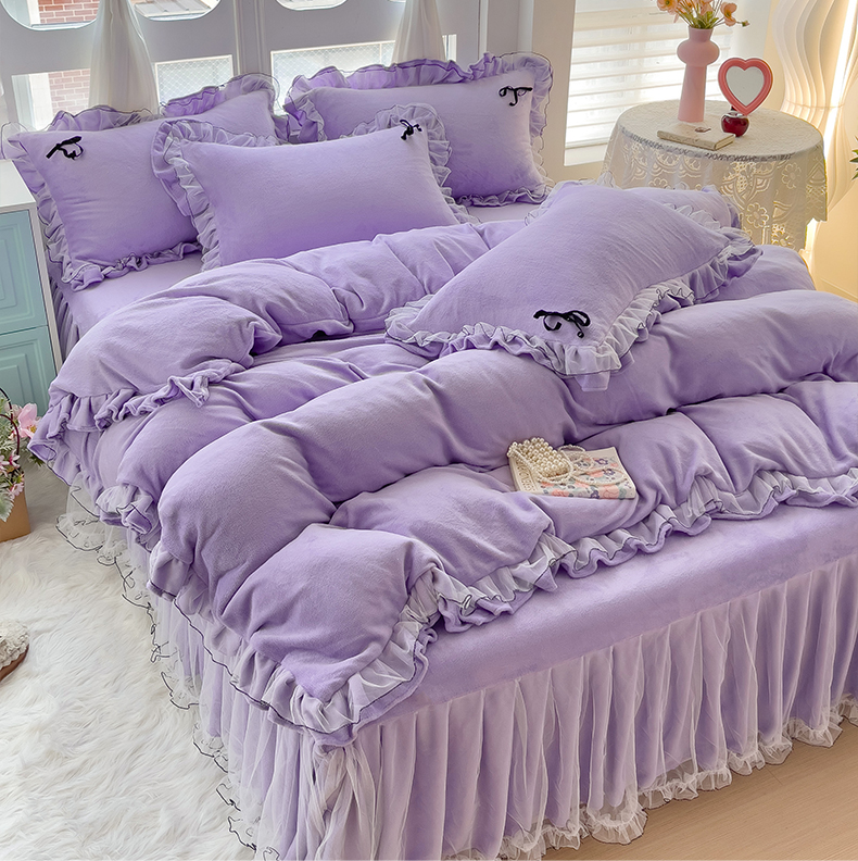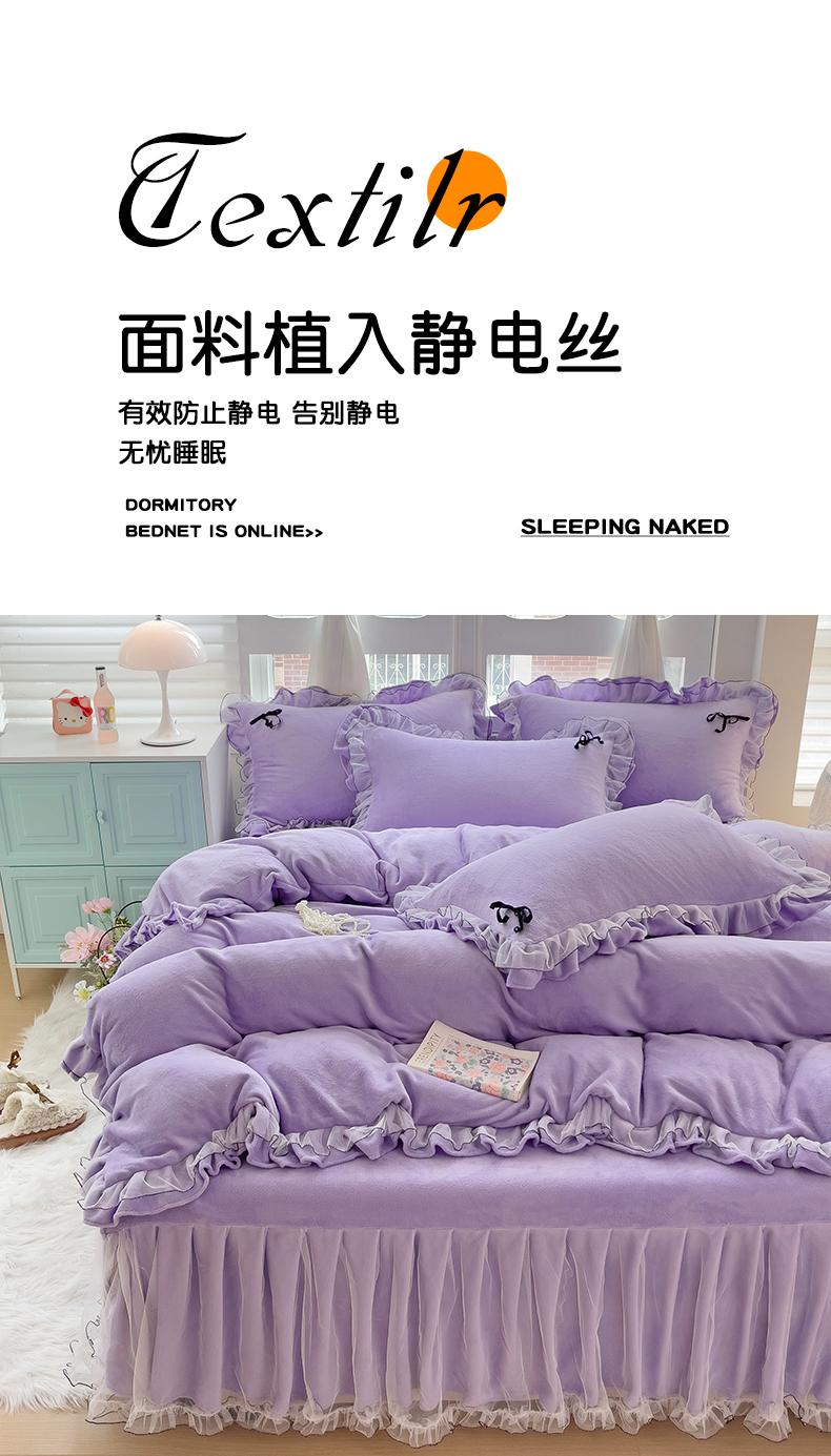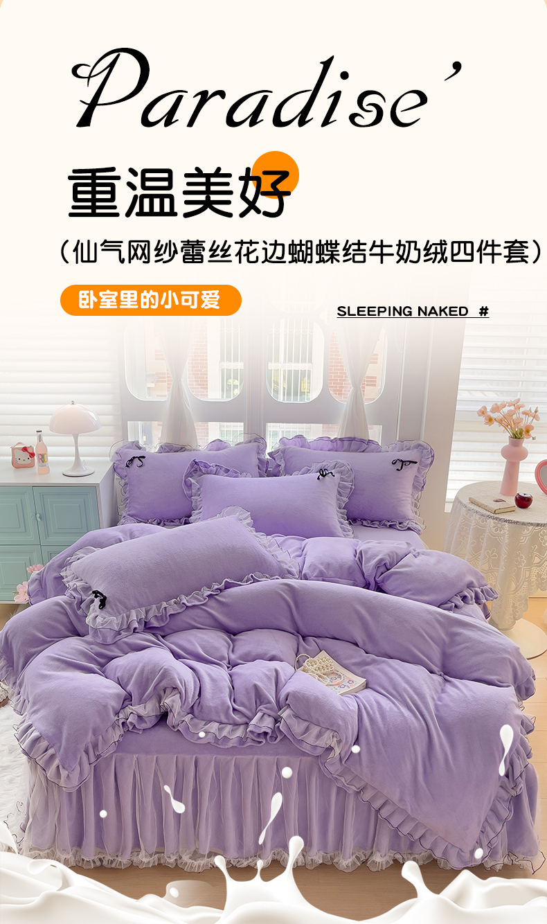 言熙居家纺 2025新款仙气网纱蕾丝花边蝴蝶结牛奶绒四件套 仙女紫
