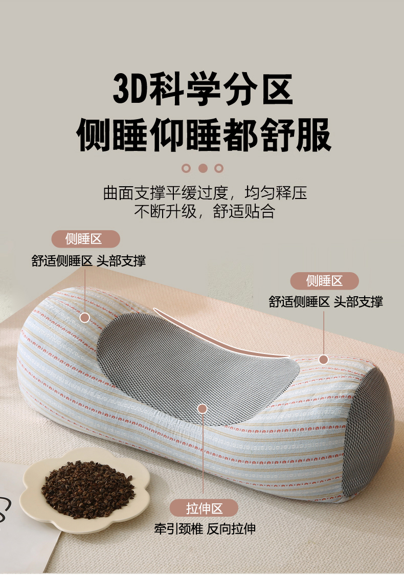 商品名称:金牛枕芯 2025新款全棉3d条纹荞麦枕头枕芯圆柱护颈枕 灰色