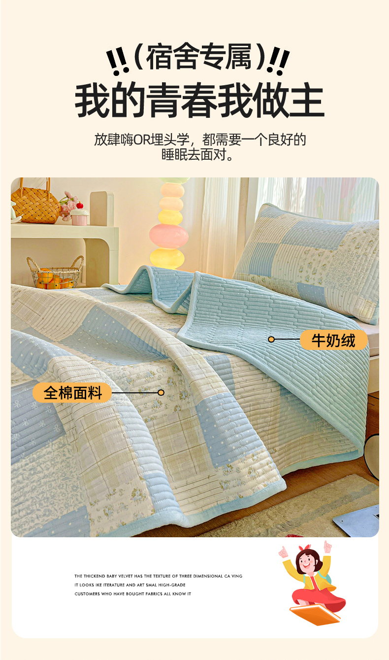 恒尚居 2025新款学生床盖纯棉牛奶绒 正反两用夹棉床单床垫-秋冬款 四季通用-系列二 芳菲-蓝【A纯棉-B宝宝绒】