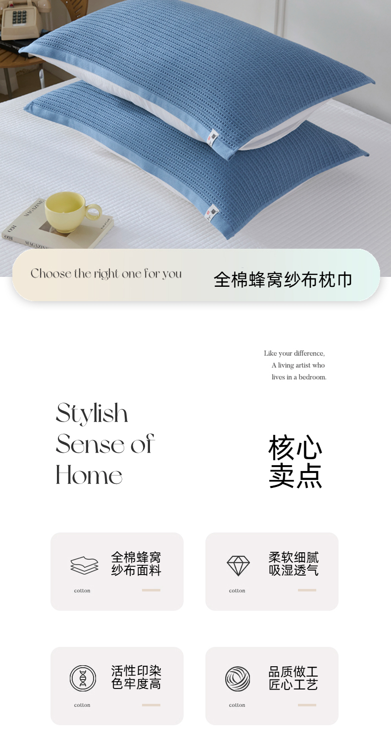 • 91家纺网 家纺一手货源 找家纺 悦然毛巾被 2025新款全棉纯棉蜂窝棉语单枕巾 枕巾单件 蜂窝棉语宝蓝 52x78cm枕巾一只